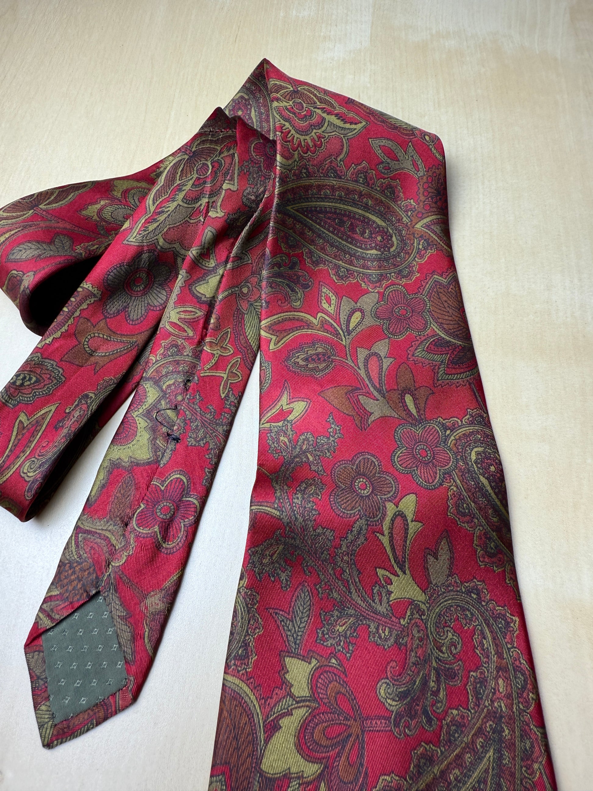 Cravatta anni ‘80 in pura seta con bella fantasia paisley color cachi su fondo rosso.