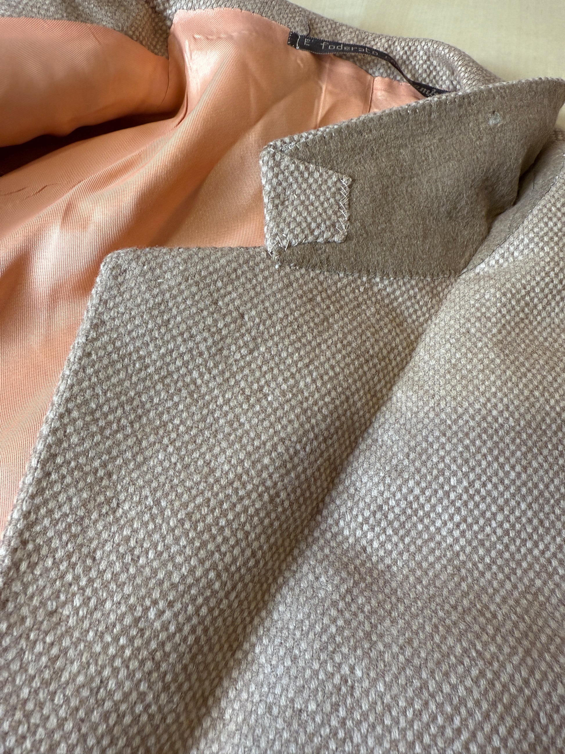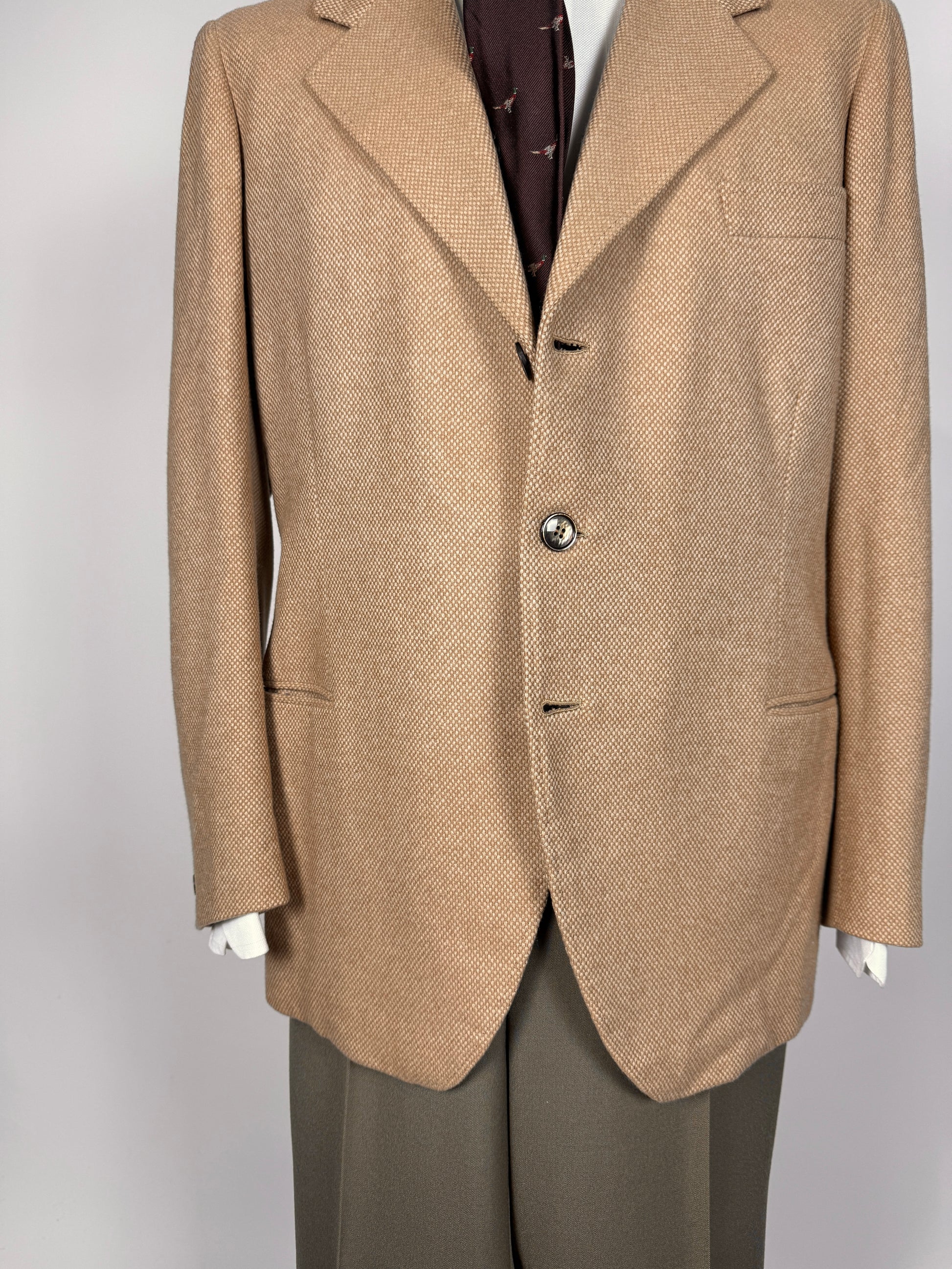 Giacca di confezione semi sartoriale anni '60 (Chiericato Bologna), in un bel panno di lana con lavorazione intrecciata effetto occhio di pernice. Colore beige/cammello.