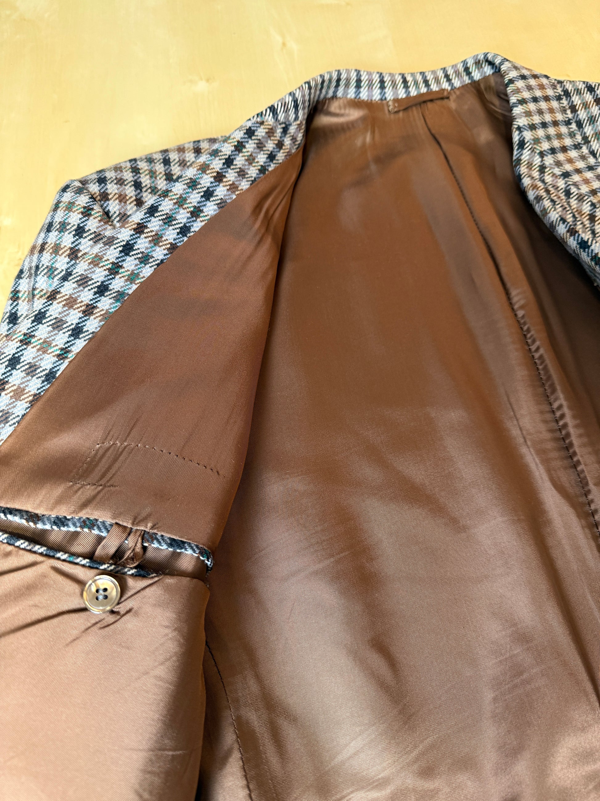 Giacca di confezione anni '70/'80, 100% lana peso medio invernale con bella fantasia check/gingham dalla grandissima ricchezza cromatica: blu navy, azzurro, verde, marrone, nocciola e lilla su base panna.