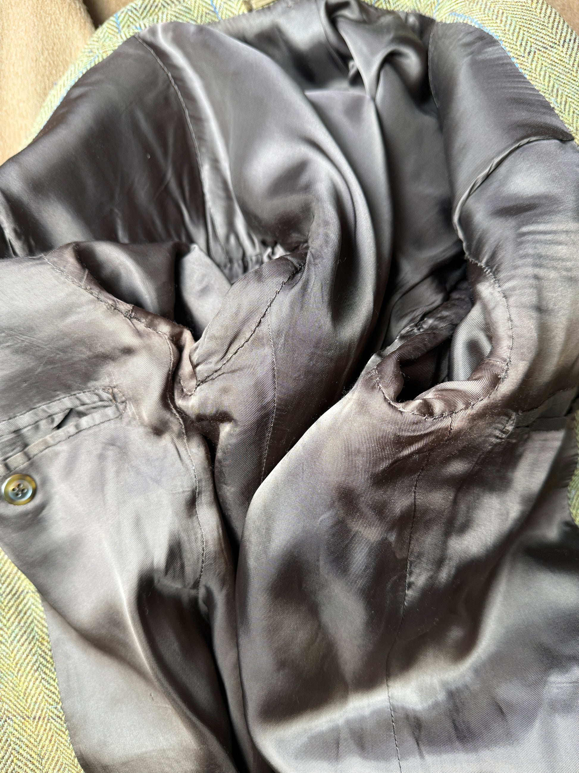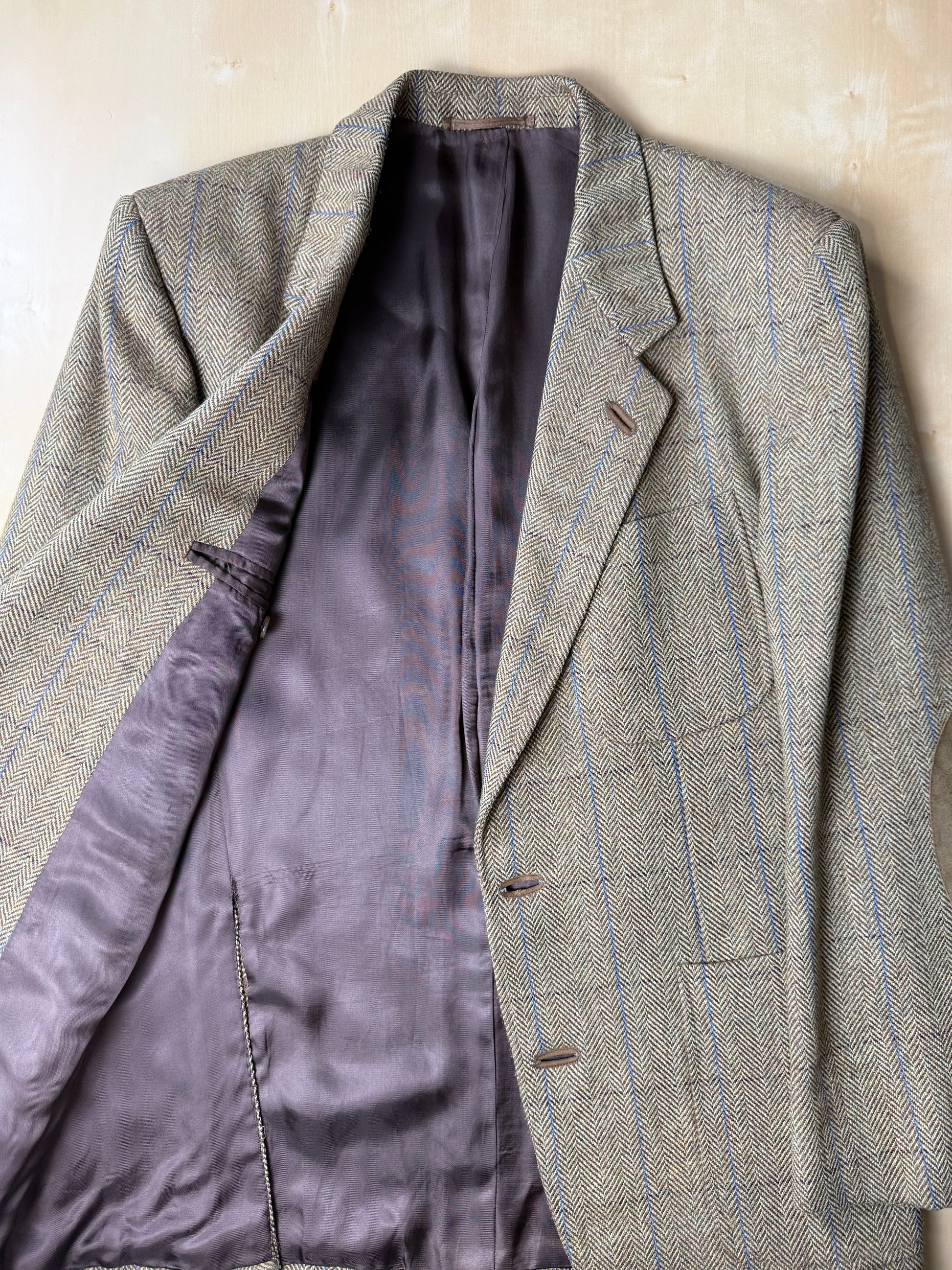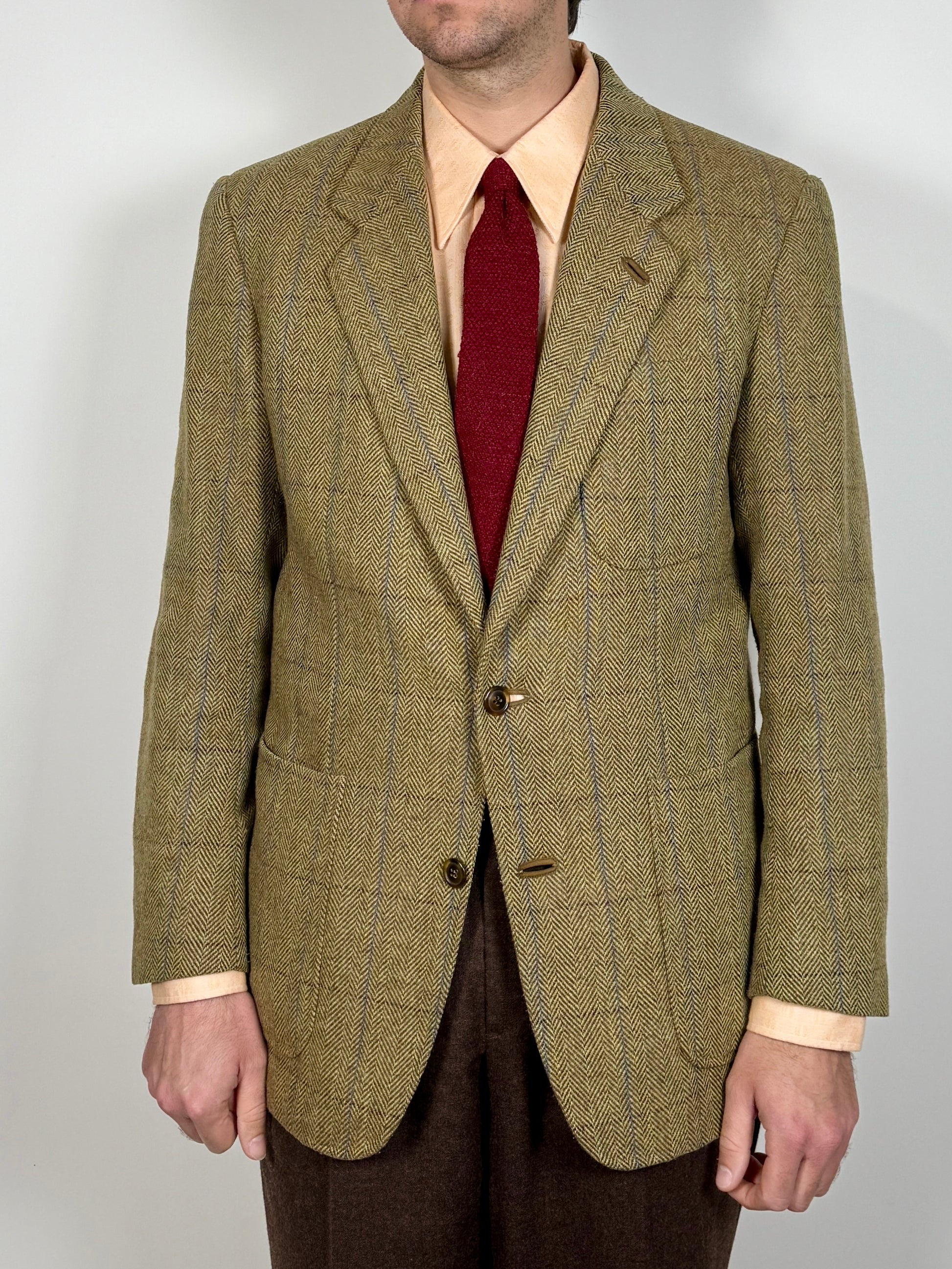 Giacca di confezione anni ‘70 in un bel tweed 100% lana, sfumatura di verde e cachi con fantasia finestrata in blu.