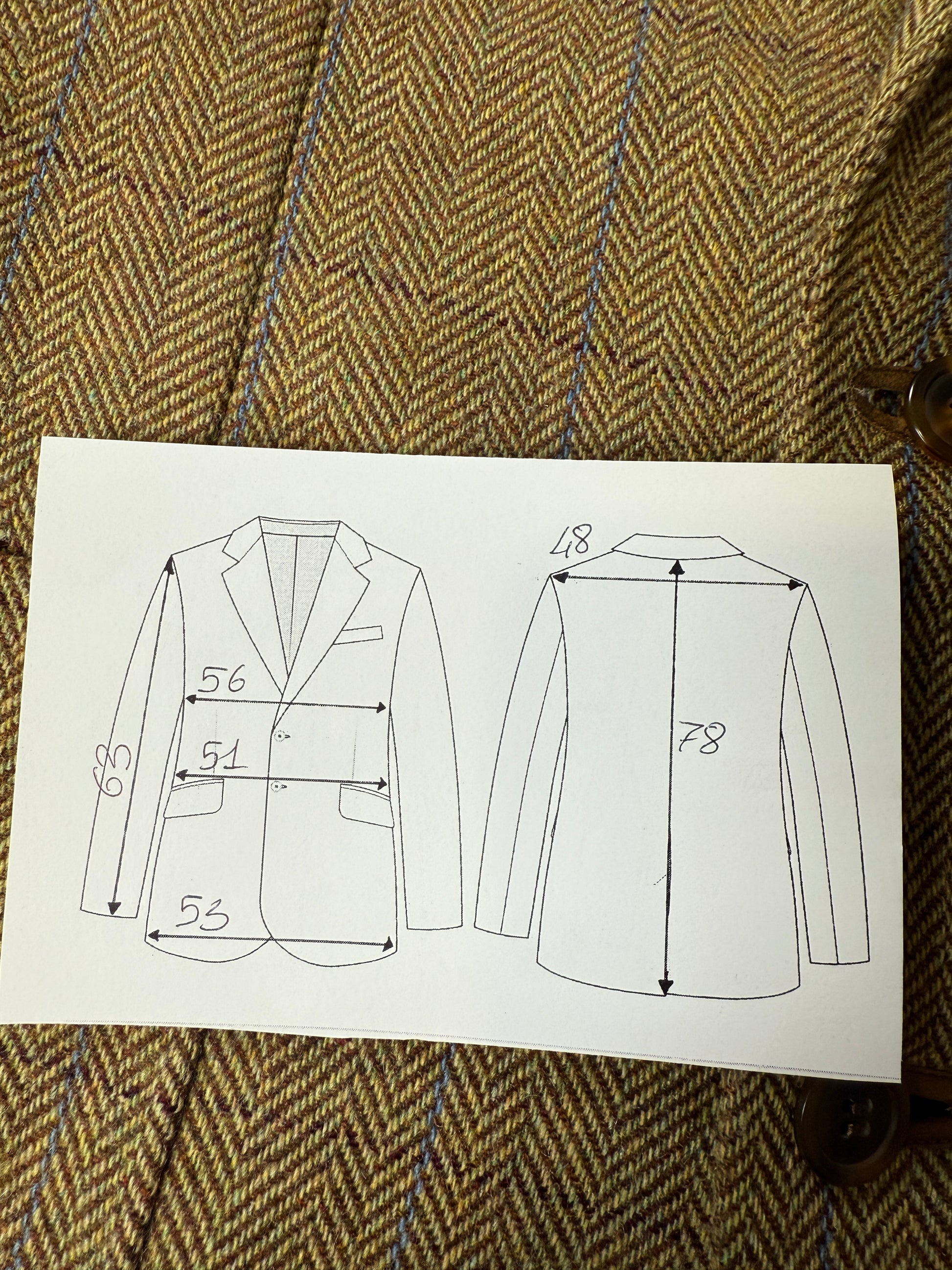 🔎Esempio pratico: la giacca usata come modello in questa guida (v. foto) ha una misura torace di 54 cm. Si tratta della giacca di un abito anni '90 dal taglio generale abbastanza morbido; inoltre, l'abito è un 3 pezzi e va quindi considerato un po' più di margine di vestibilità della giacca per poter indossare comodamente il gilet. Perciò, come da nostra prassi enunciata sopra consideriamo un margine di vestibilità di 6-7 cm: la taglia della giacca sarà quindi 54-6 o 7 = 47 o 48, che corrisponde a una tg. 46/48.