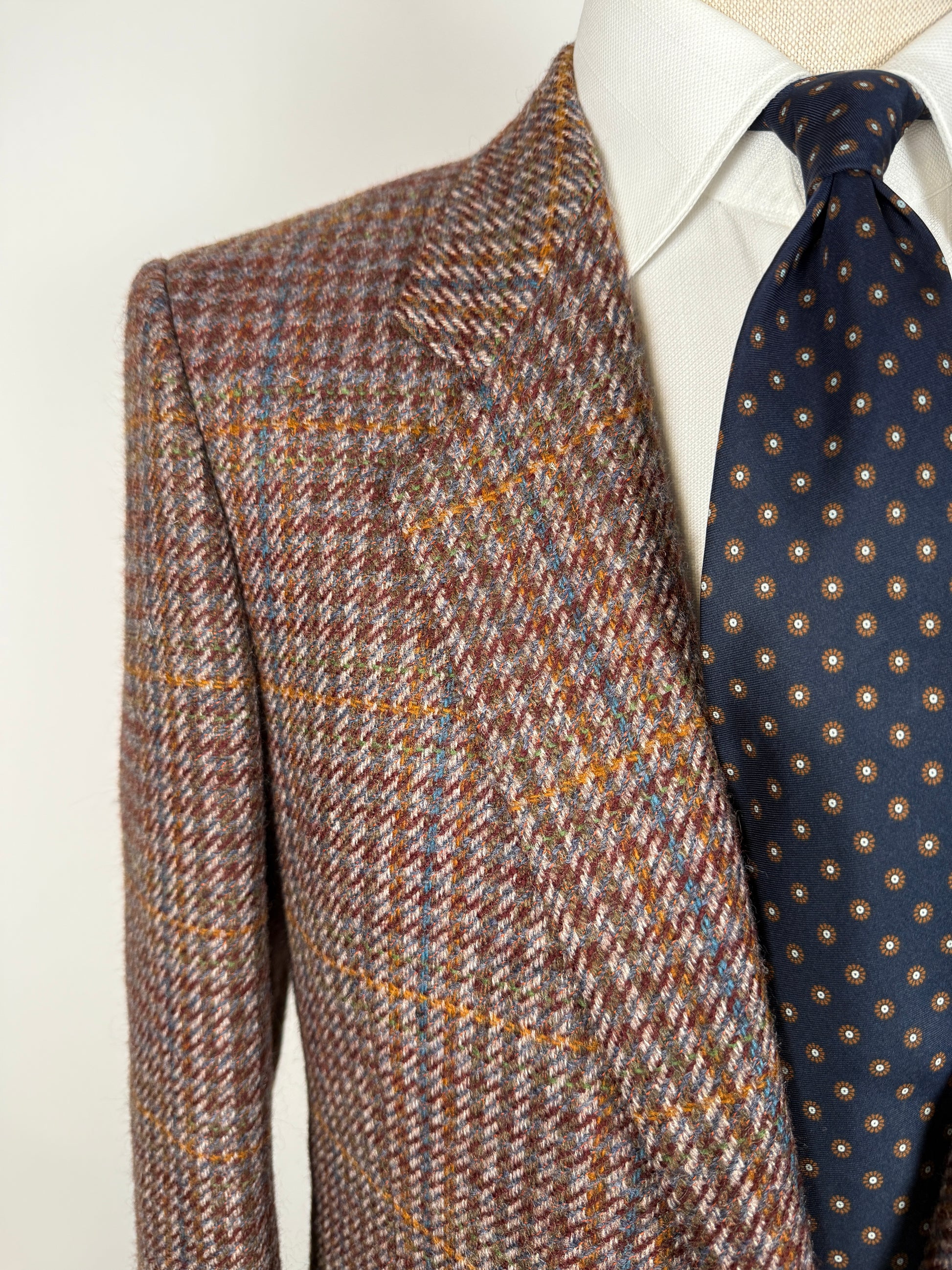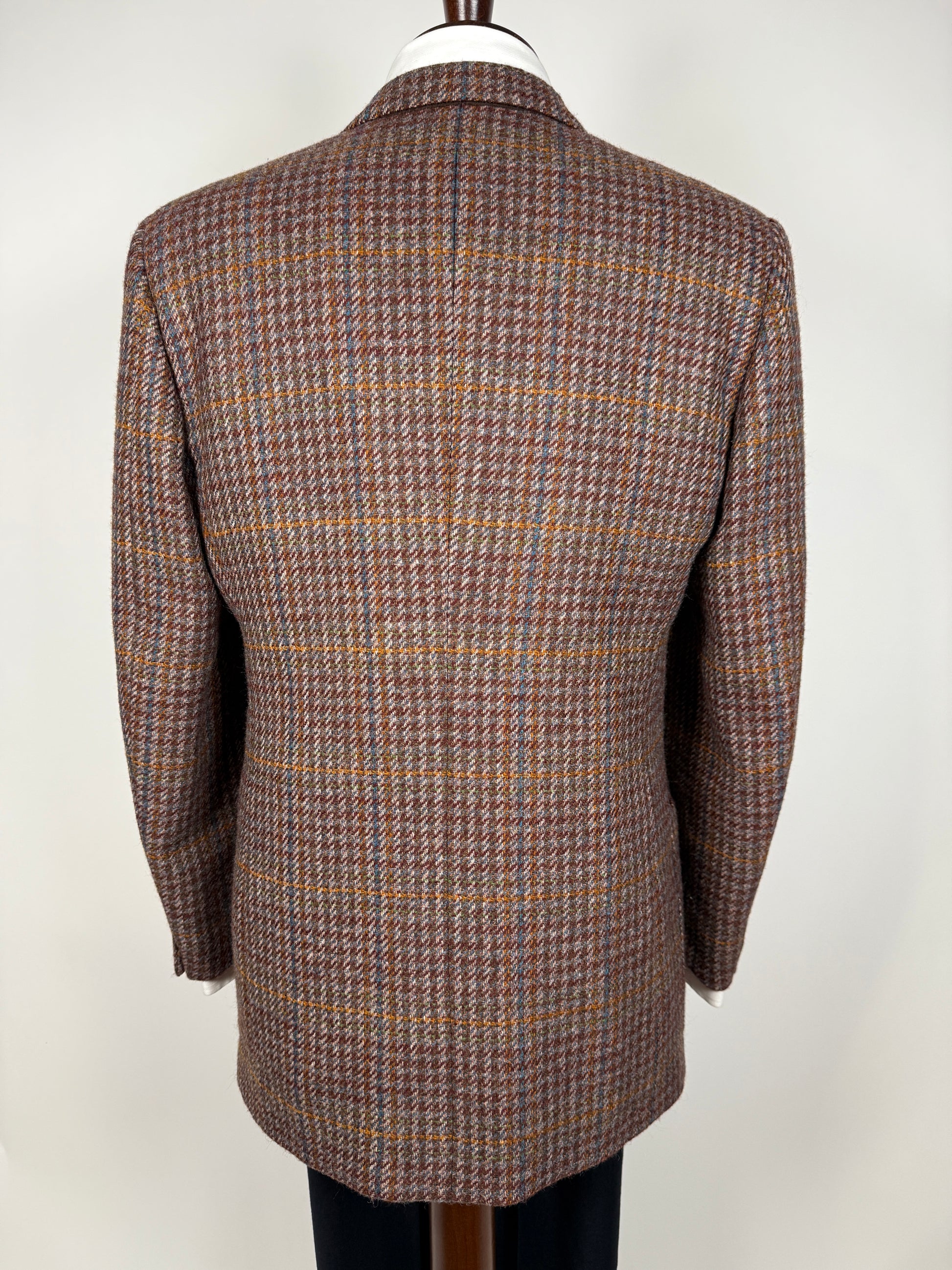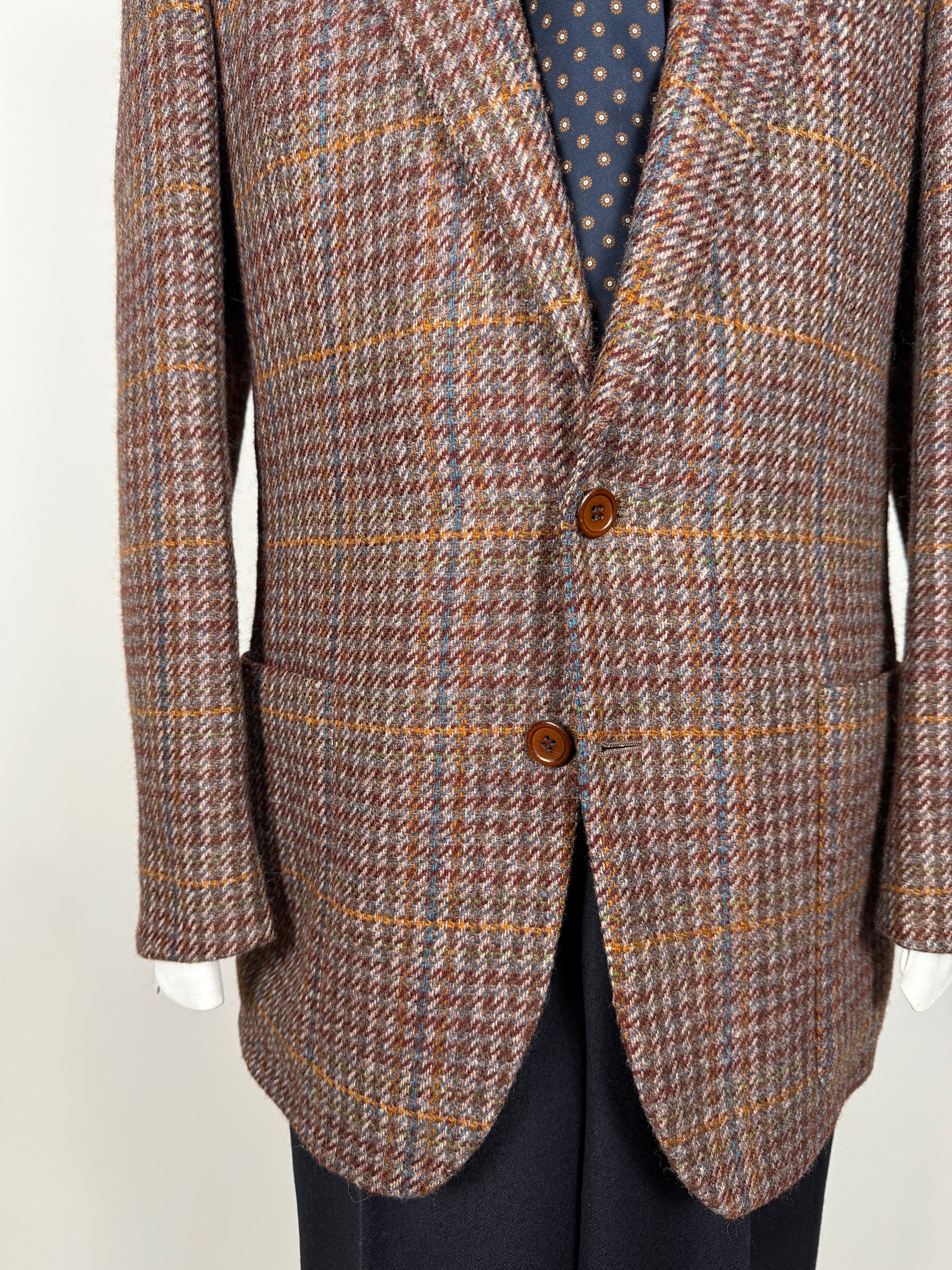 Giacca di ottima confezione anni ‘80, realizzata con uno stupendo Harris Tweed fantasia tipo shepherd’s check dalla ricchissima composizione cromatica: a un pied-de-poule sui toni ruggine, marrone, cachi si sovrappone una doppia fantasia finestrata a righe arancione e azzurro.