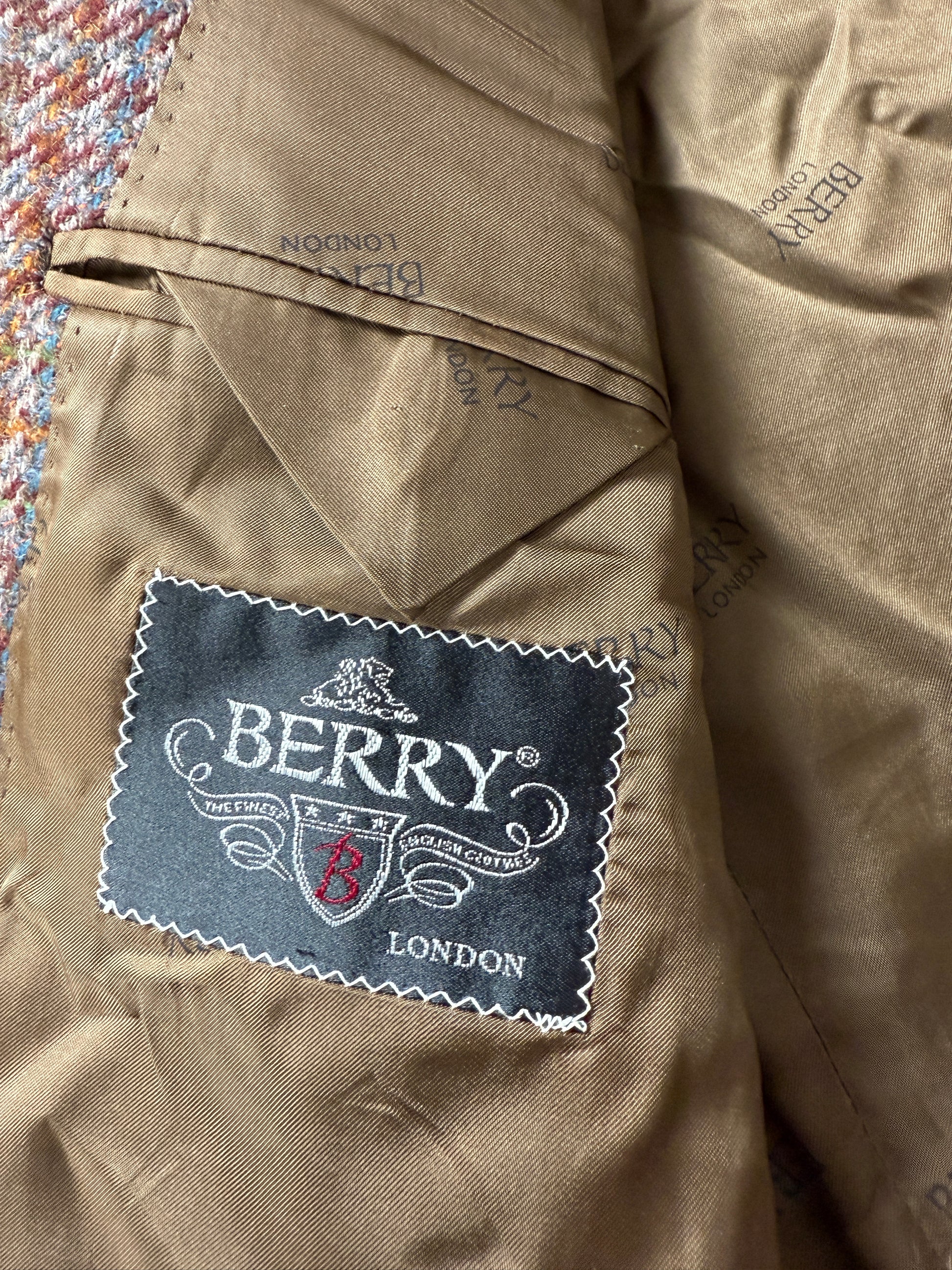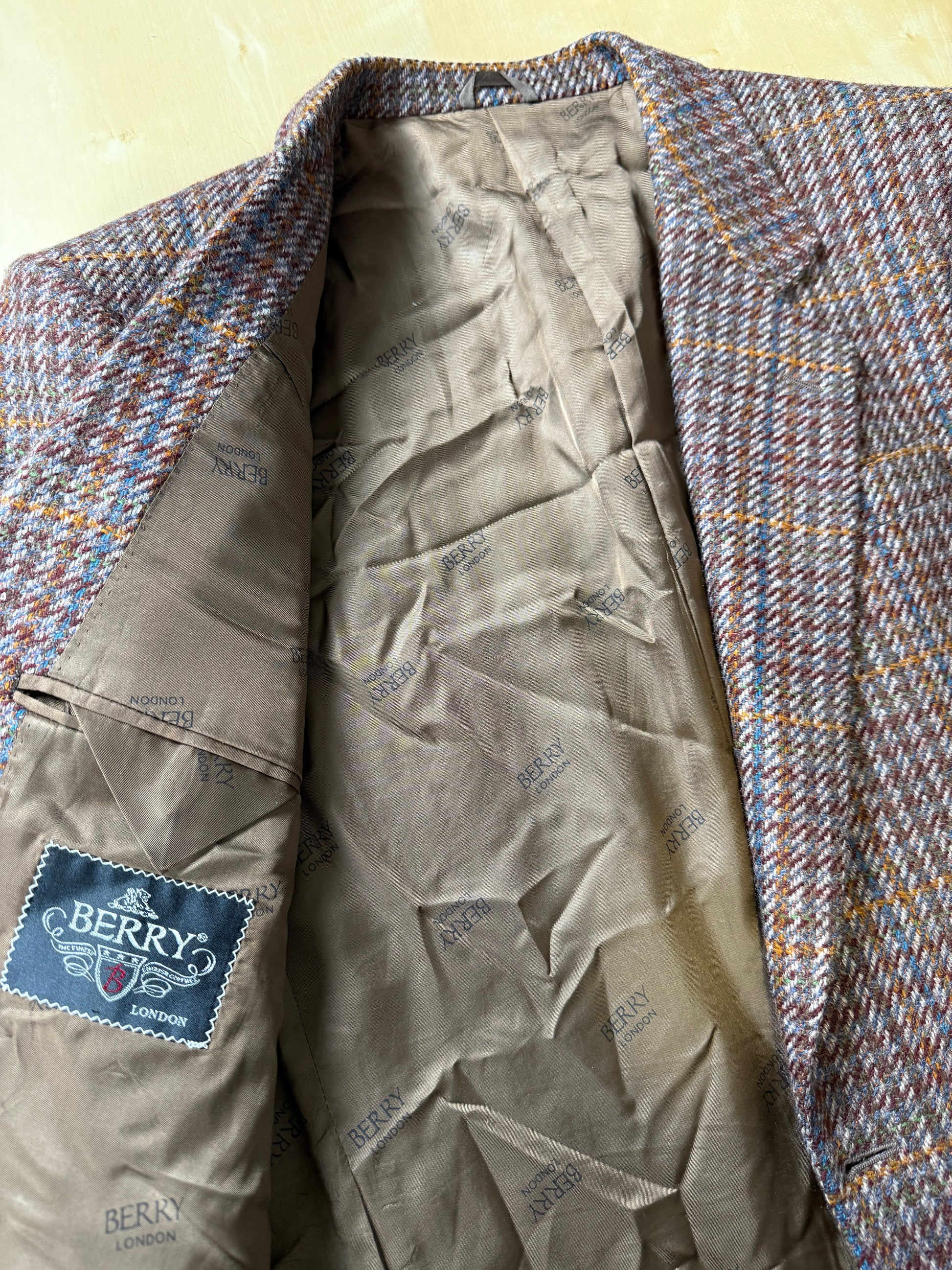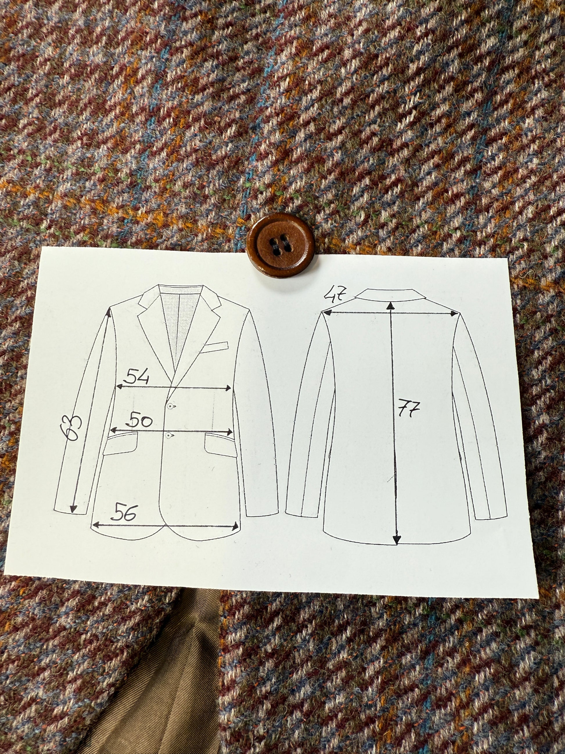 Giacca di ottima confezione anni ‘80, realizzata con uno stupendo Harris Tweed fantasia tipo shepherd’s check dalla ricchissima composizione cromatica: a un pied-de-poule sui toni ruggine, marrone, cachi si sovrappone una doppia fantasia finestrata a righe arancione e azzurro.