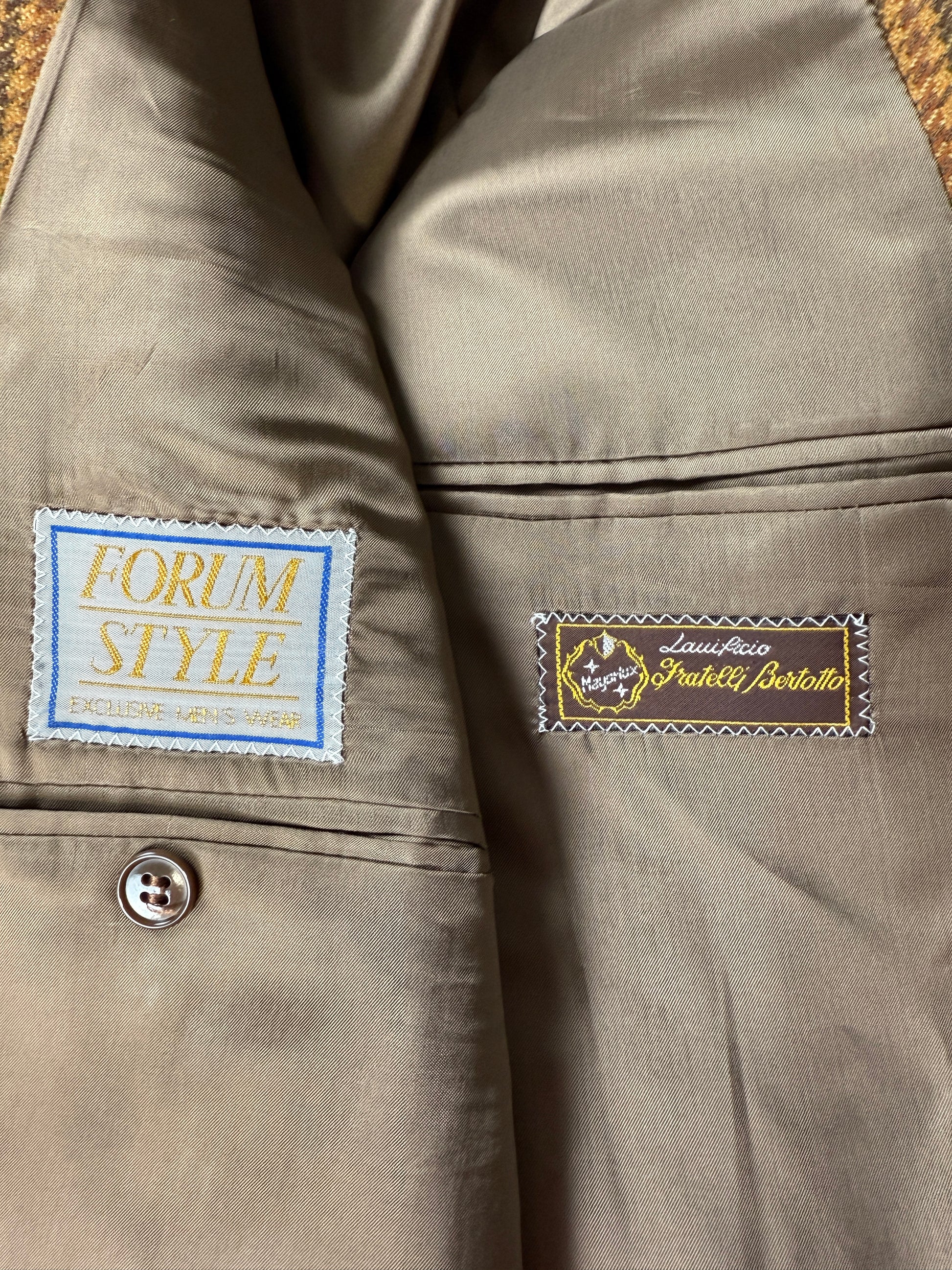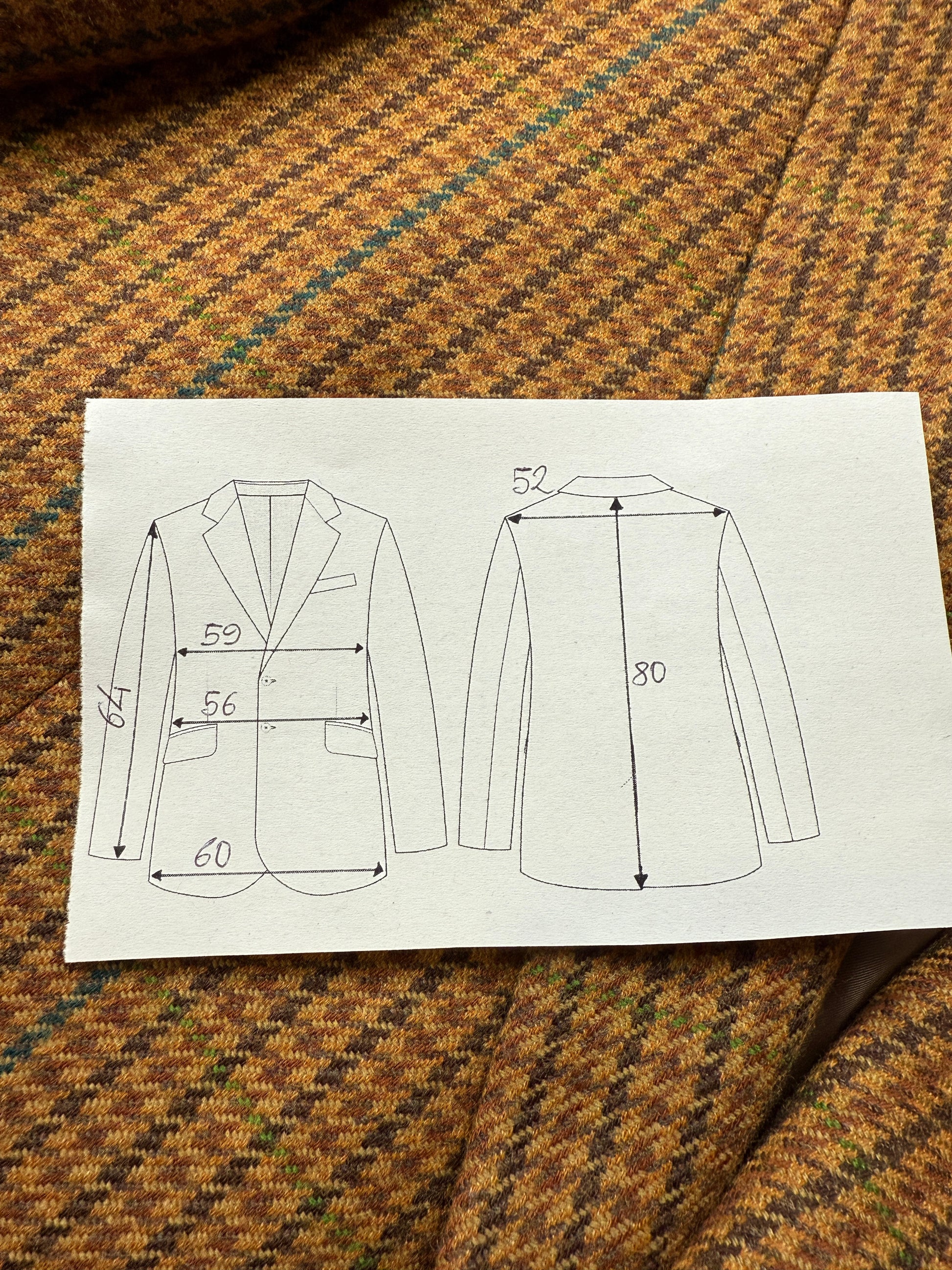 🔎Esempio pratico: la giacca usata come modello in questa guida (v. foto) ha una misura torace di 54 cm. Si tratta della giacca di un abito anni '90 dal taglio generale abbastanza morbido; inoltre, l'abito è un 3 pezzi e va quindi considerato un po' più di margine di vestibilità della giacca per poter indossare comodamente il gilet. Perciò, come da nostra prassi enunciata sopra consideriamo un margine di vestibilità di 6-7 cm: la taglia della giacca sarà quindi 54-6 o 7 = 47 o 48, che corrisponde a una tg. 46/48.