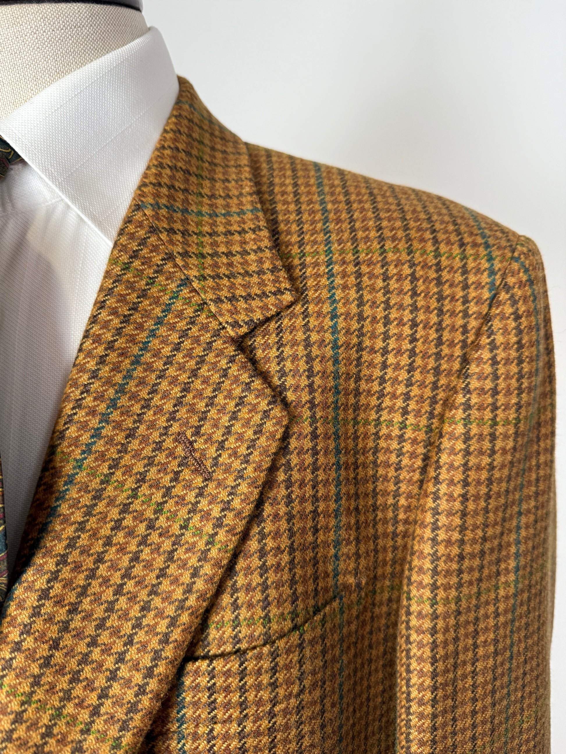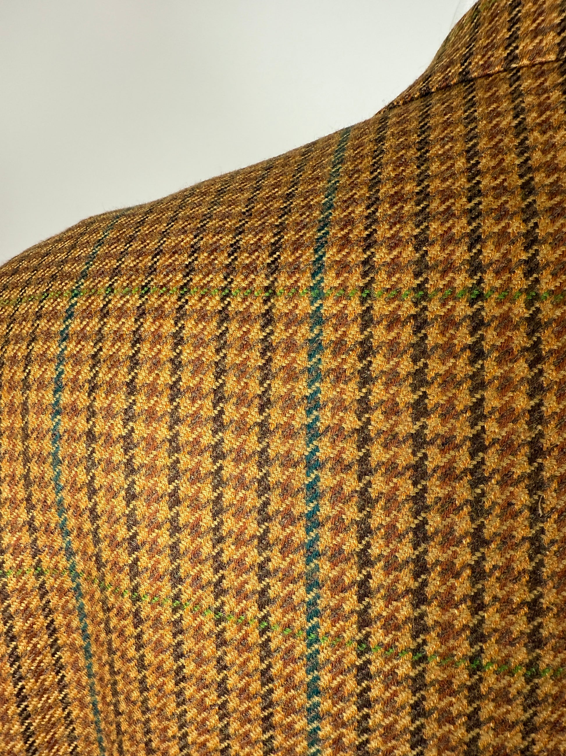 Giacca degli anni '80 in un bellissimo tessuto dalla calda fantasia houndstooth sulle tinte autunnali del senape, ocra, marrone. Pura lana con un 5% di cashmere che dona un po' di morbidezza in più.