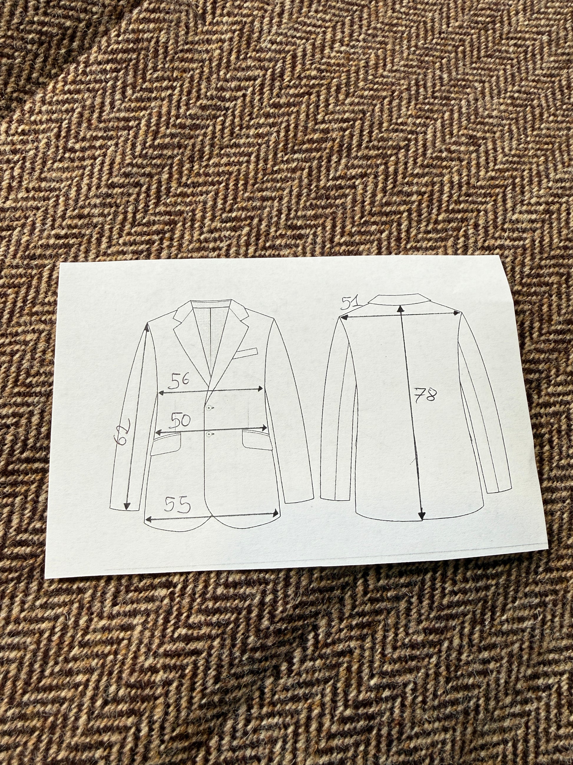 🔎Esempio pratico: la giacca usata come modello in questa guida (v. foto) ha una misura torace di 54 cm. Si tratta della giacca di un abito anni '90 dal taglio generale abbastanza morbido; inoltre, l'abito è un 3 pezzi e va quindi considerato un po' più di margine di vestibilità della giacca per poter indossare comodamente il gilet. Perciò, come da nostra prassi enunciata sopra consideriamo un margine di vestibilità di 6-7 cm: la taglia della giacca sarà quindi 54-6 o 7 = 47 o 48, che corrisponde a una tg. 46/48.