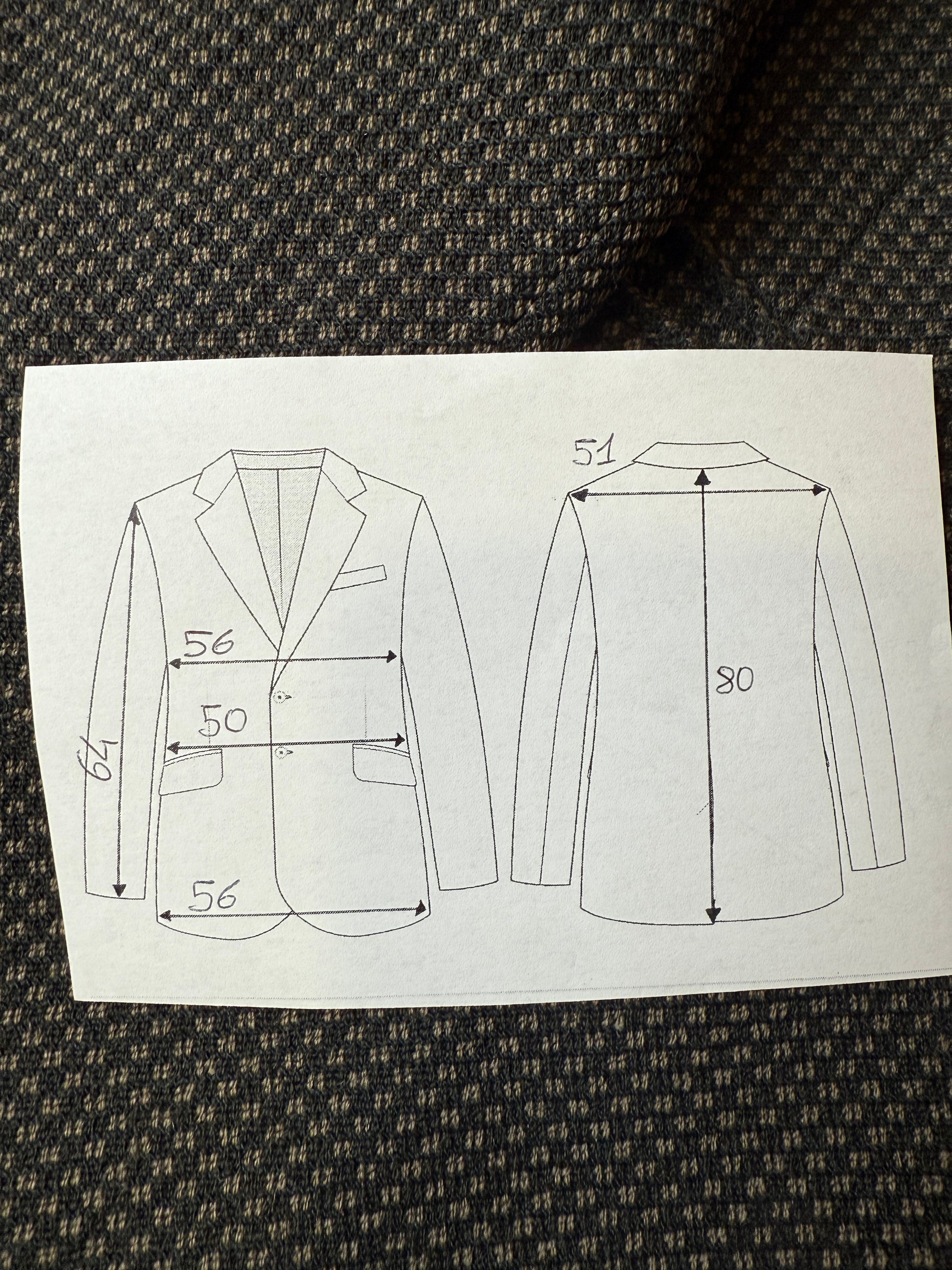 🔎Esempio pratico: la giacca usata come modello in questa guida (v. foto) ha una misura torace di 54 cm. Si tratta della giacca di un abito anni '90 dal taglio generale abbastanza morbido; inoltre, l'abito è un 3 pezzi e va quindi considerato un po' più di margine di vestibilità della giacca per poter indossare comodamente il gilet. Perciò, come da nostra prassi enunciata sopra consideriamo un margine di vestibilità di 6-7 cm: la taglia della giacca sarà quindi 54-6 o 7 = 47 o 48, che corrisponde a una tg. 46/48.