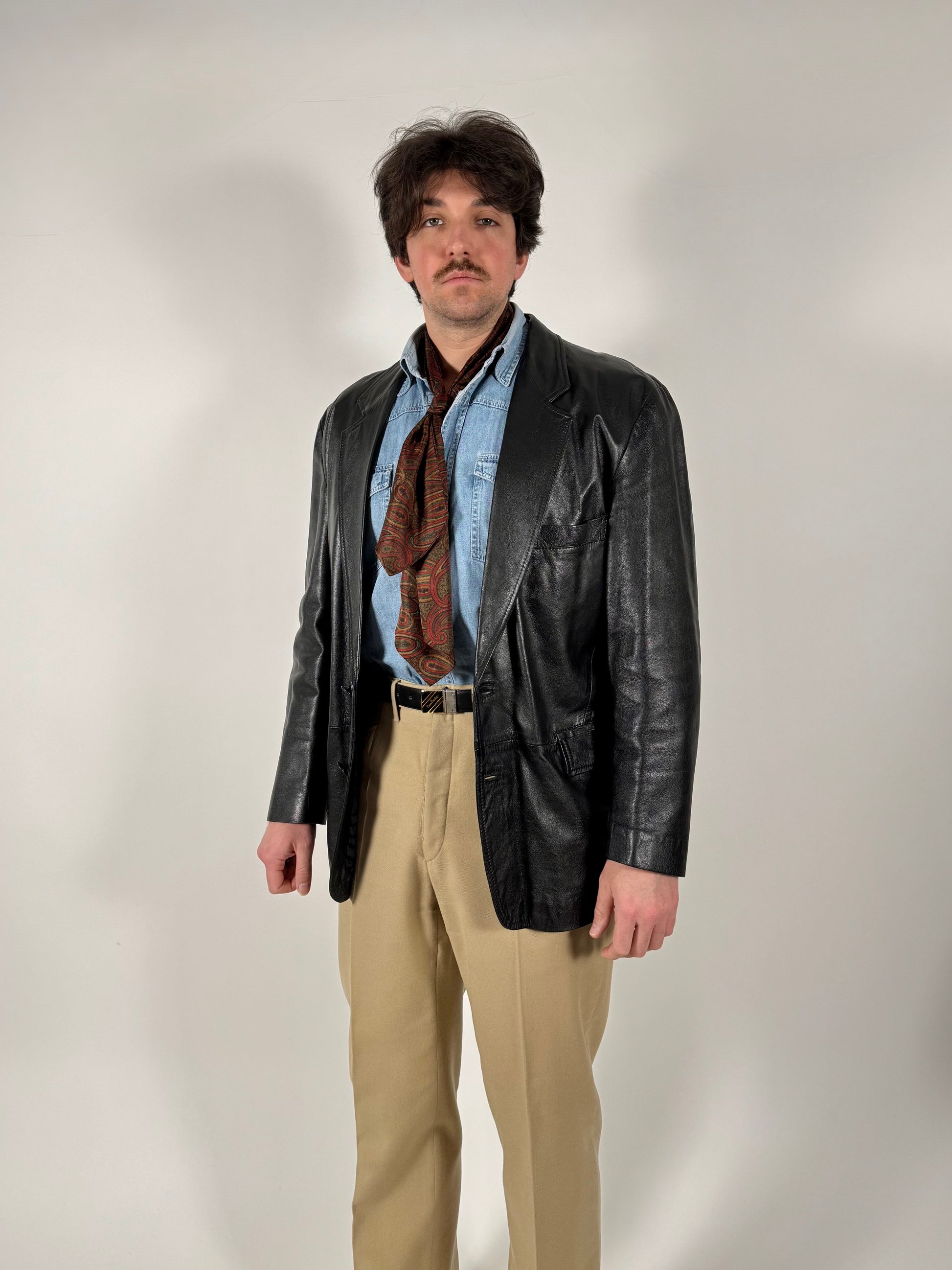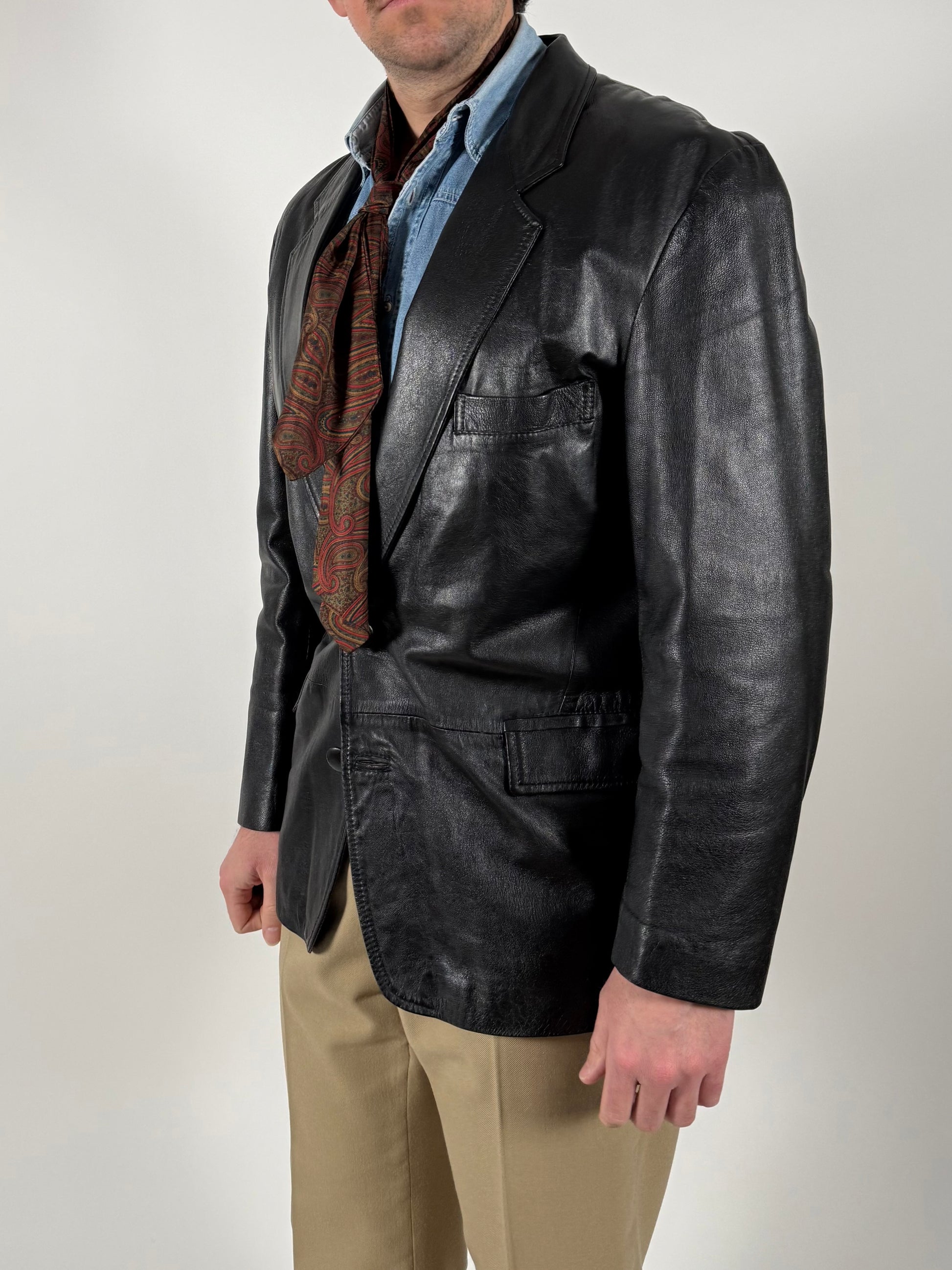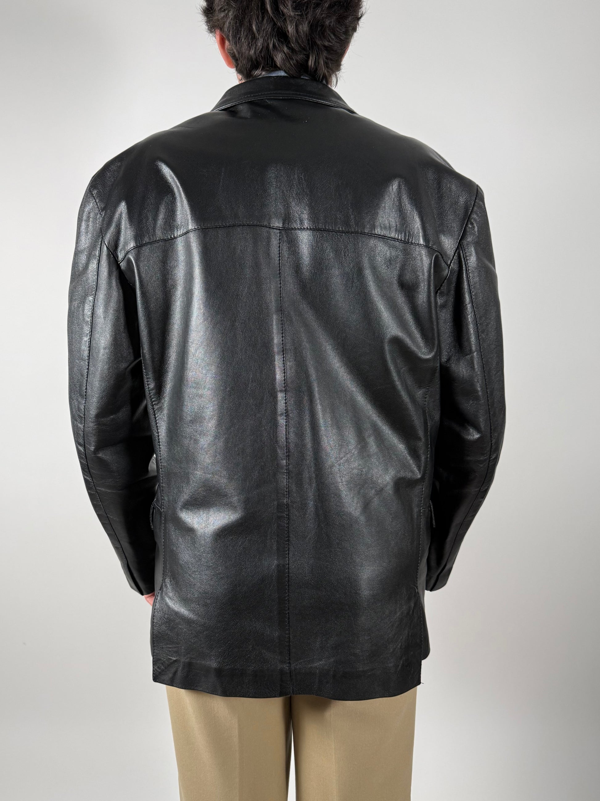 Interessante giacca in pelle anni ‘80, con taglio classico da giacca formale.