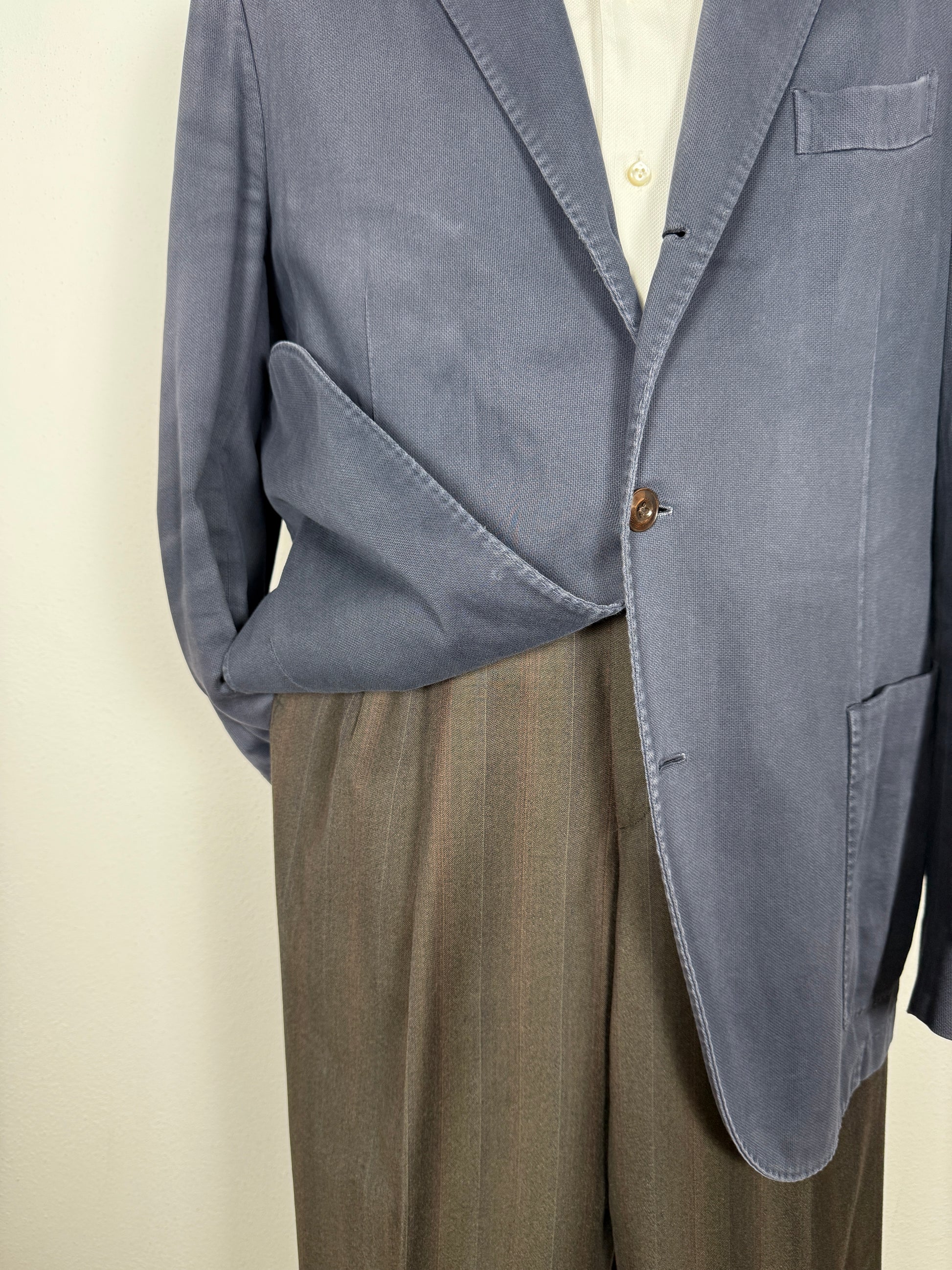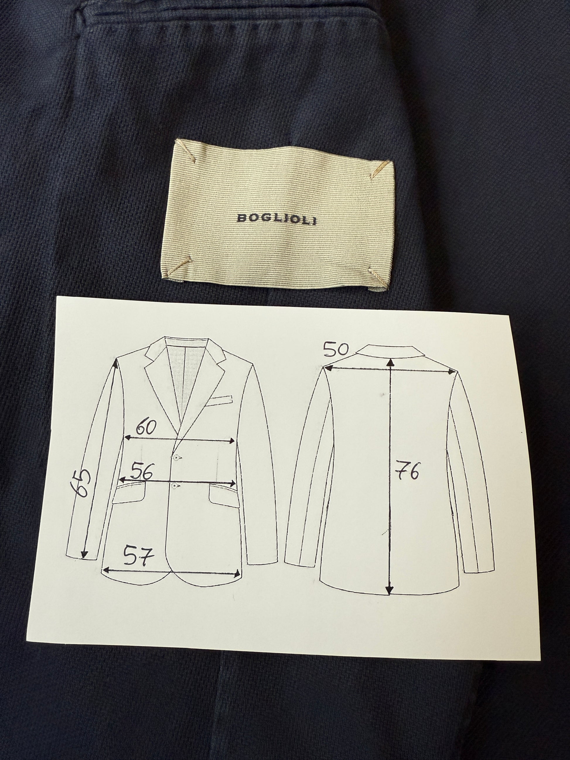 Taglia segnata 56: veste in realtà fra una 54 e una 56 (si tenga sempre presente che la spalla è completamente morbida senza imbottitura, e che la giacca è del tutto sfoderata). Vedere comunque l'ultima foto per le misure complete in cm.