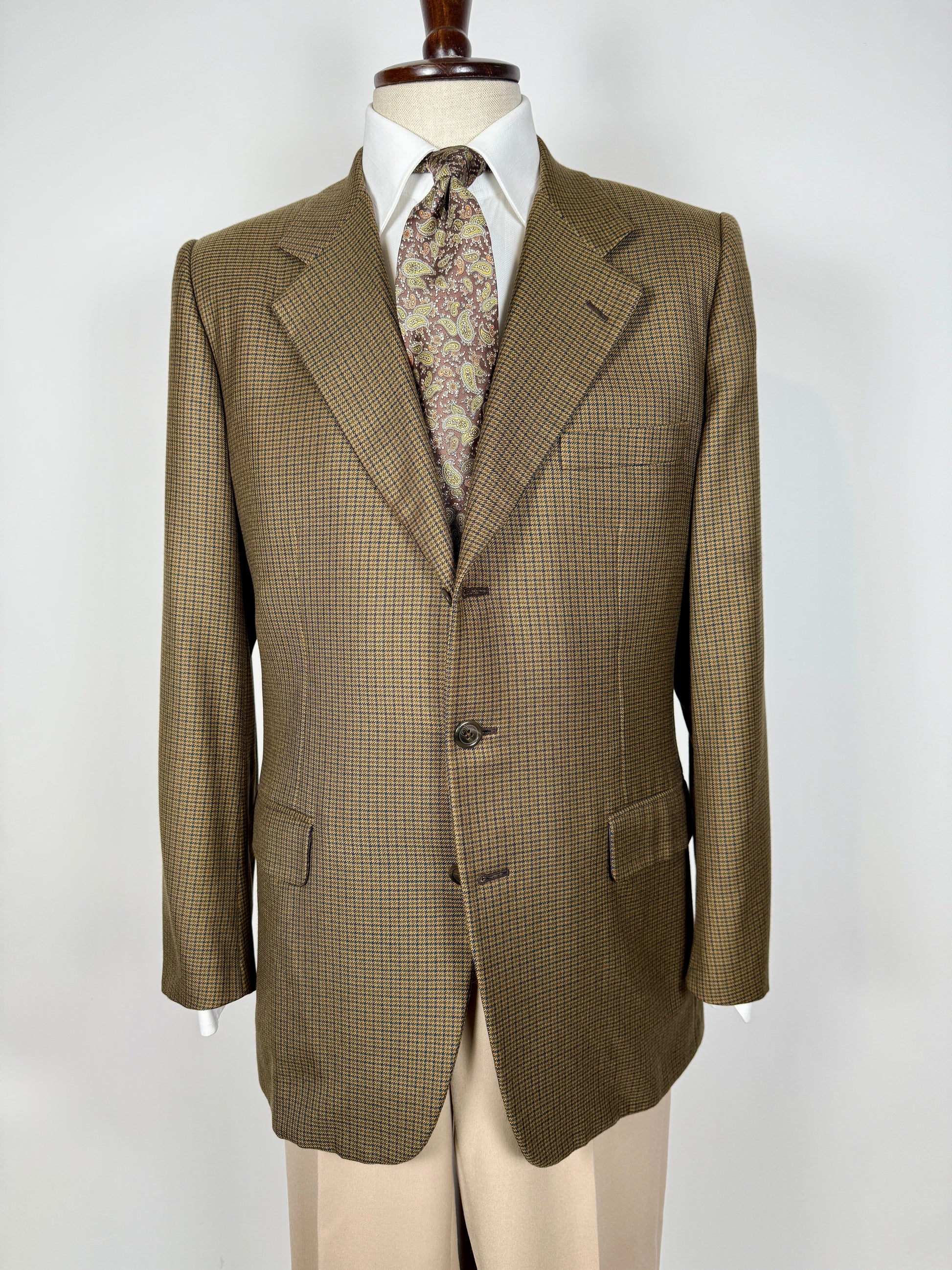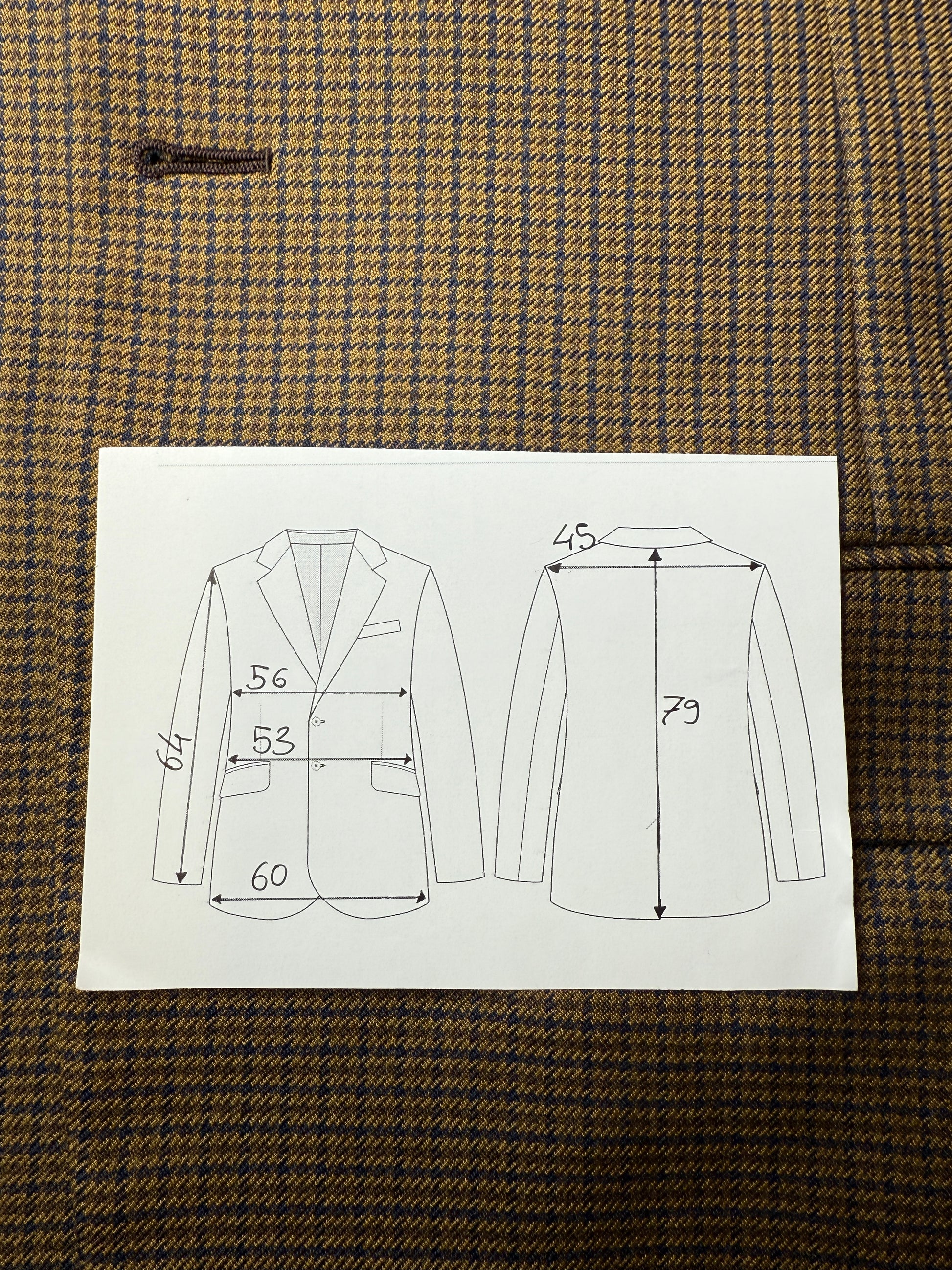 🔎Esempio pratico: la giacca usata come modello in questa guida (v. foto) ha una misura torace di 54 cm. Si tratta della giacca di un abito anni '90 dal taglio generale abbastanza morbido; inoltre, l'abito è un 3 pezzi e va quindi considerato un po' più di margine di vestibilità della giacca per poter indossare comodamente il gilet. Perciò, come da nostra prassi enunciata sopra consideriamo un margine di vestibilità di 6-7 cm: la taglia della giacca sarà quindi 54-6 o 7 = 47 o 48, che corrisponde a una tg. 46/48.
