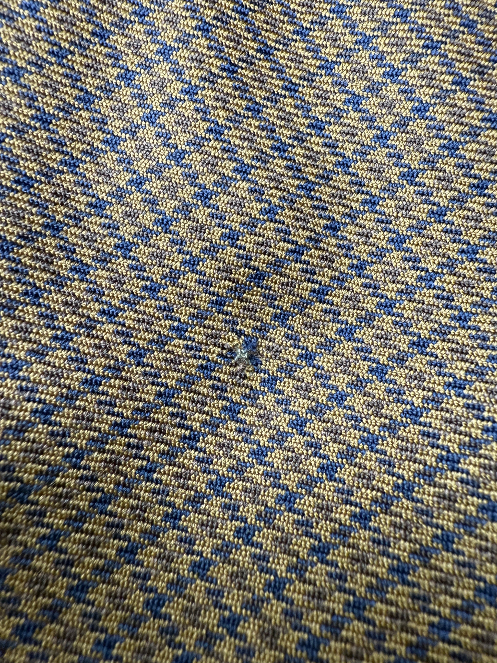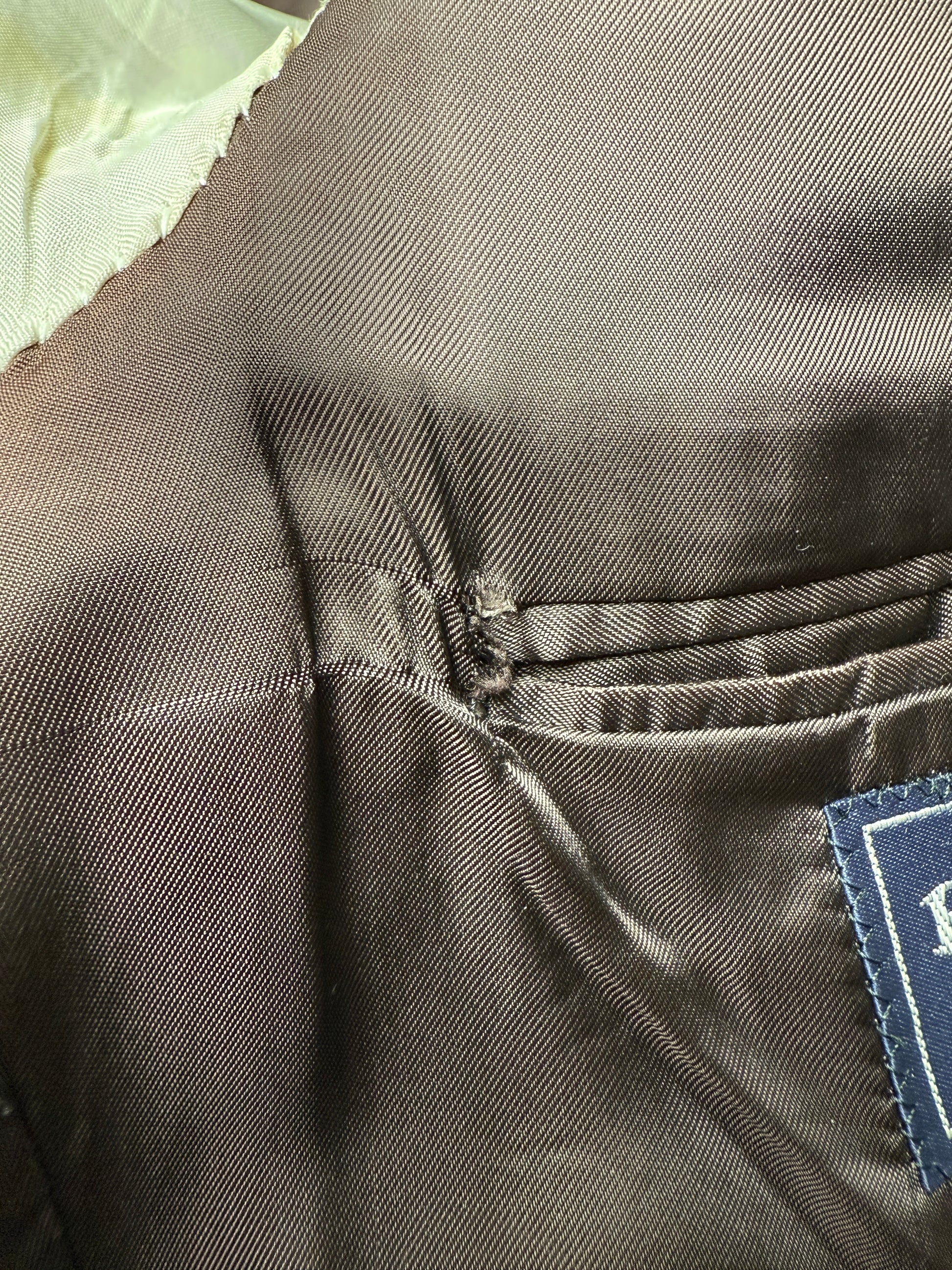 È presente purtroppo un piccolo rammendo dietro alla manica destra, in posizione non esposta, oltre a una minima usura nella fodera a livello giromanica: si tratta di difetti poco visibili, di cui il prezzo tiene conto.