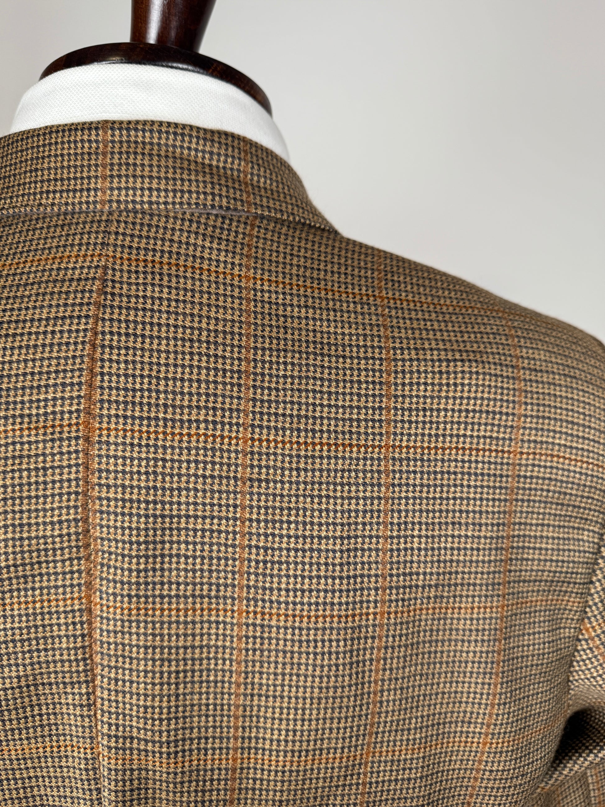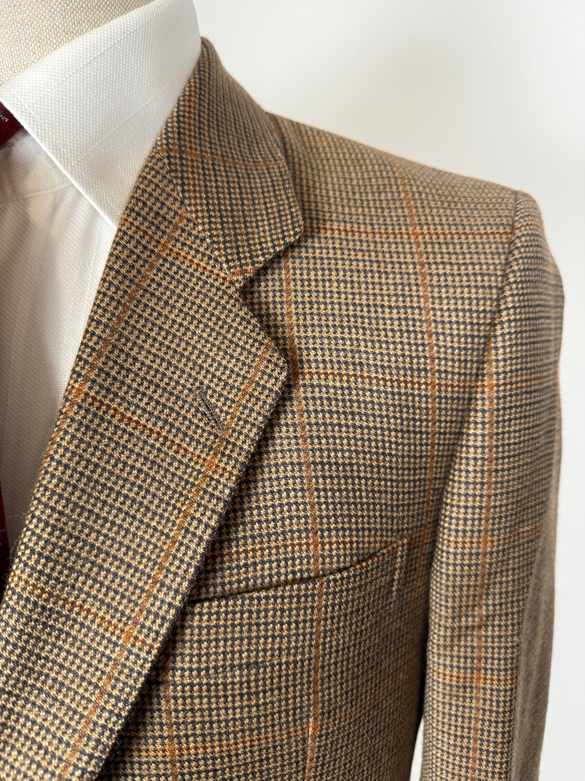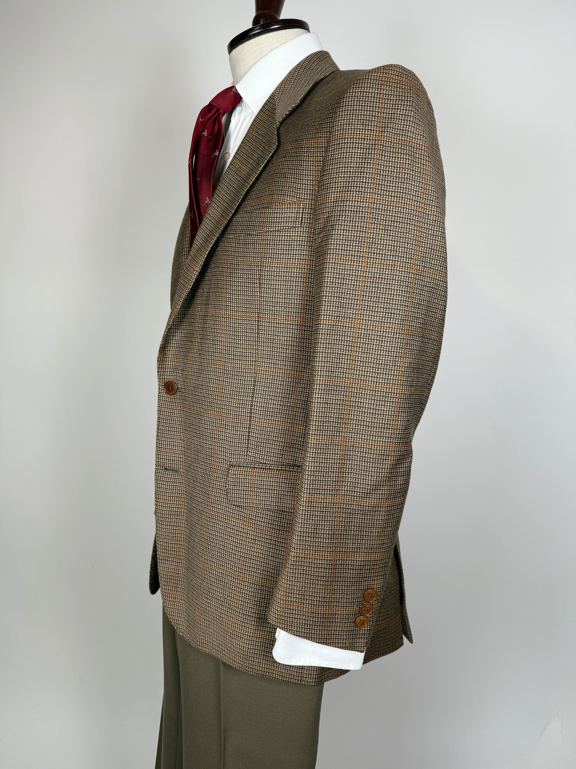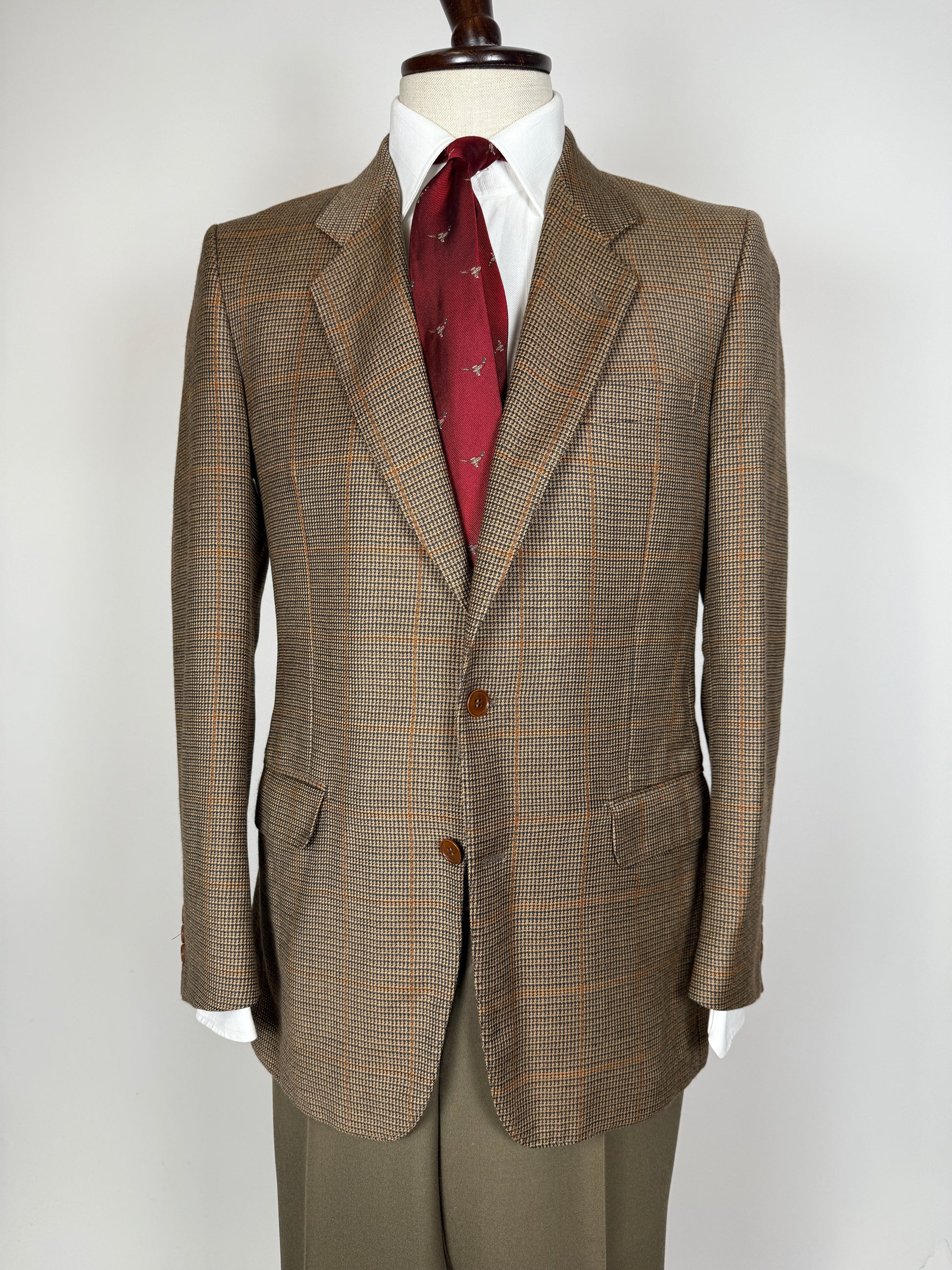Giacca Cantarelli Esquire anni ‘70/‘80 con bellissima fantasia check finestrata sulle tinte del marrone, cammello, tabacco e ruggine.