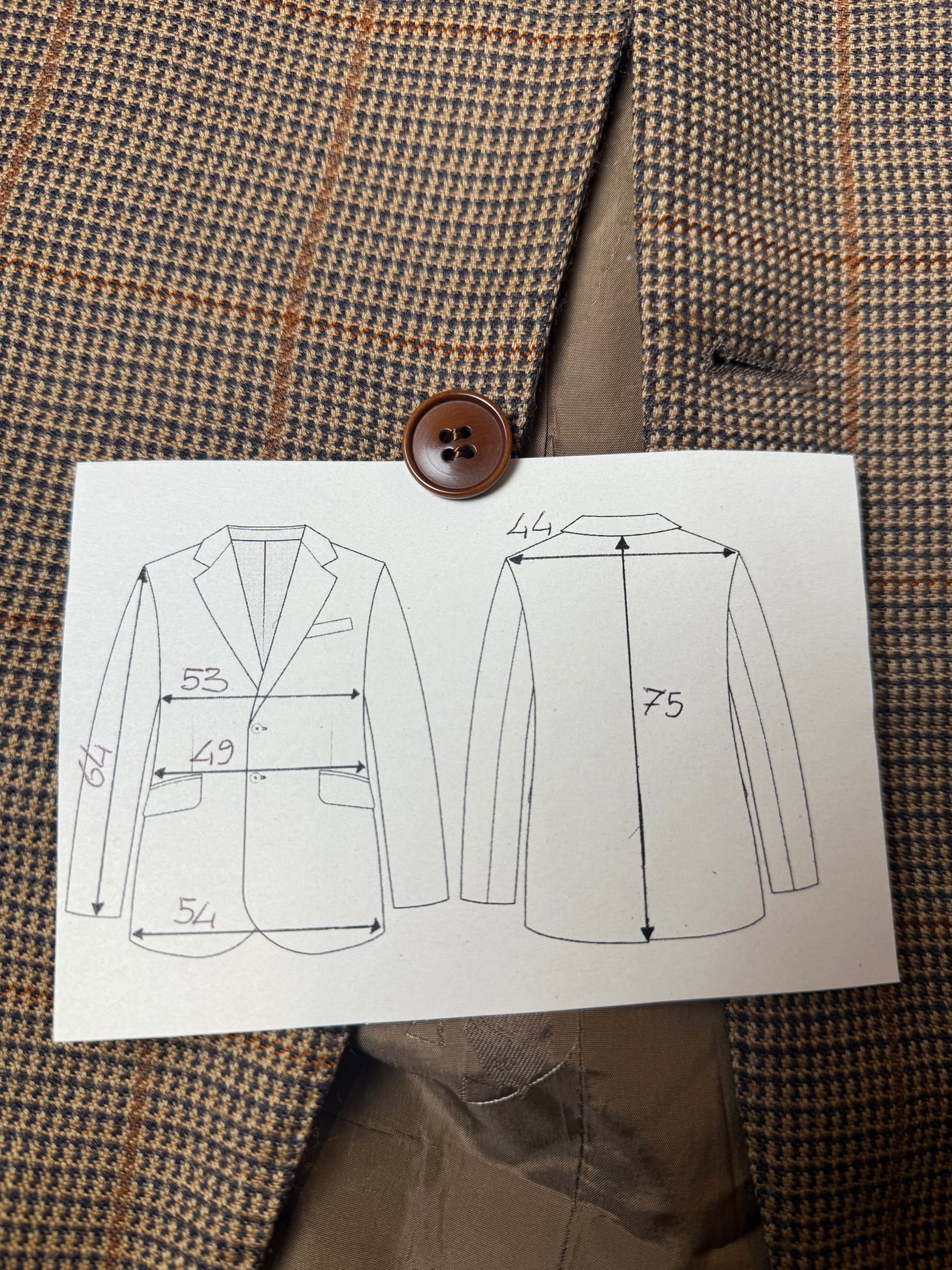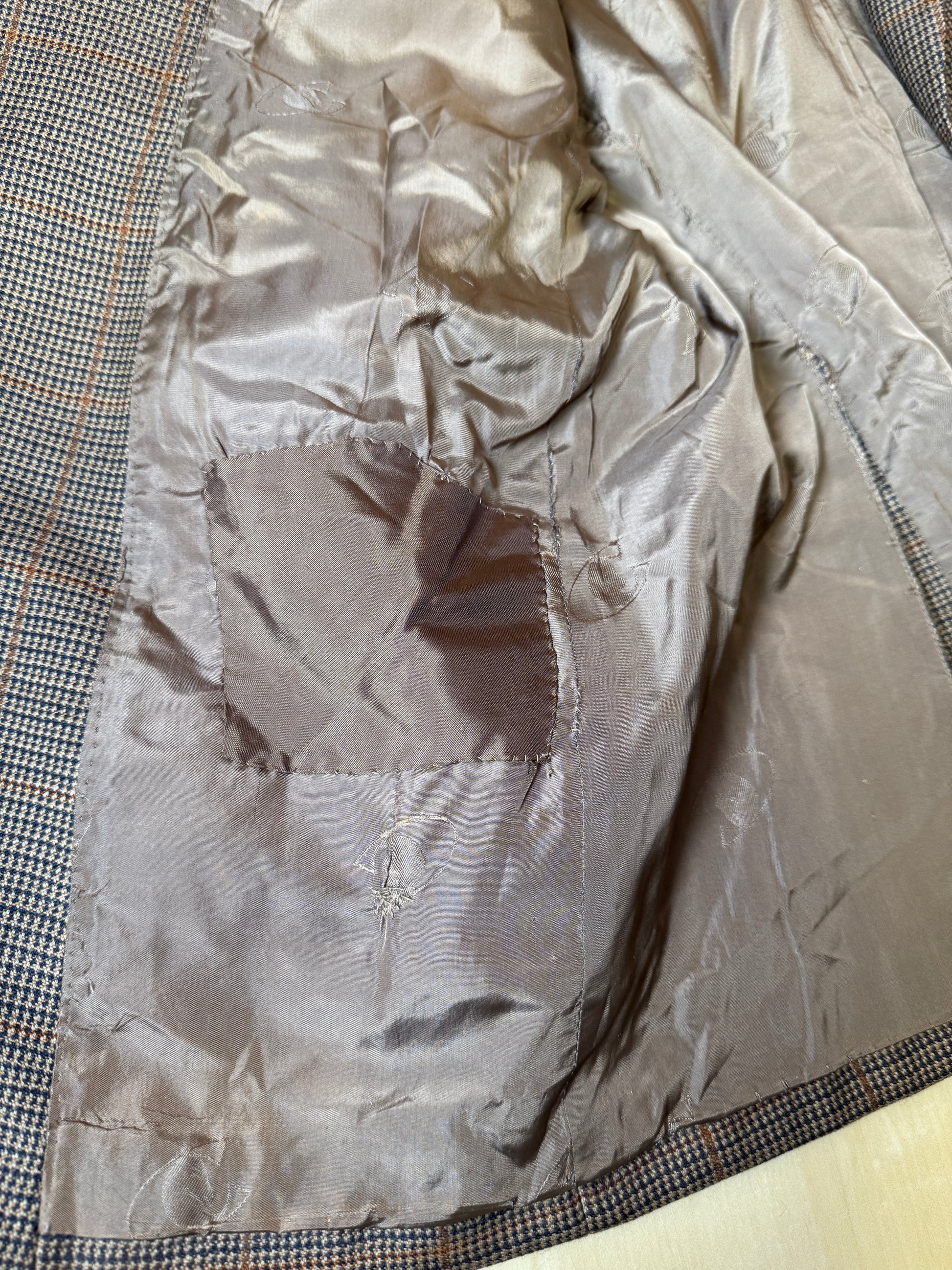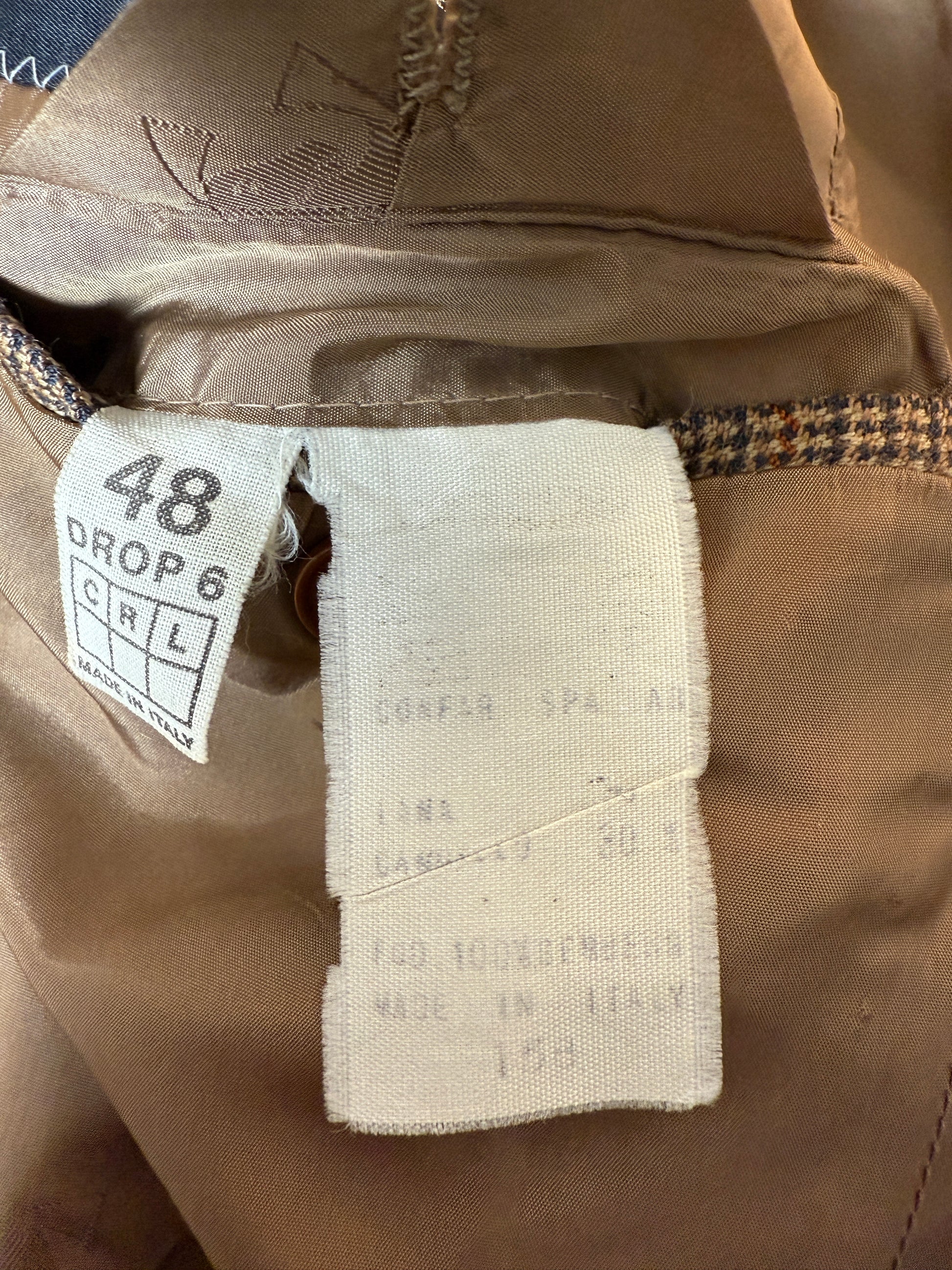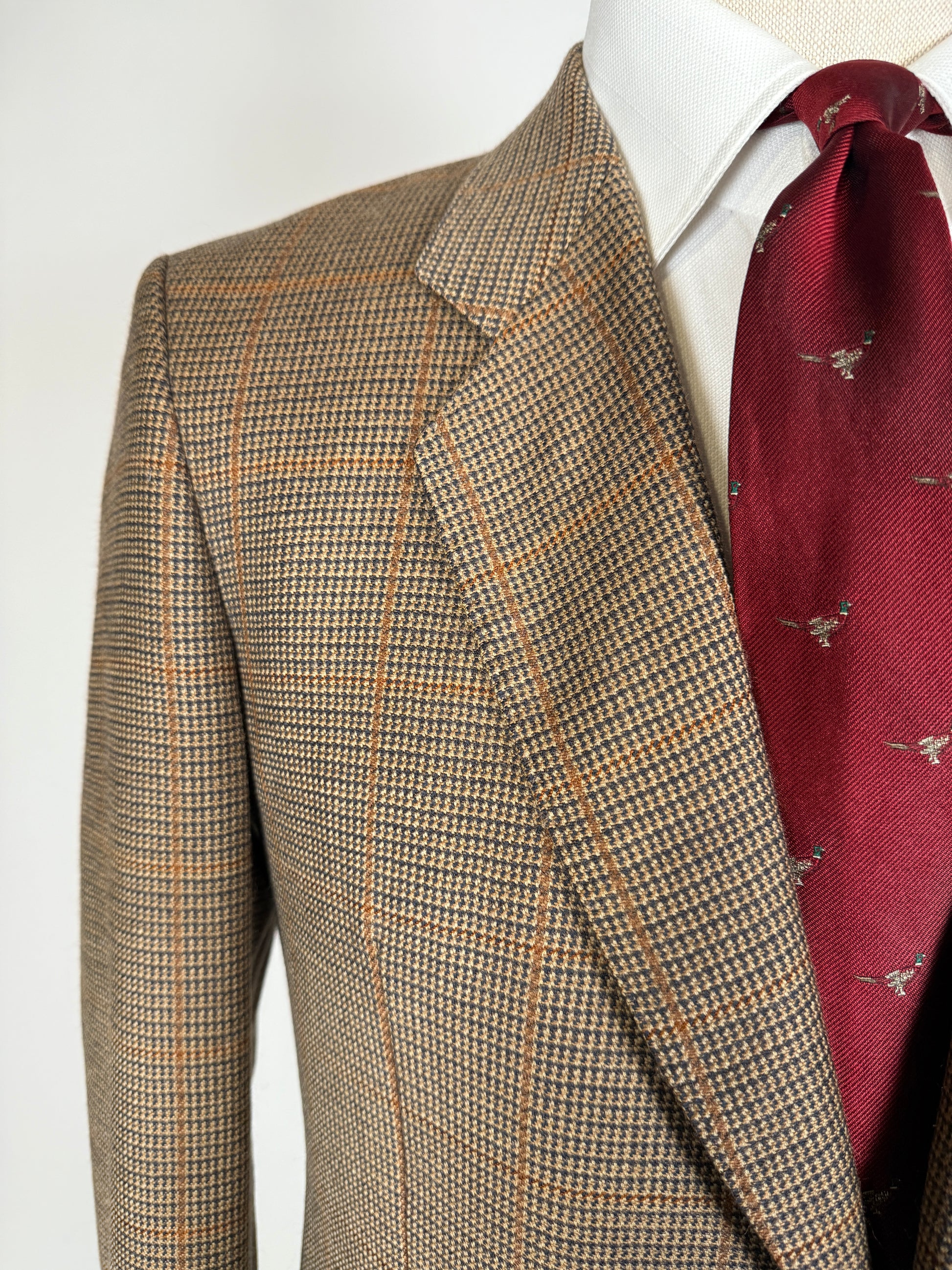 Giacca Cantarelli Esquire anni ‘70/‘80 con bellissima fantasia check finestrata sulle tinte del marrone, cammello, tabacco e ruggine.