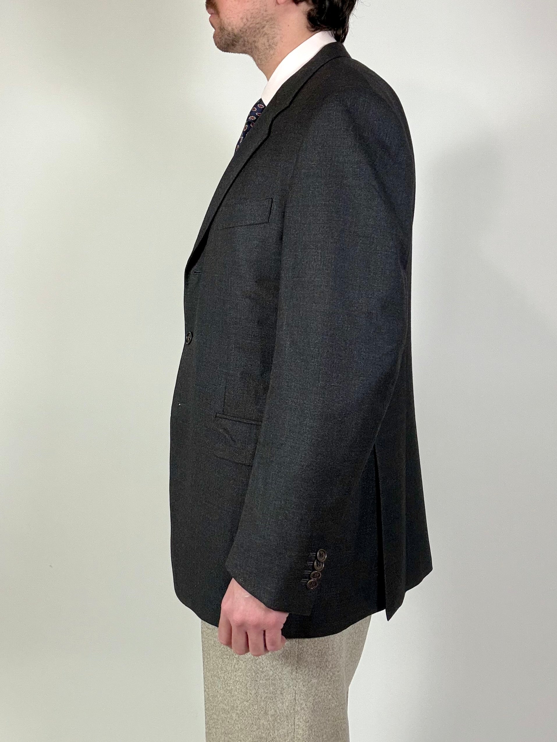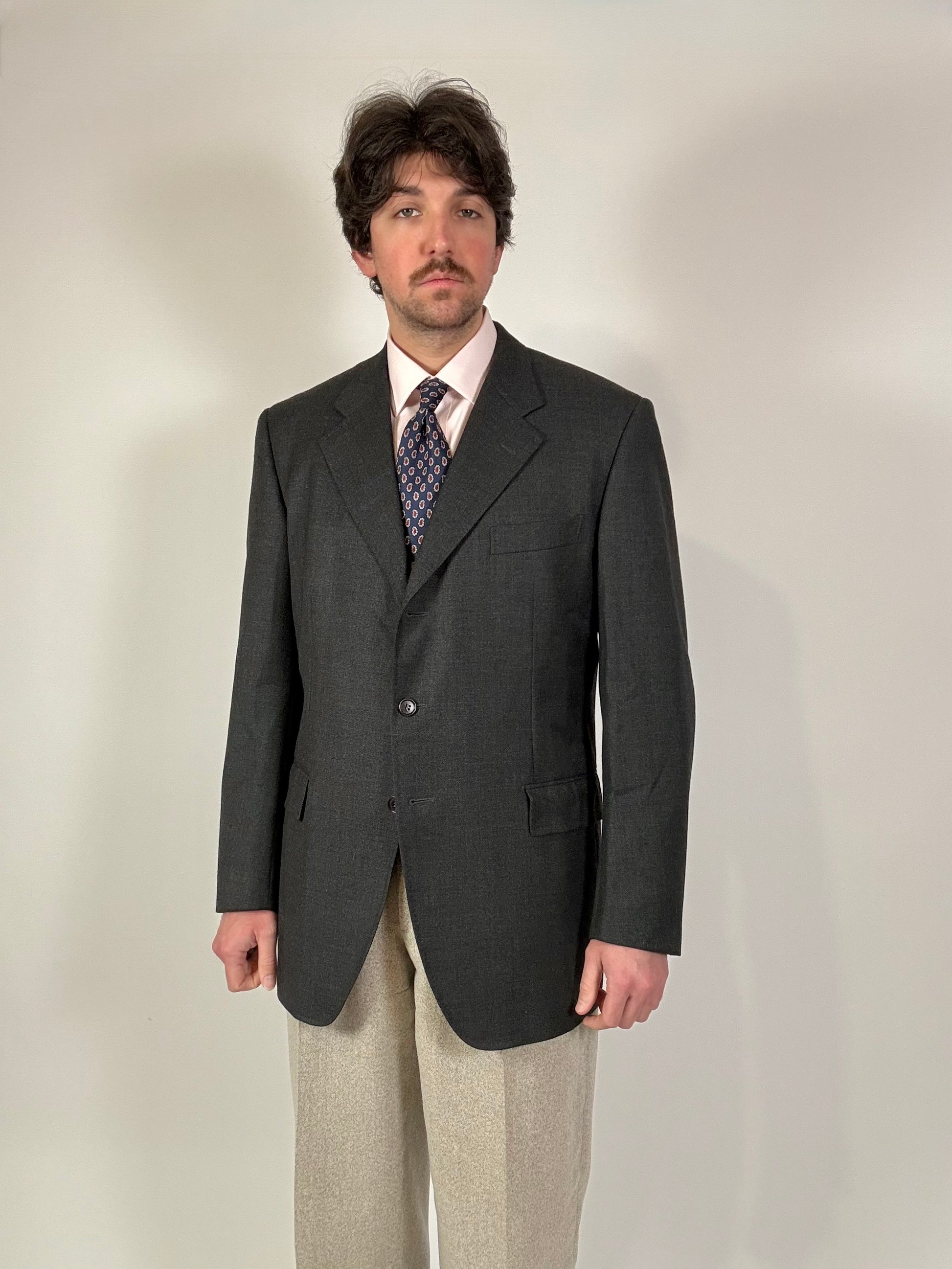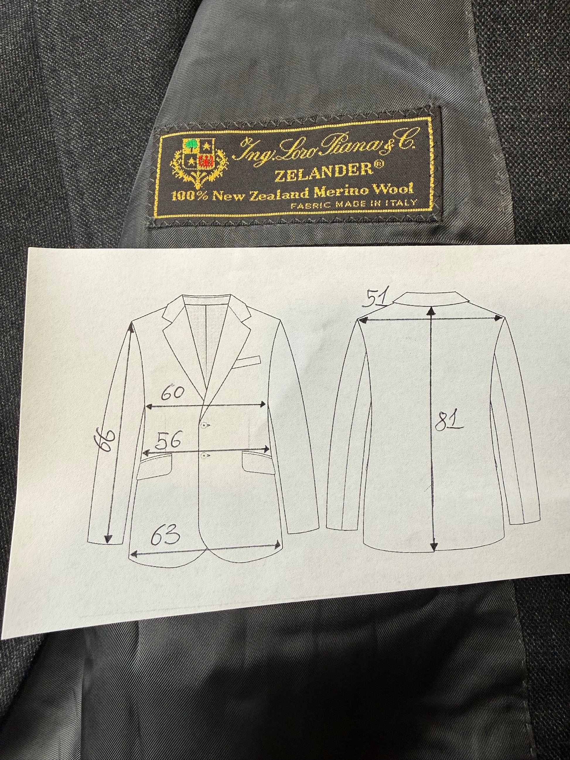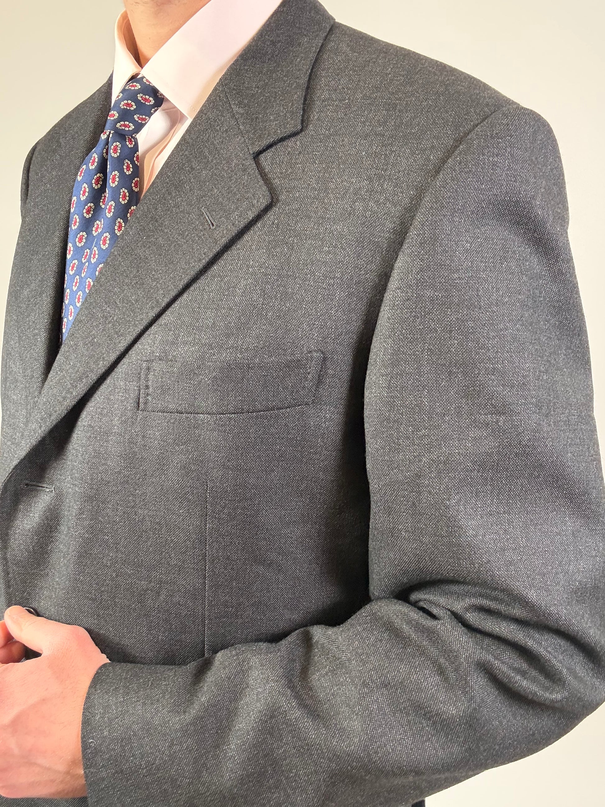 🔎Esempio pratico: la giacca usata come modello in questa guida (v. foto) ha una misura torace di 54 cm. Si tratta della giacca di un abito anni '90 dal taglio generale abbastanza morbido; inoltre, l'abito è un 3 pezzi e va quindi considerato un po' più di margine di vestibilità della giacca per poter indossare comodamente il gilet. Perciò, come da nostra prassi enunciata sopra consideriamo un margine di vestibilità di 6-7 cm: la taglia della giacca sarà quindi 54-6 o 7 = 47 o 48, che corrisponde a una tg. 46/48.