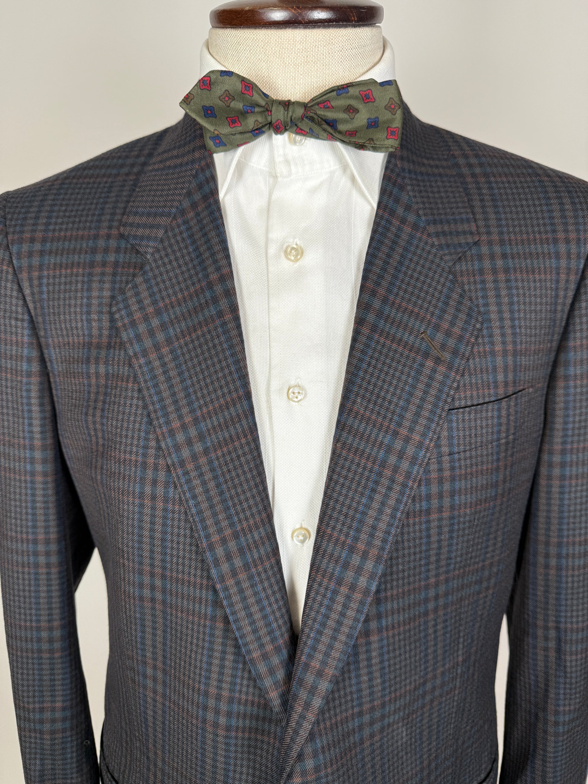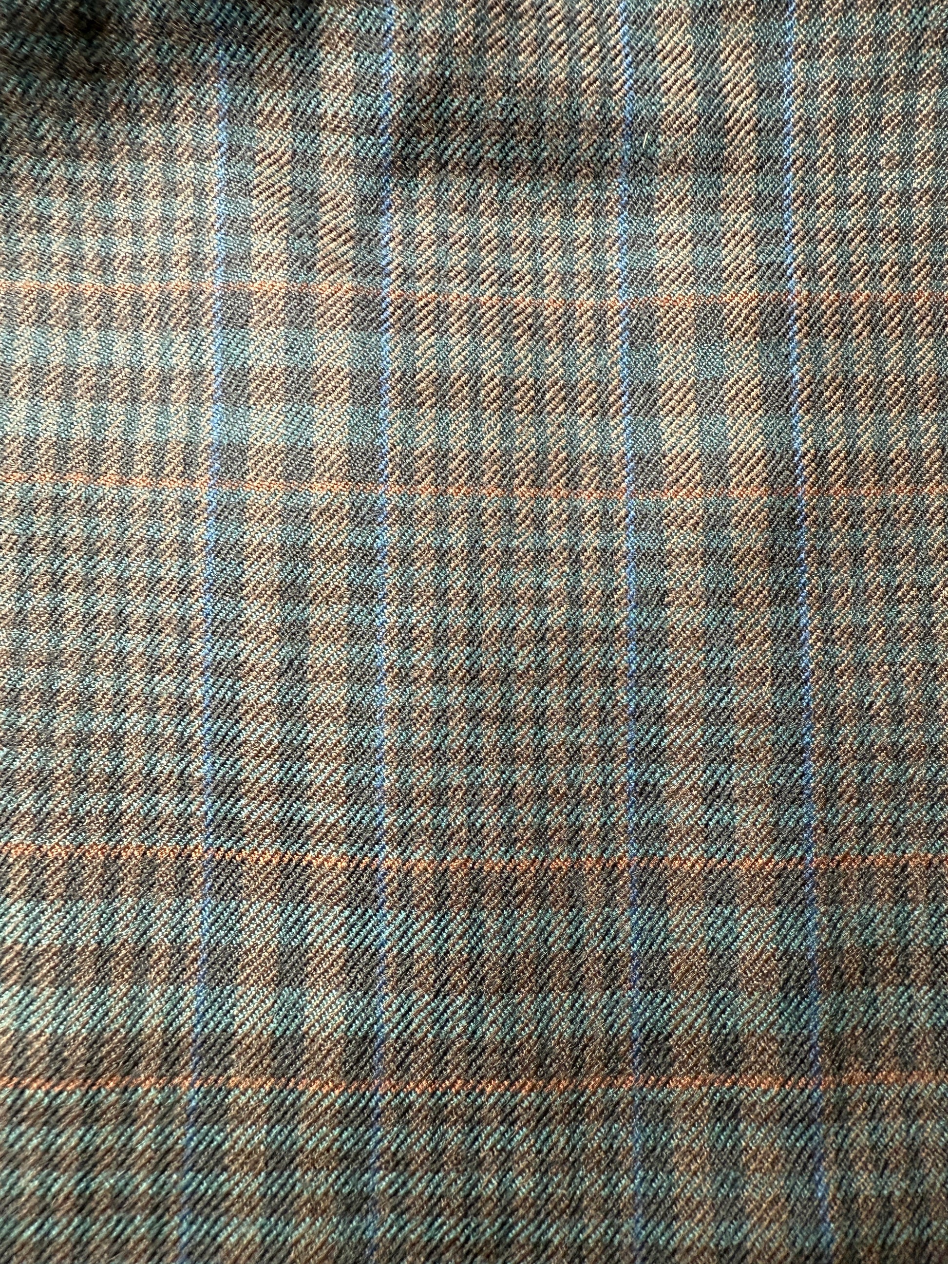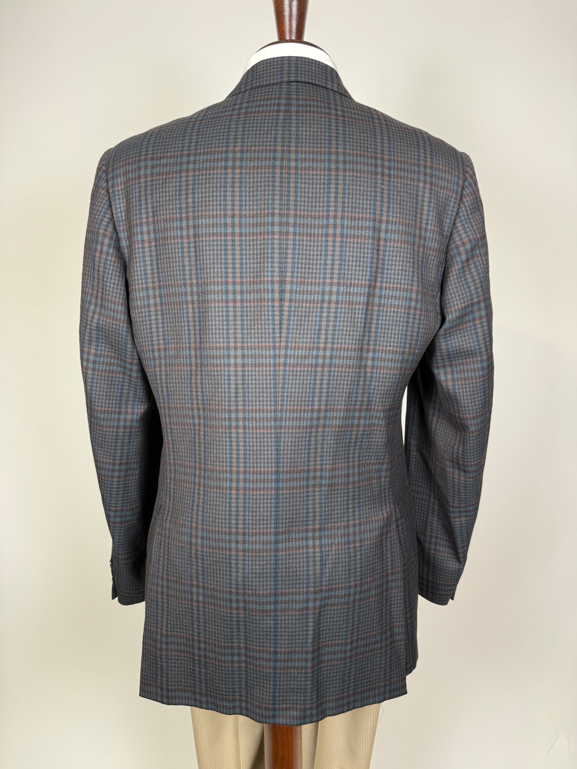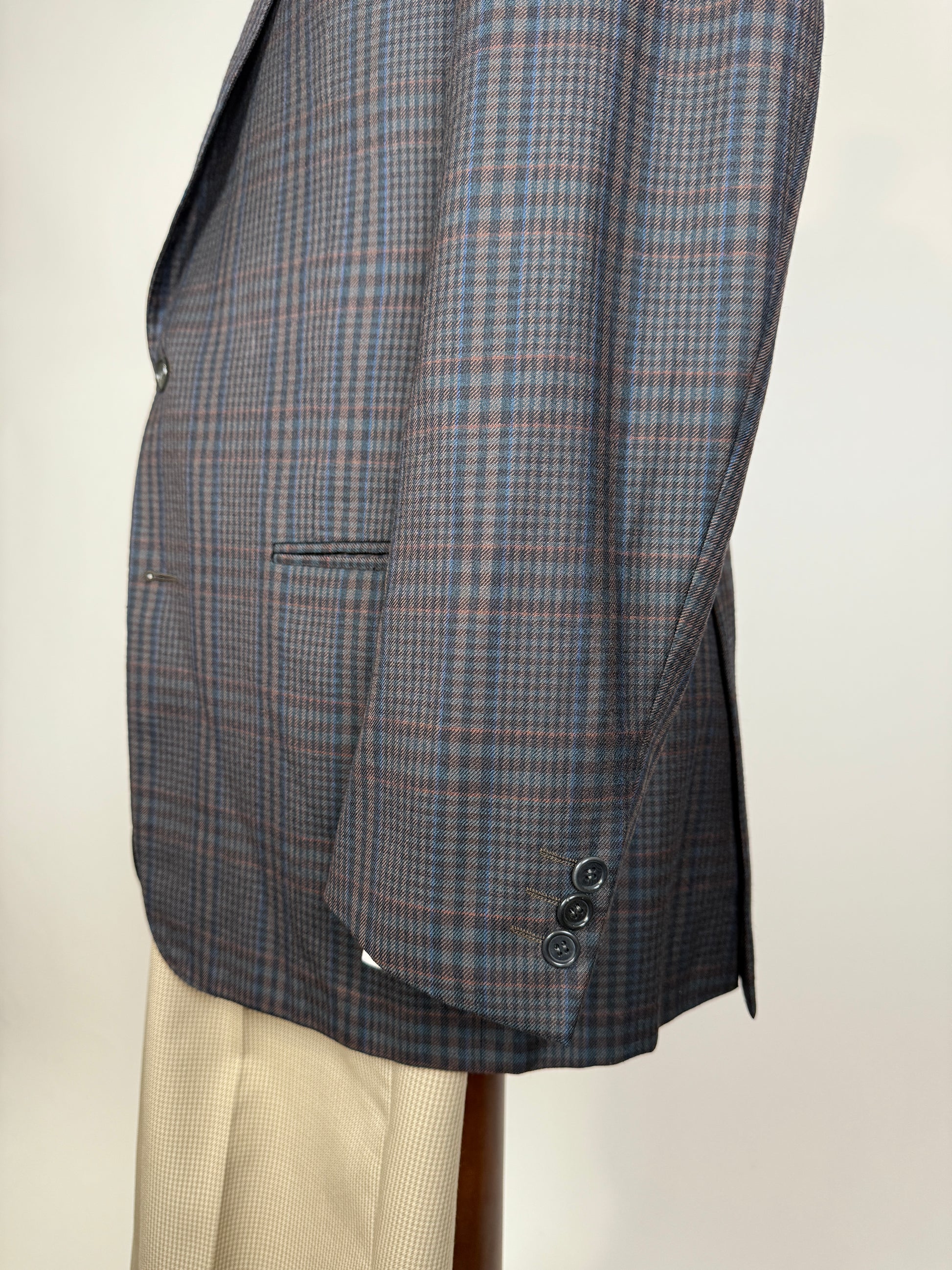 Giacca Corneliani anni ‘80/‘90 in calda flanella pettinata 100% lana, con fantasia tartan sulle tinte del blu navy e verde scuro che ricorda vagamente il Black Watch.