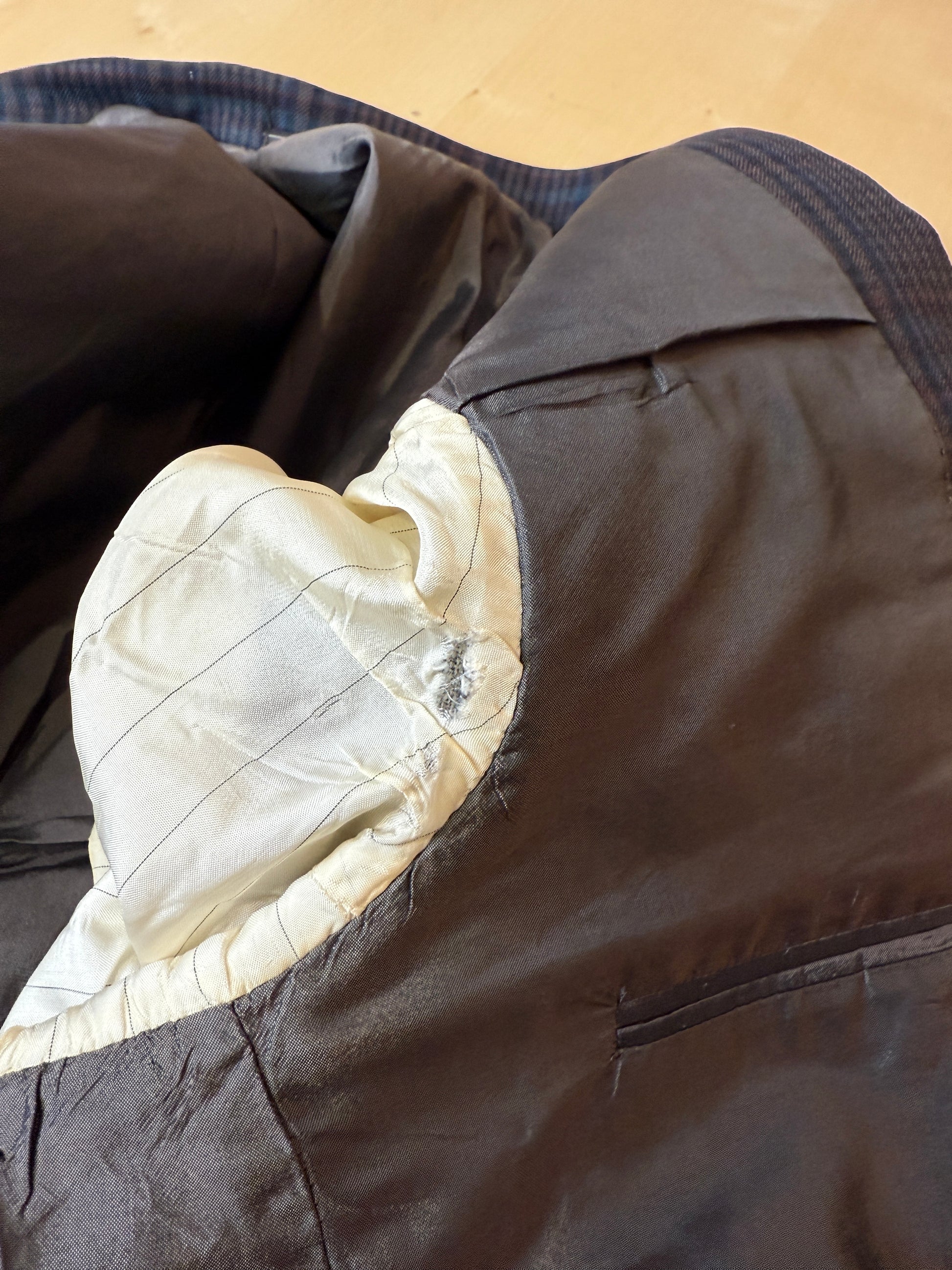 🔎Esempio pratico: la giacca usata come modello in questa guida (v. foto) ha una misura torace di 54 cm. Si tratta della giacca di un abito anni '90 dal taglio generale abbastanza morbido; inoltre, l'abito è un 3 pezzi e va quindi considerato un po' più di margine di vestibilità della giacca per poter indossare comodamente il gilet. Perciò, come da nostra prassi enunciata sopra consideriamo un margine di vestibilità di 6-7 cm: la taglia della giacca sarà quindi 54-6 o 7 = 47 o 48, che corrisponde a una tg. 46/48.