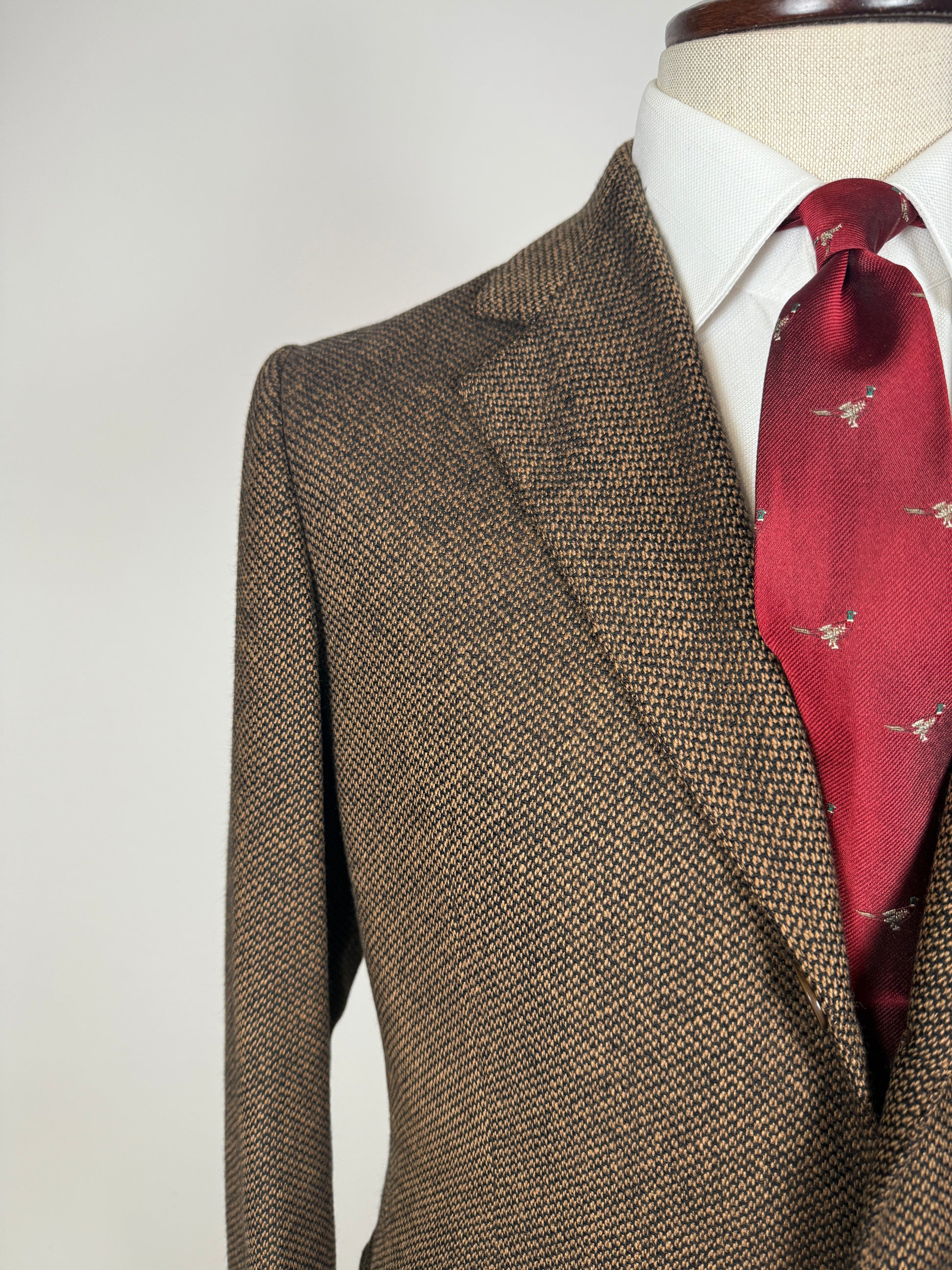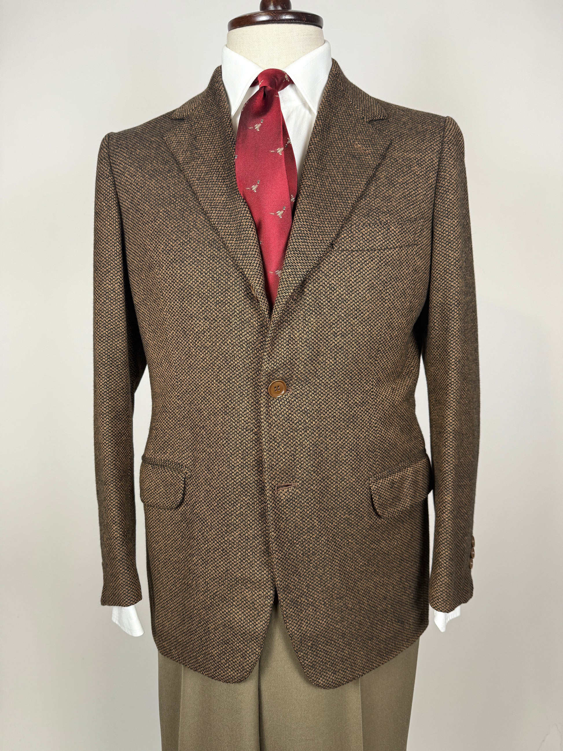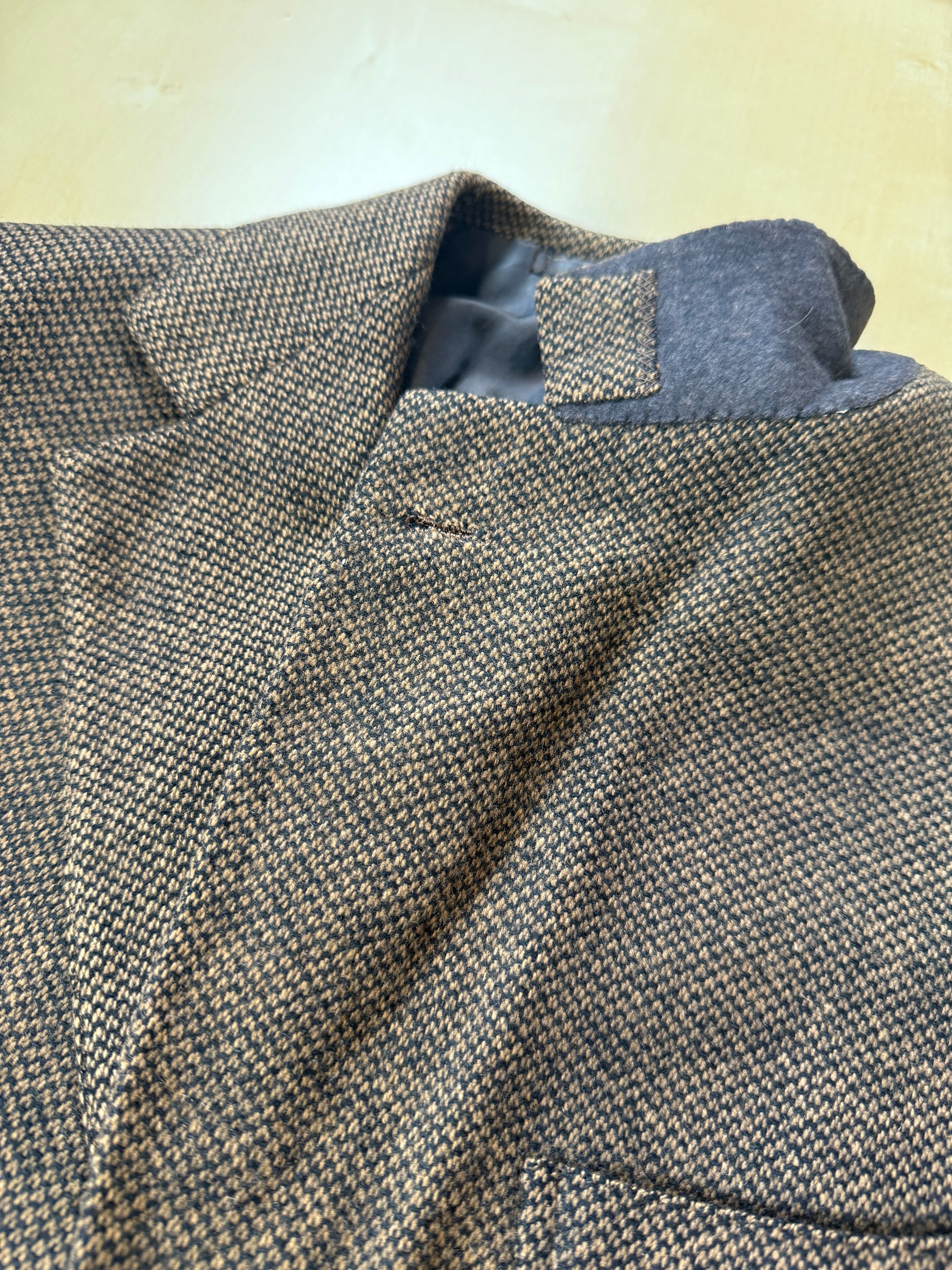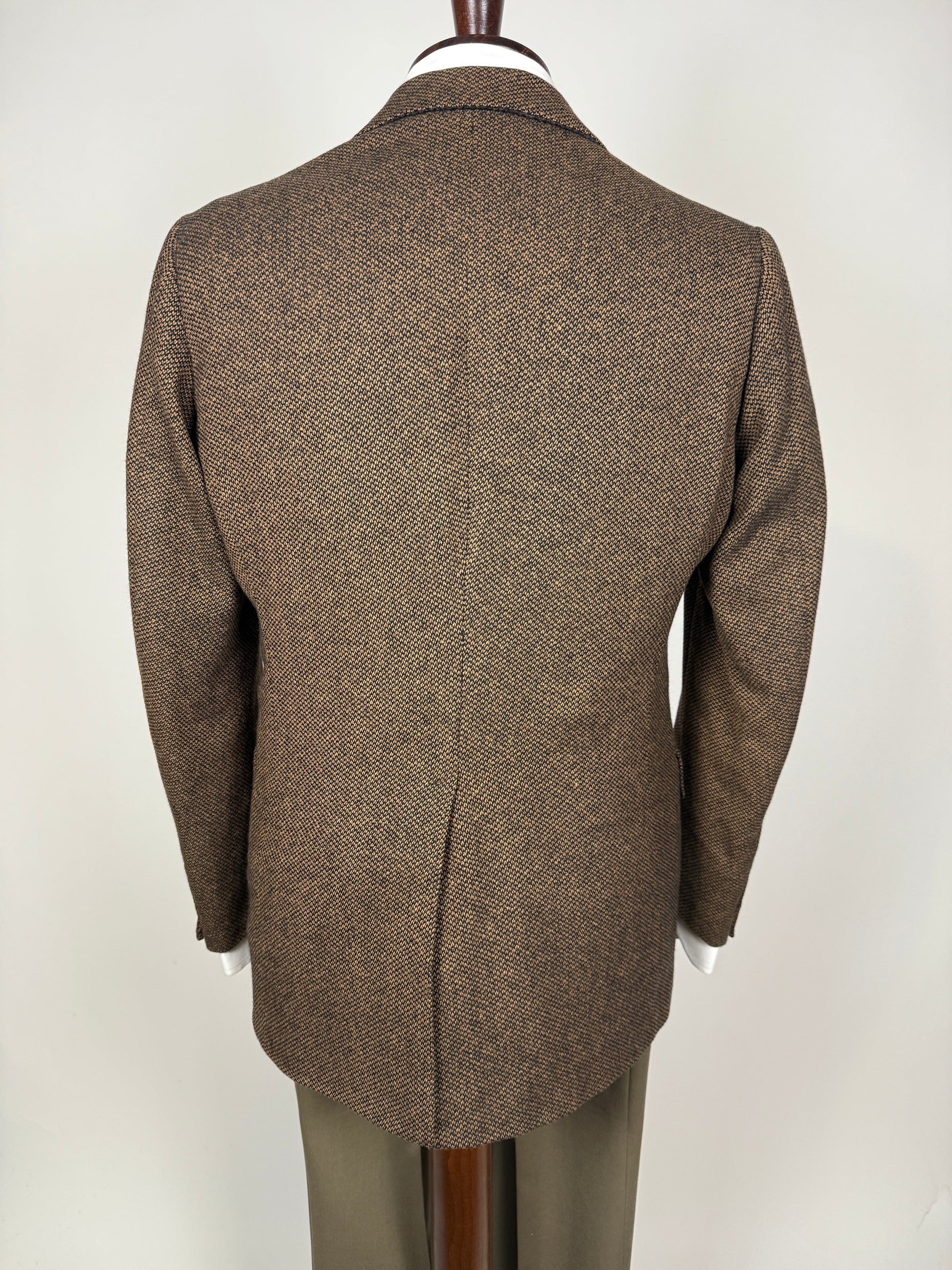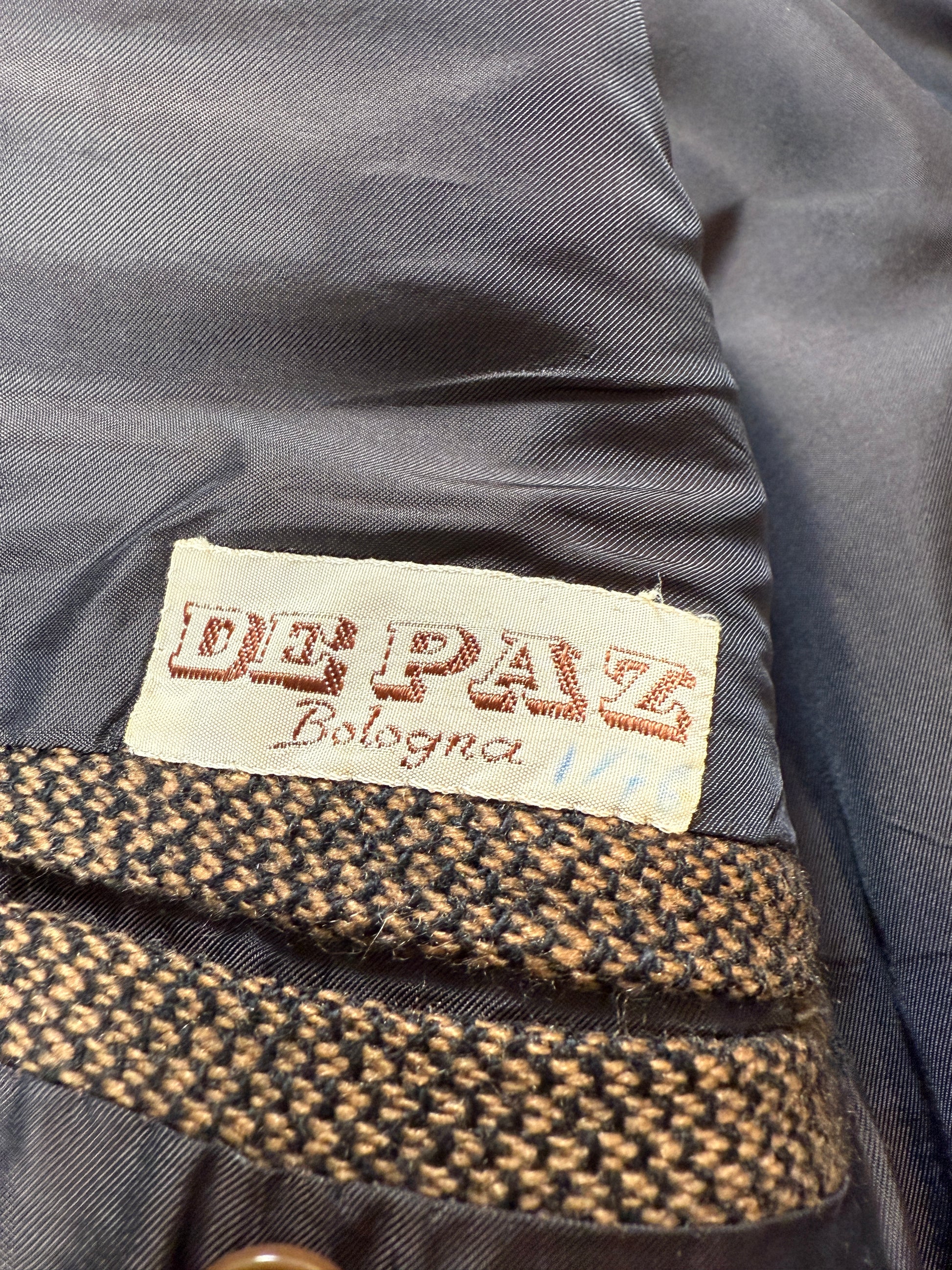 Stupenda giacca De Paz Bologna degli anni '70 (1/76 sull'etichetta), in un caldo tessuto in puro cashmere (o forse lana e cashmere) con lavorazione mélange nei colori nero e marrone, effetto marrone scuro.