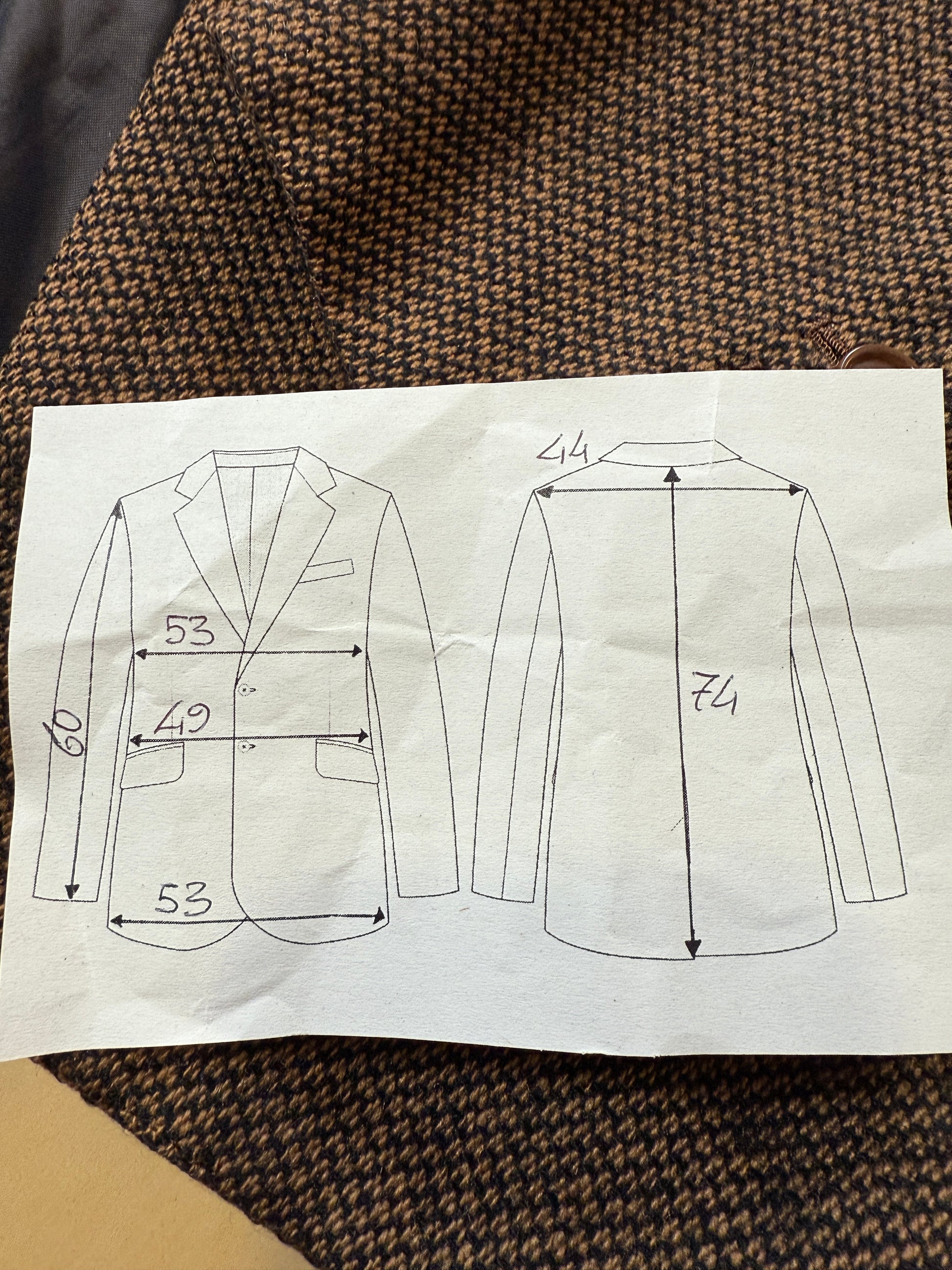 🔎Esempio pratico: la giacca usata come modello in questa guida (v. foto) ha una misura torace di 54 cm. Si tratta della giacca di un abito anni '90 dal taglio generale abbastanza morbido; inoltre, l'abito è un 3 pezzi e va quindi considerato un po' più di margine di vestibilità della giacca per poter indossare comodamente il gilet. Perciò, come da nostra prassi enunciata sopra consideriamo un margine di vestibilità di 6-7 cm: la taglia della giacca sarà quindi 54-6 o 7 = 47 o 48, che corrisponde a una tg. 46/48.