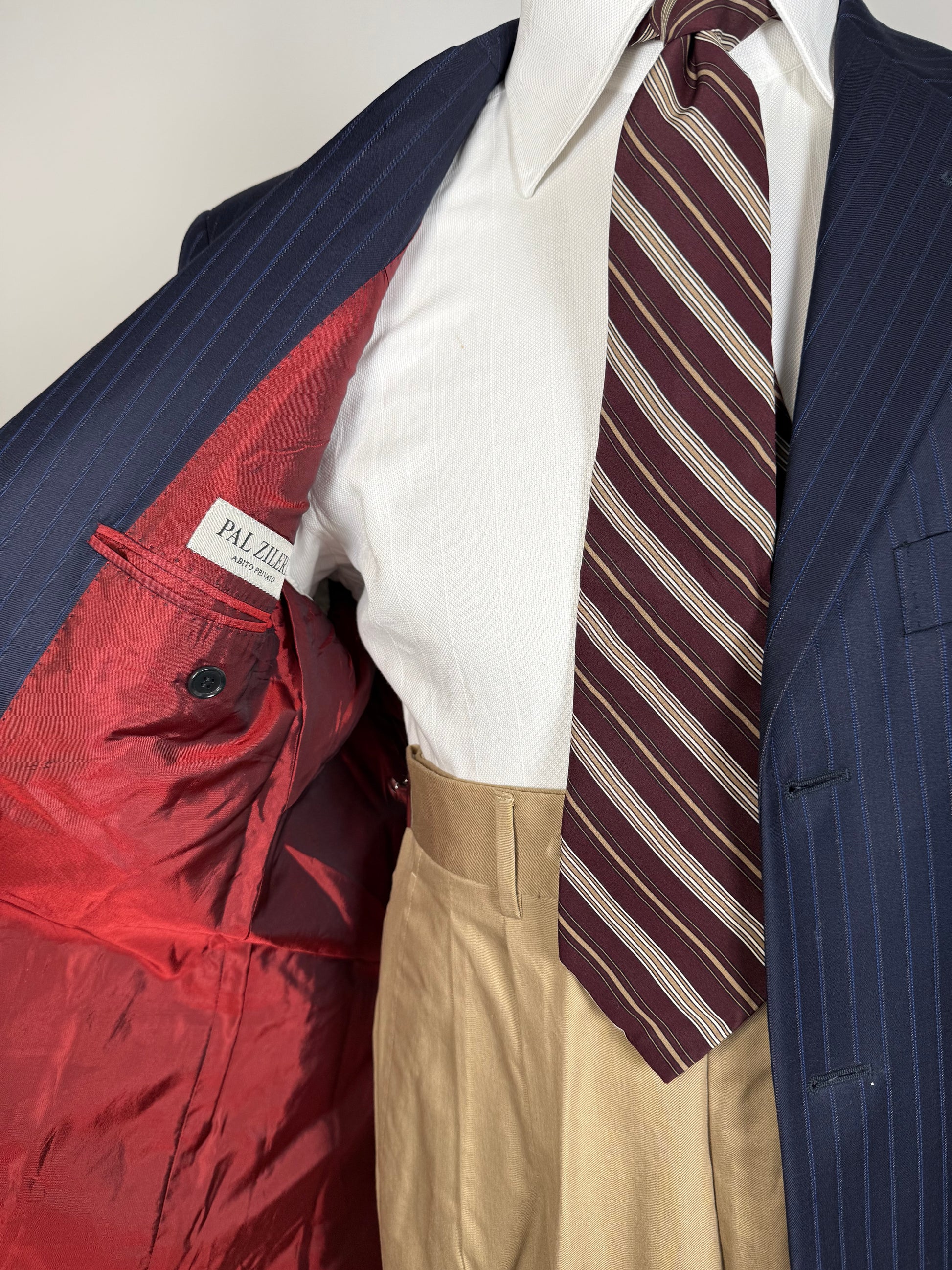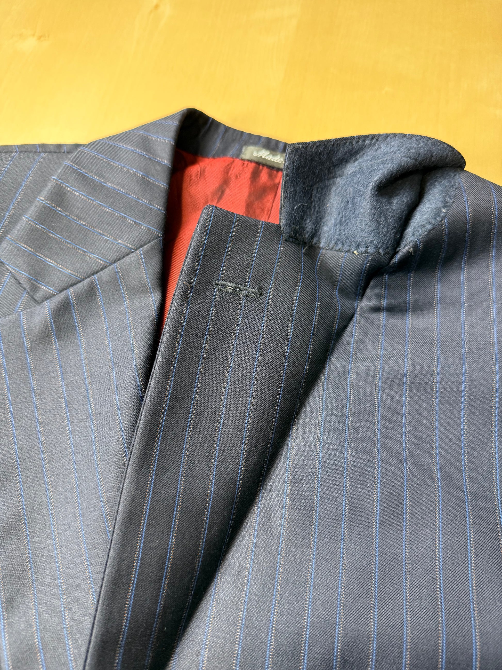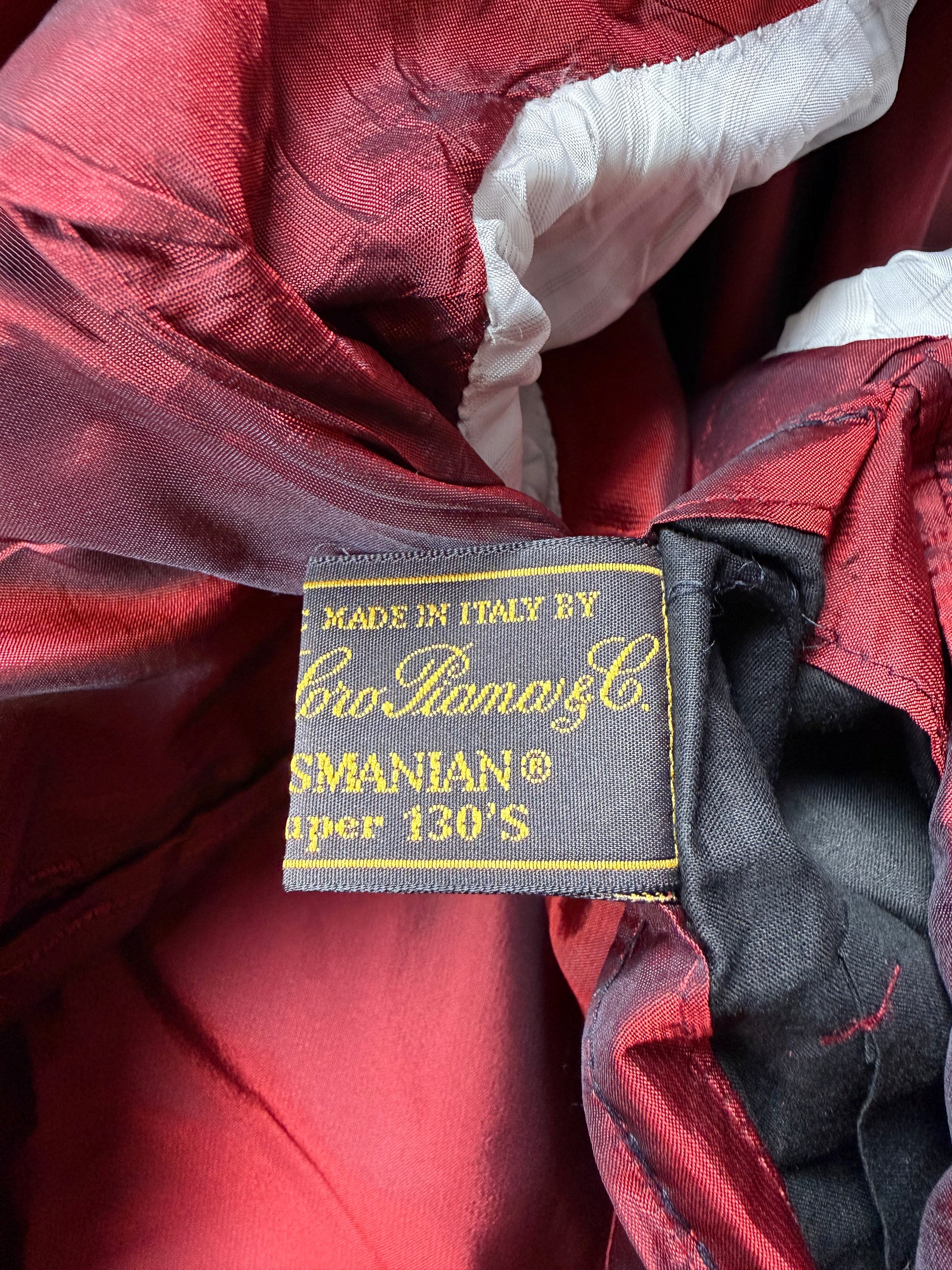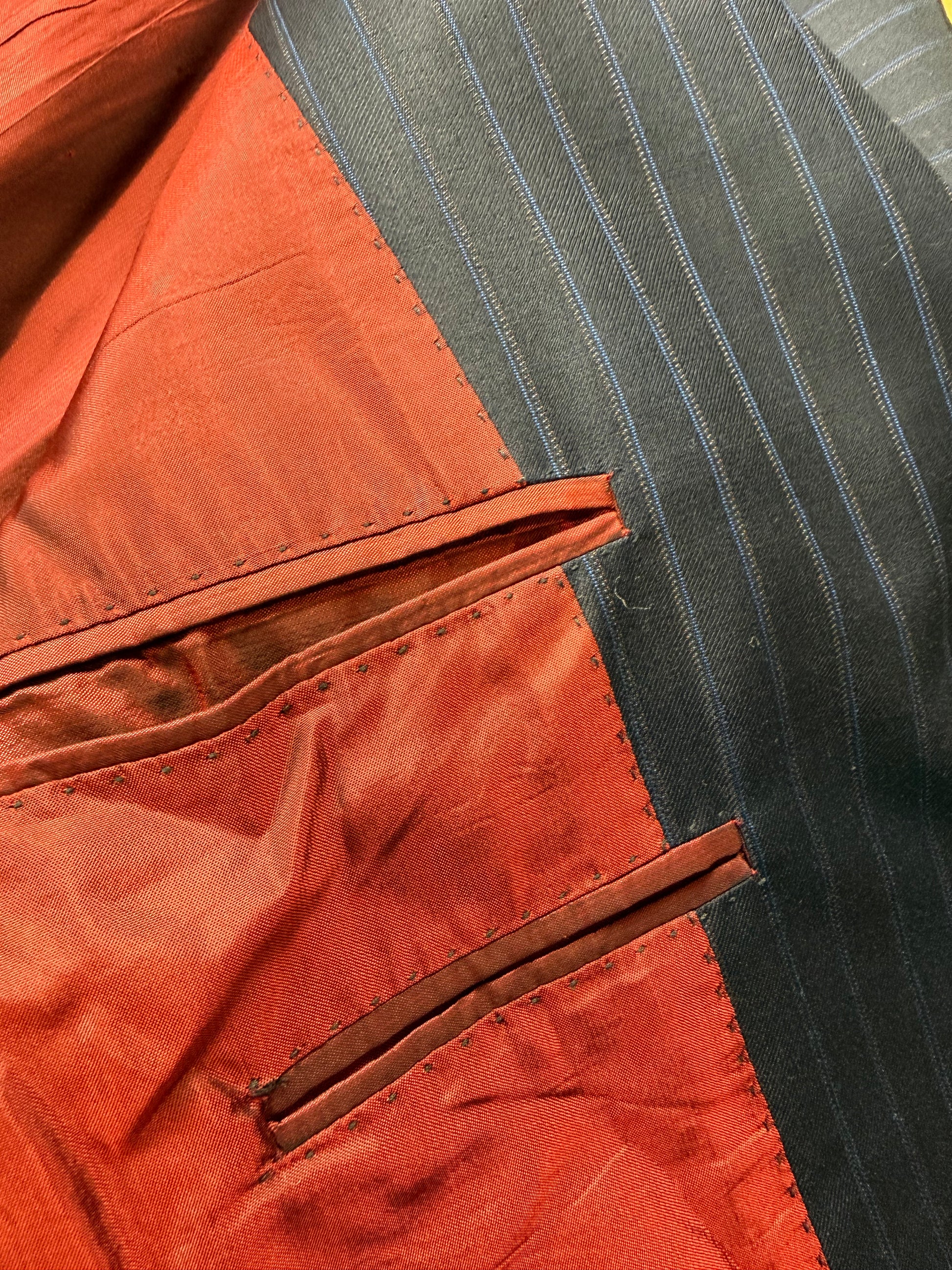 Costruzione di eccellente livello, completamente intelata, con bella fodera di colore rosso scarlatto e dettagli delle cuciture a mano. Asole ai polsi funzionali.