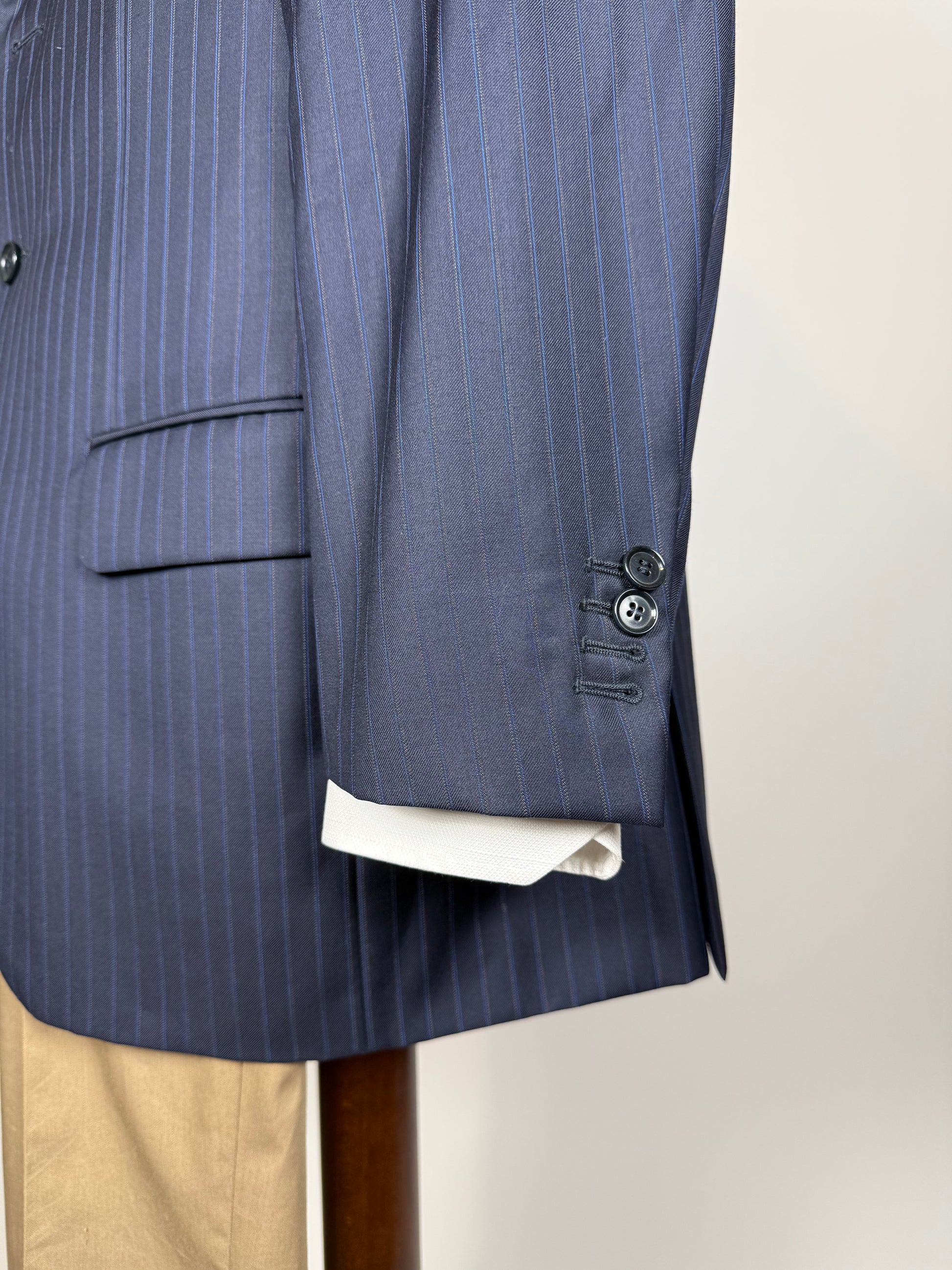 Il capo è confezionato con una lussuosa flanella pettinata di Loro Piana, in pura lana vergine Tasmania super 130S. Colore blu navy gessato.
