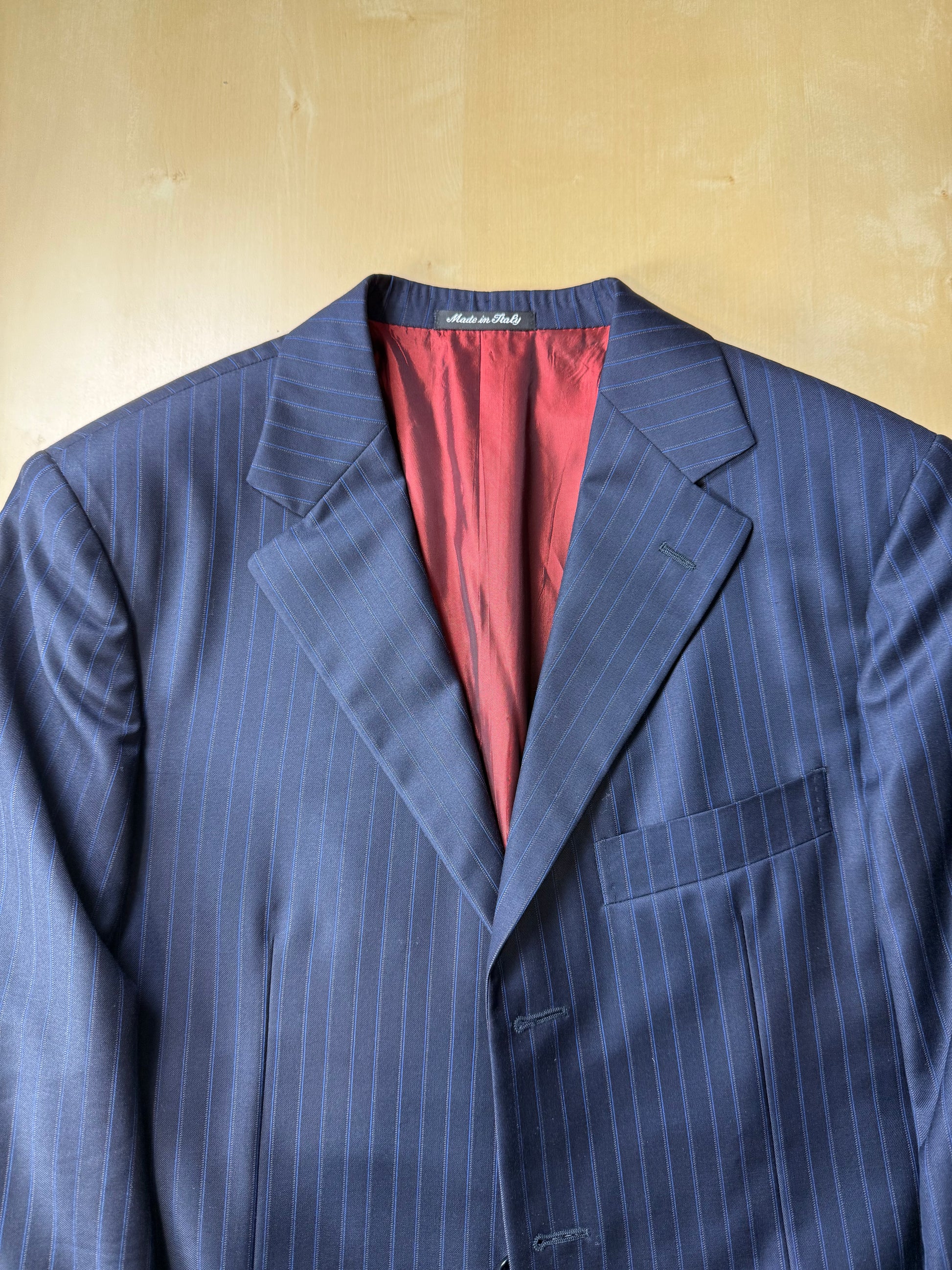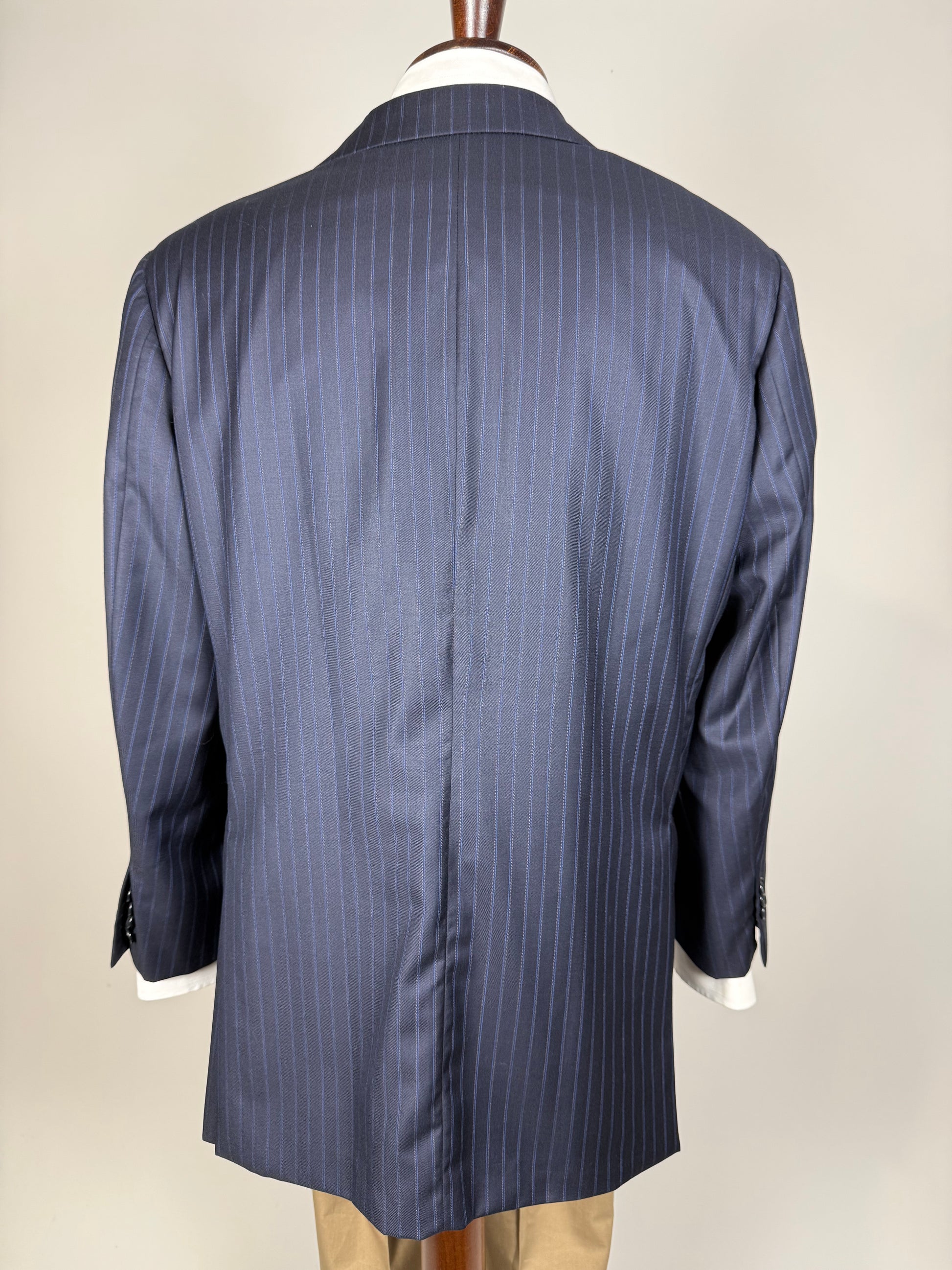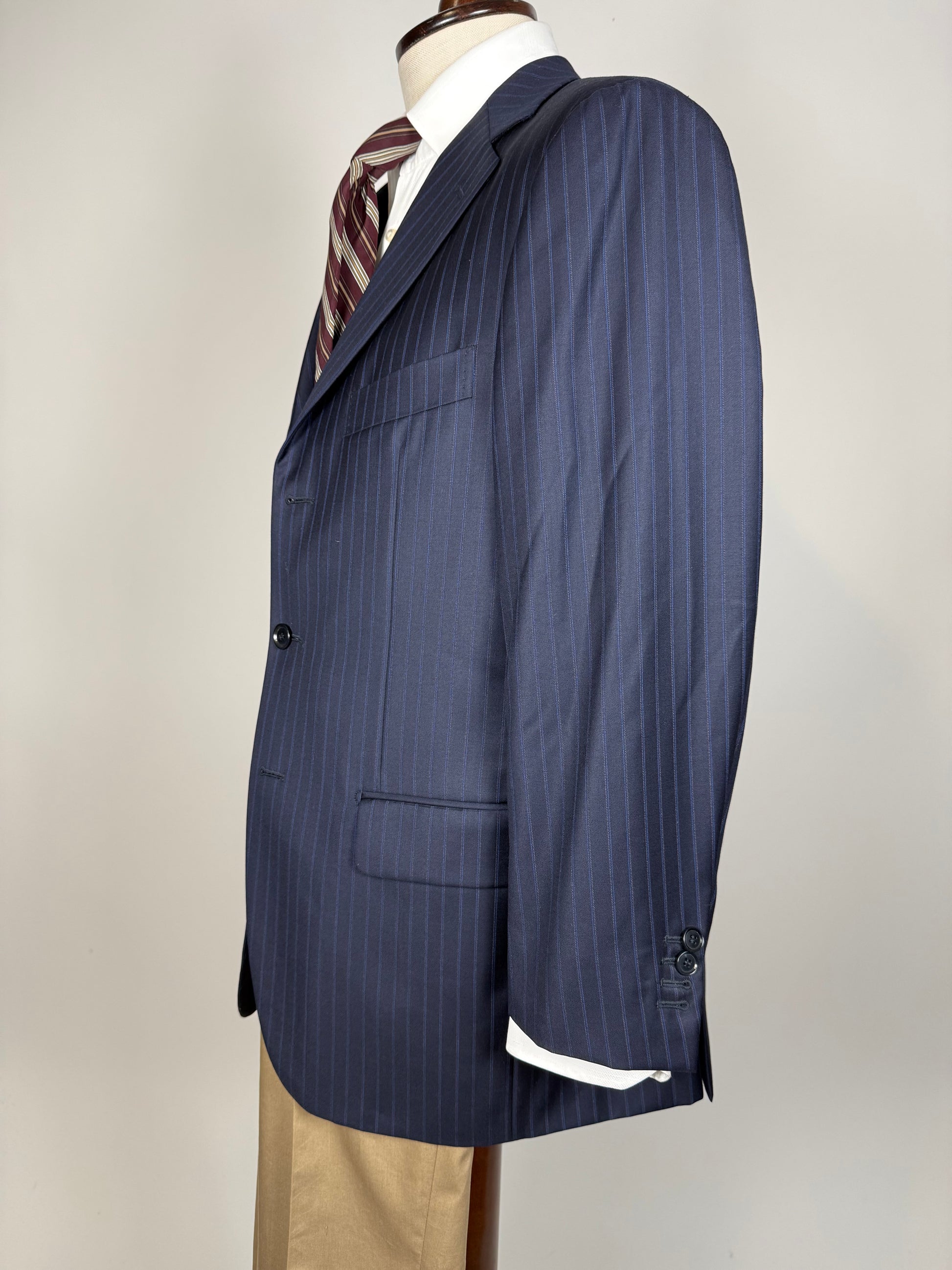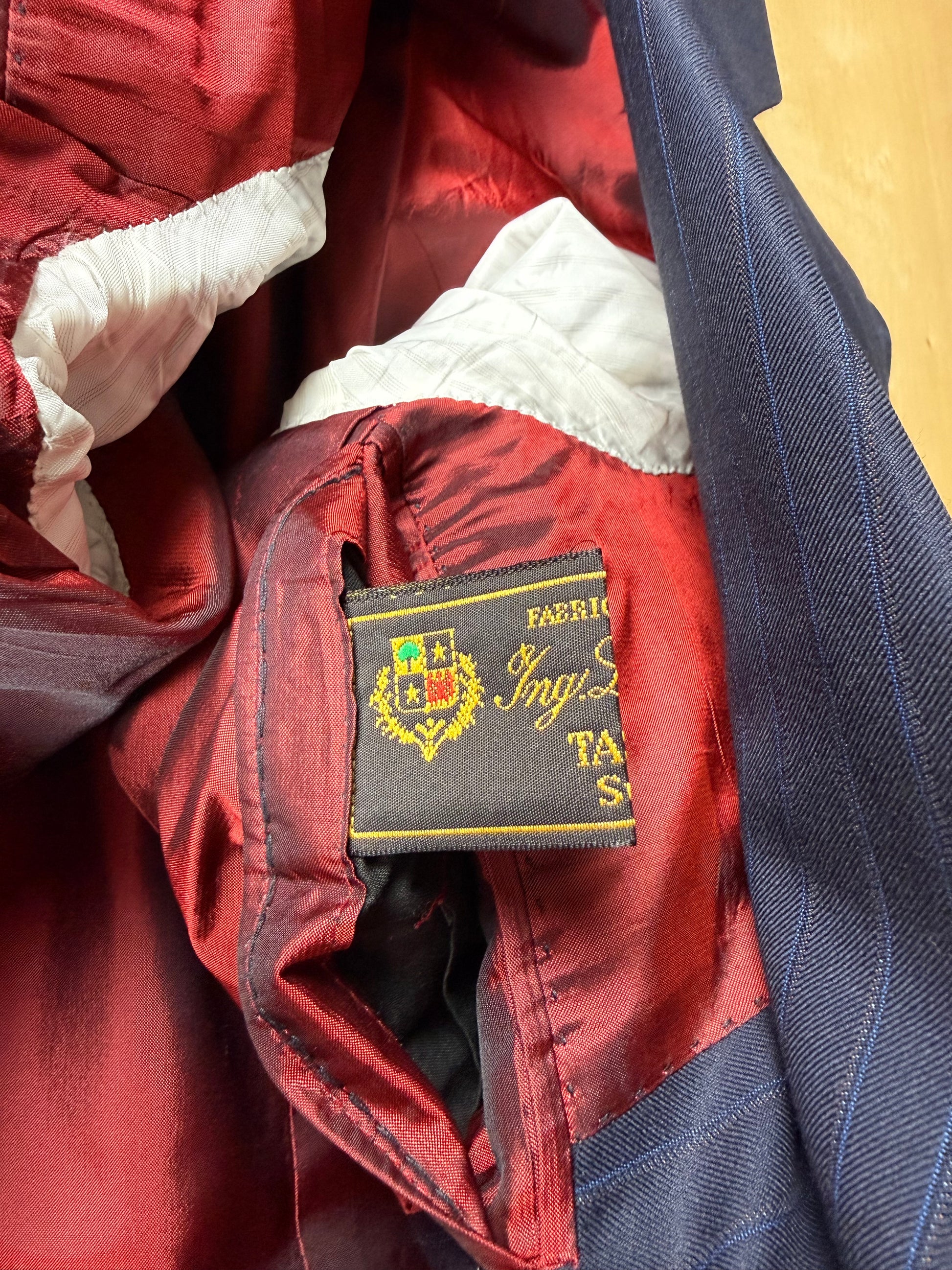 La giacca, indicata in etichetta come taglia 50, è stata leggermente allargata sfruttando gli ampi margini di tessuto presenti all'interno (il che prova l'altissima qualità del capo), e veste ora una taglia 50/52: vedere le misure complete in cm nello schema in ultima foto.