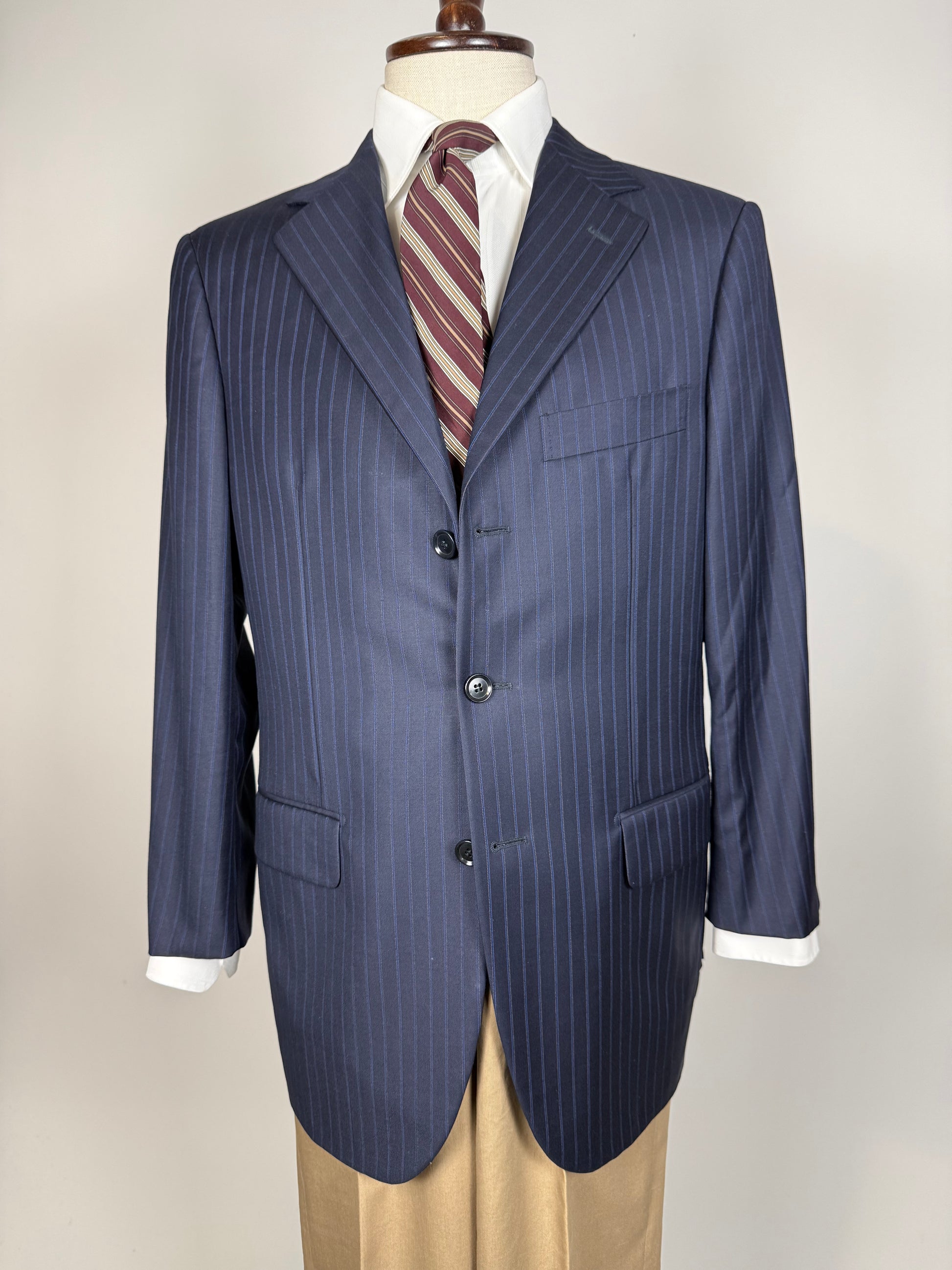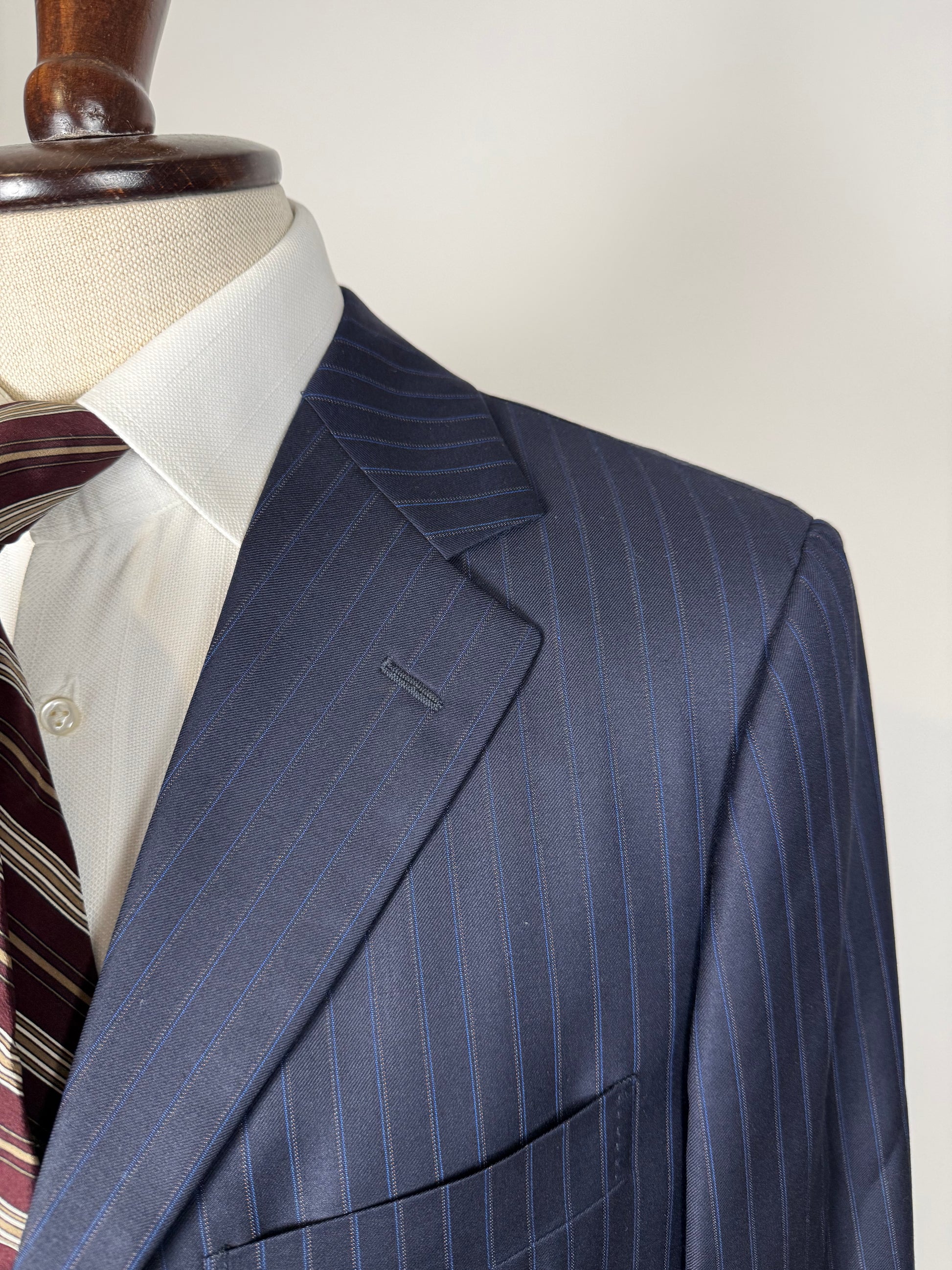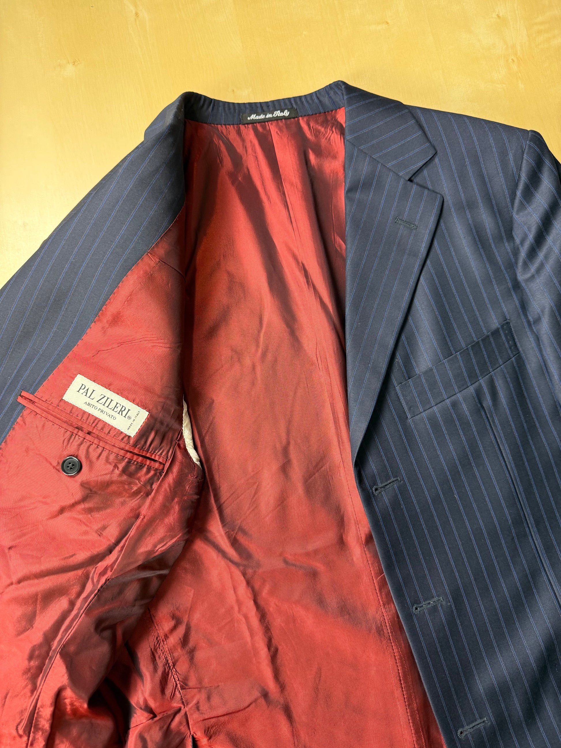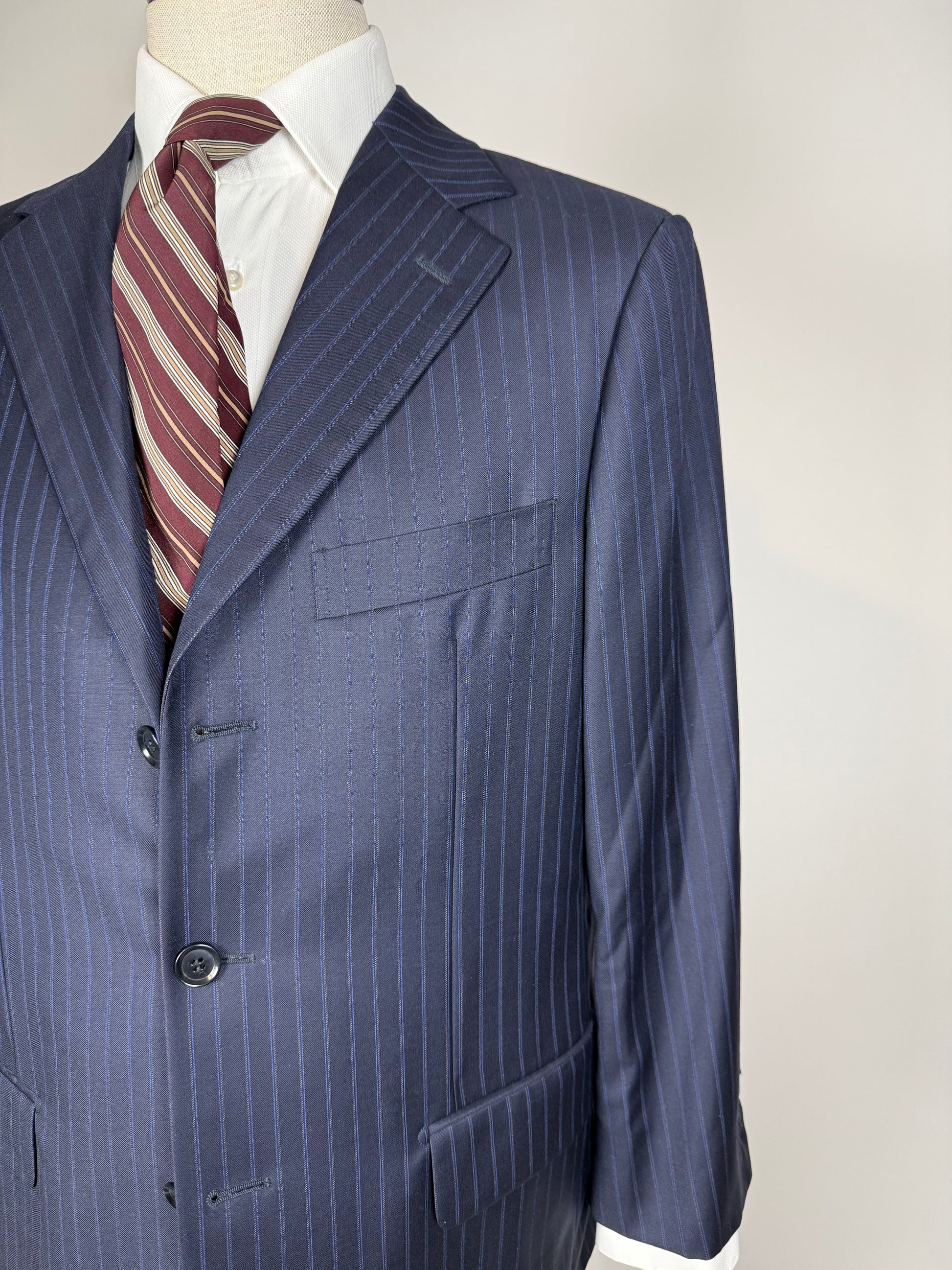 La giacca, indicata in etichetta come taglia 50, è stata leggermente allargata sfruttando gli ampi margini di tessuto presenti all'interno (il che prova l'altissima qualità del capo), e veste ora una taglia 50/52: vedere le misure complete in cm nello schema in ultima foto.