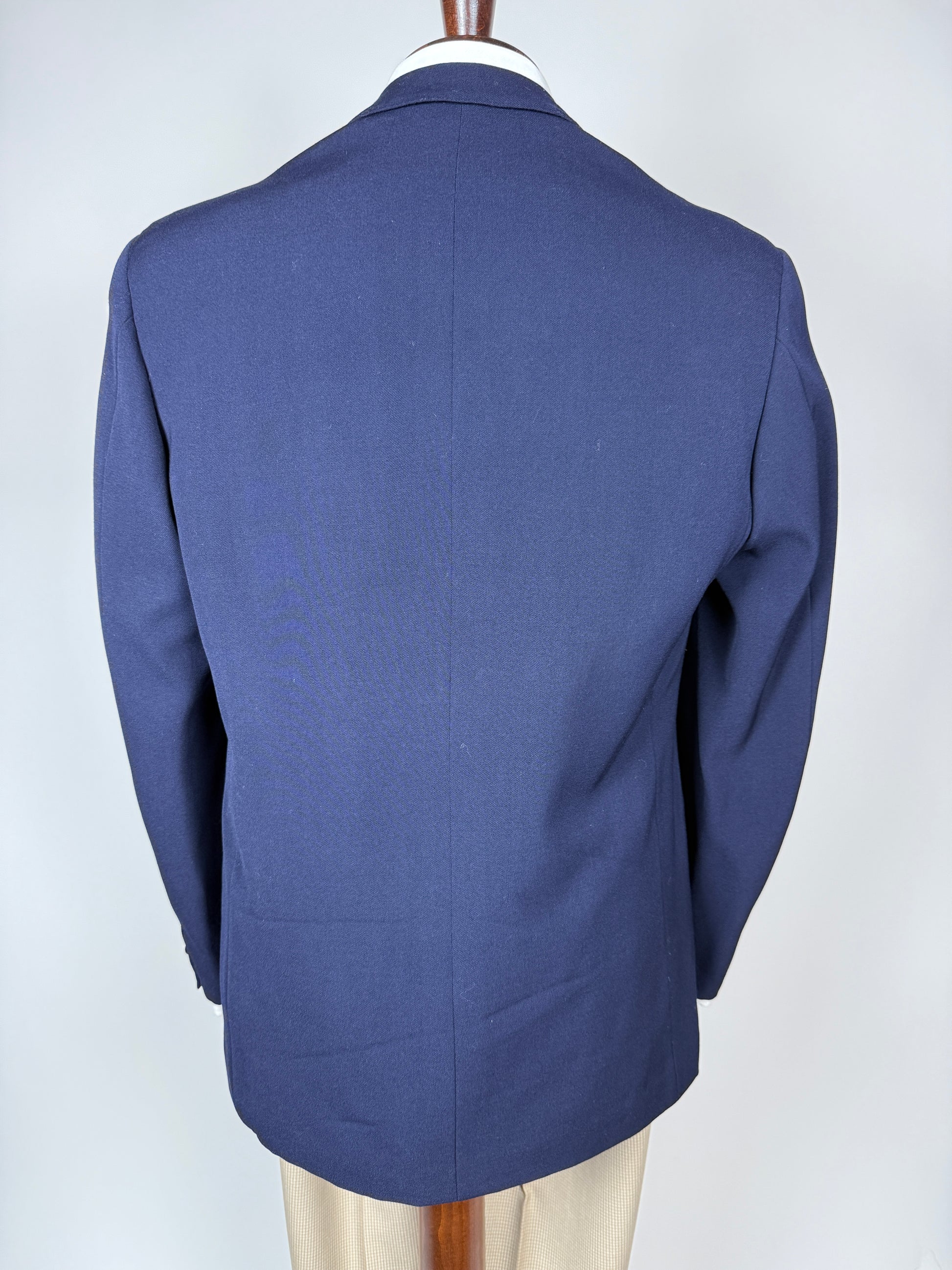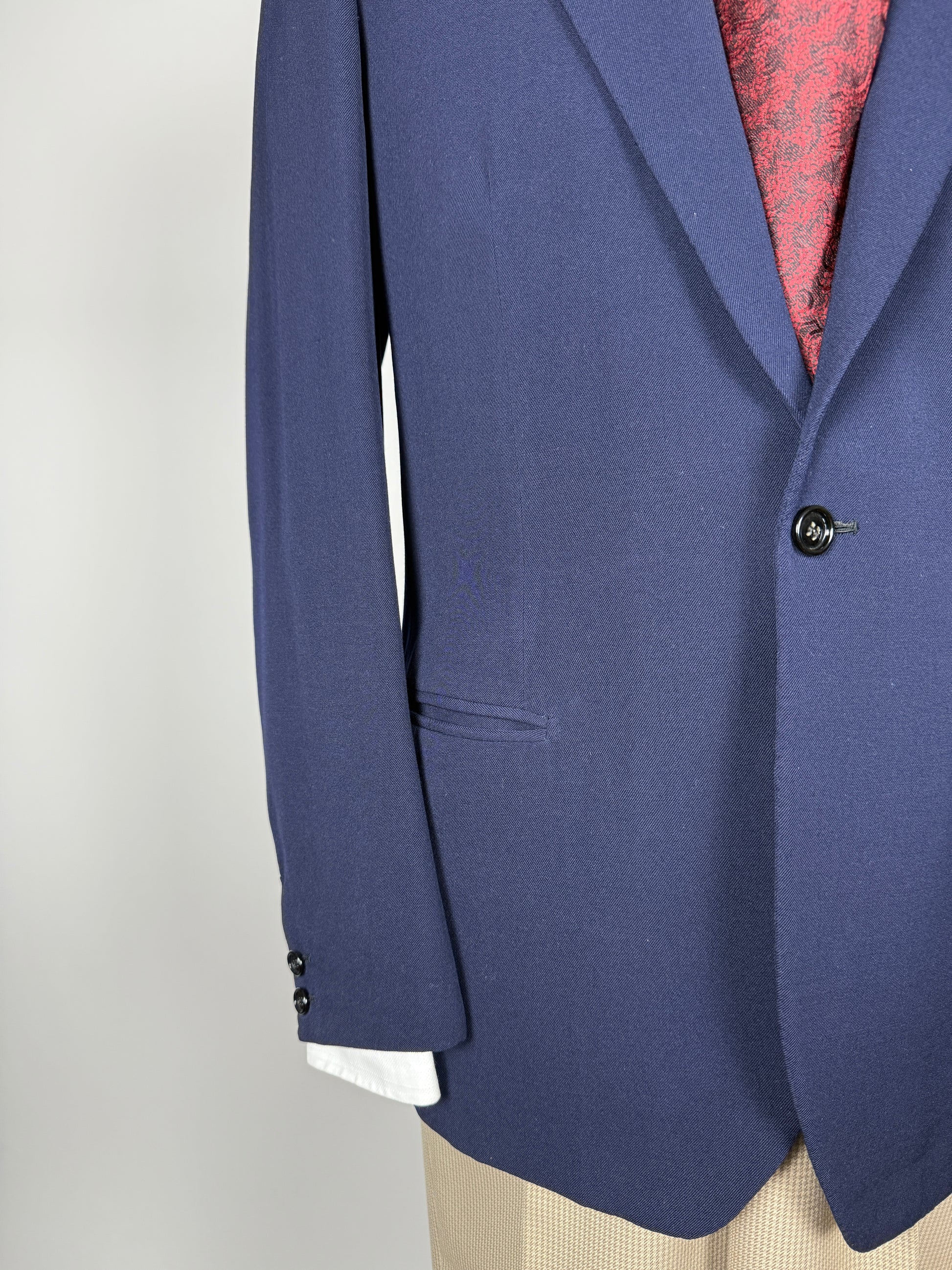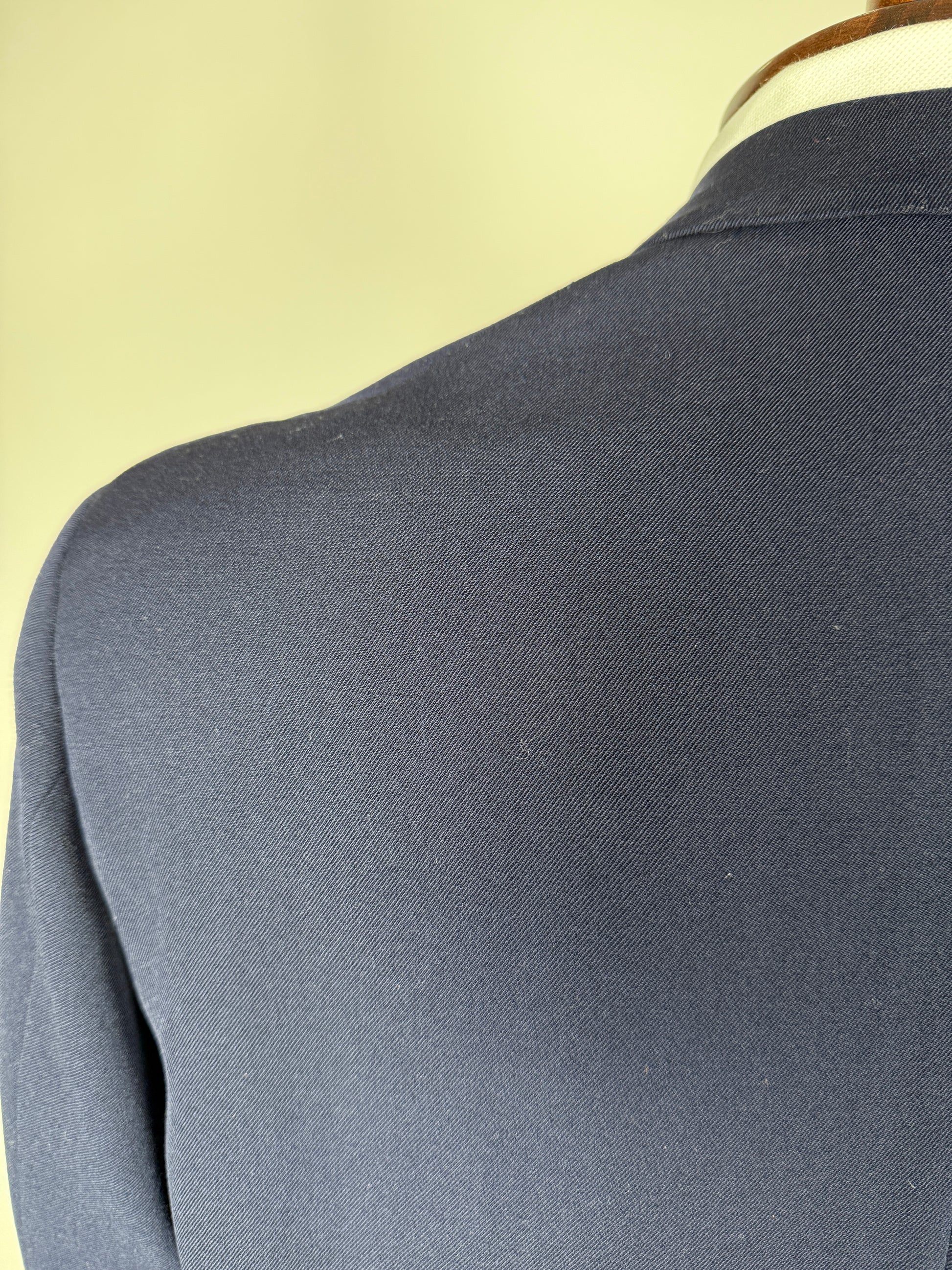 🔎Esempio pratico: la giacca usata come modello in questa guida (v. foto) ha una misura torace di 54 cm. Si tratta della giacca di un abito anni '90 dal taglio generale abbastanza morbido; inoltre, l'abito è un 3 pezzi e va quindi considerato un po' più di margine di vestibilità della giacca per poter indossare comodamente il gilet. Perciò, come da nostra prassi enunciata sopra consideriamo un margine di vestibilità di 6-7 cm: la taglia della giacca sarà quindi 54-6 o 7 = 47 o 48, che corrisponde a una tg. 46/48.
