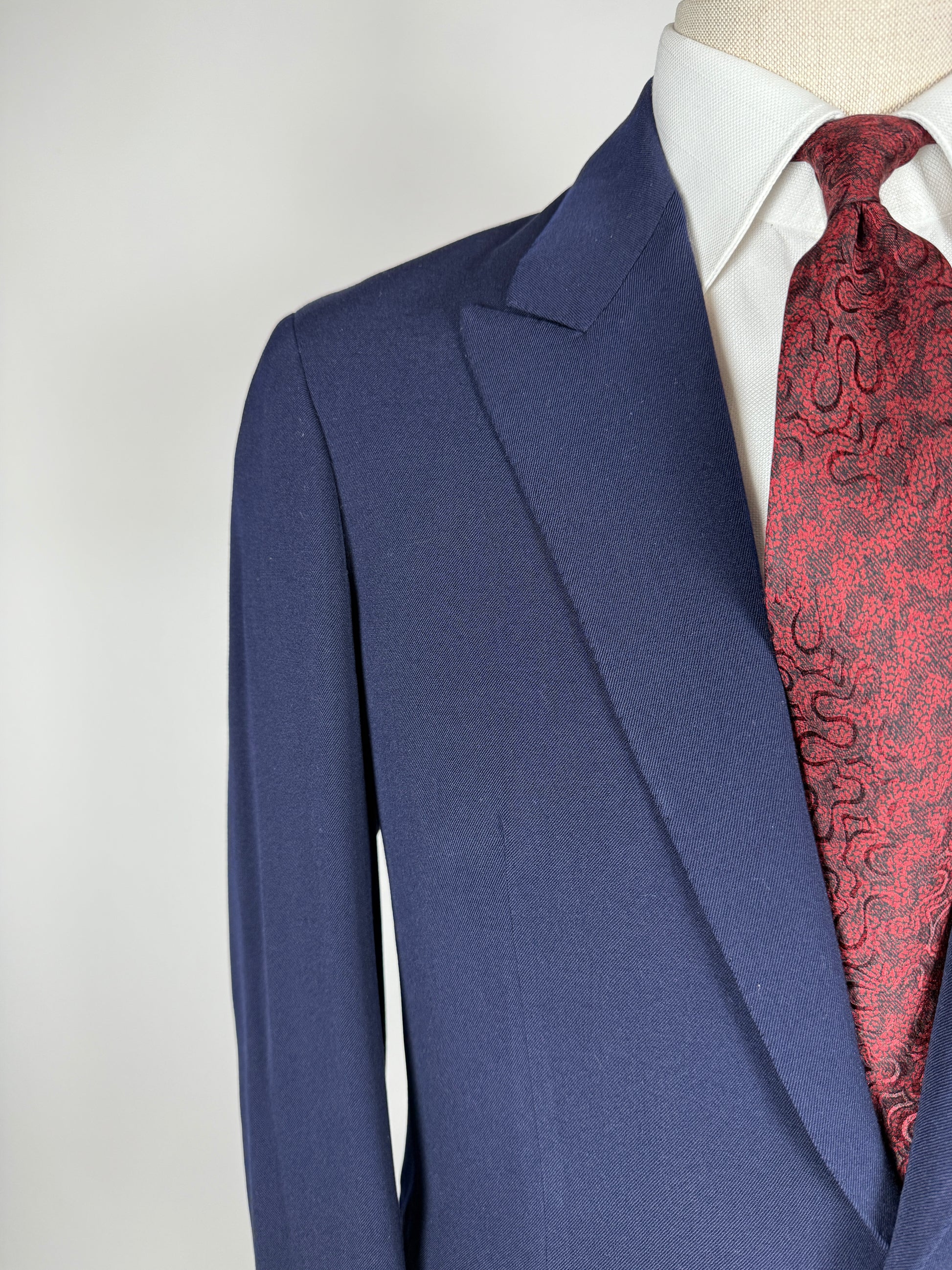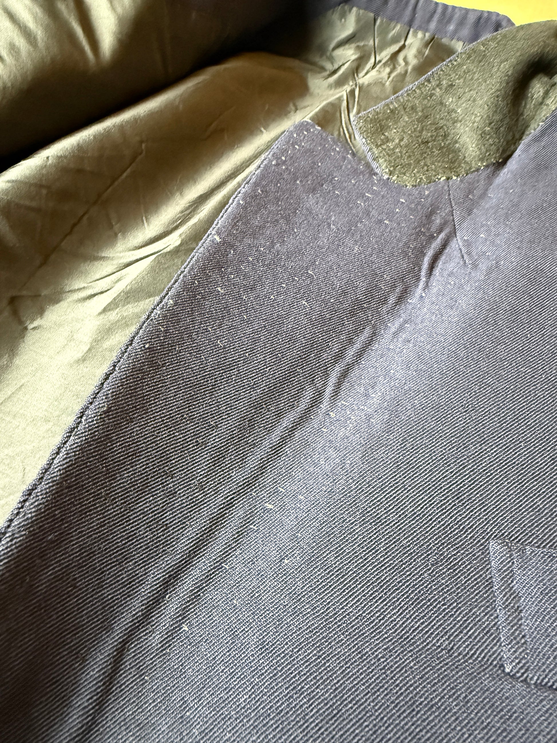 Il tessuto è una flanella pettinata in lana piuttosto pesante, di colore blu navy.