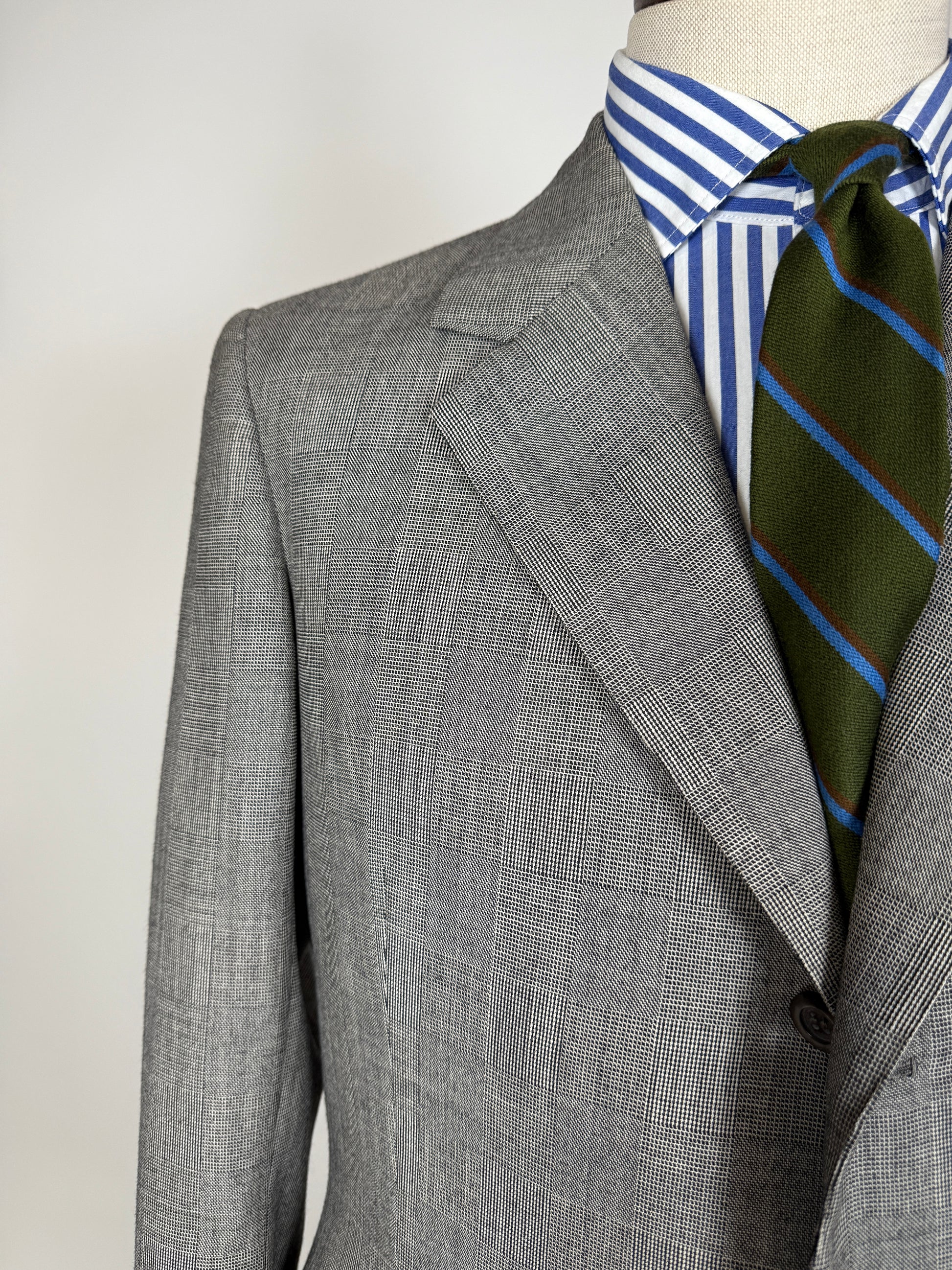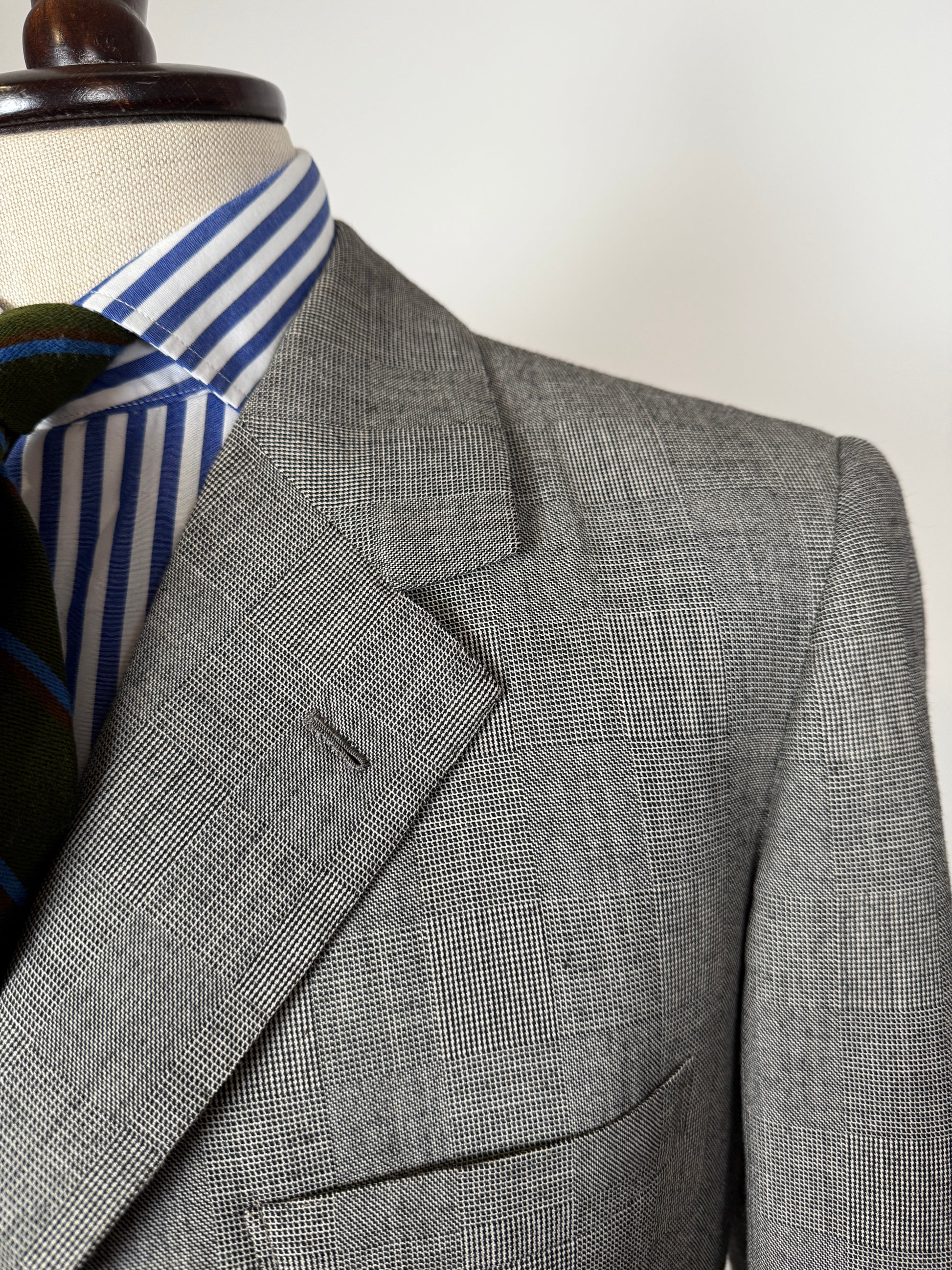 La giacca è completamente intelata a mano e ha una struttura piuttosto netta, con un comodo giromanica tagliato alto come tipico della sartoria del tempo.