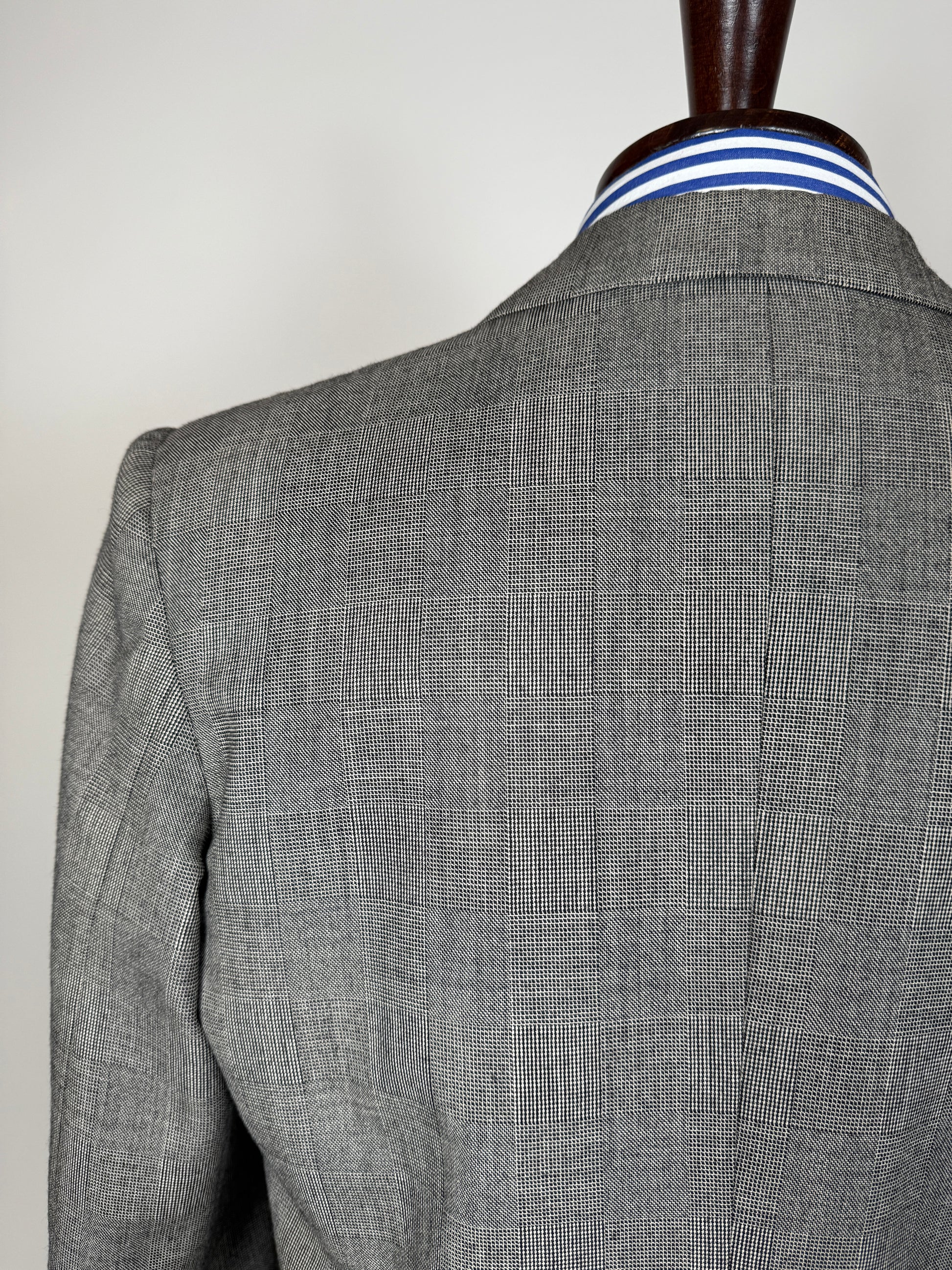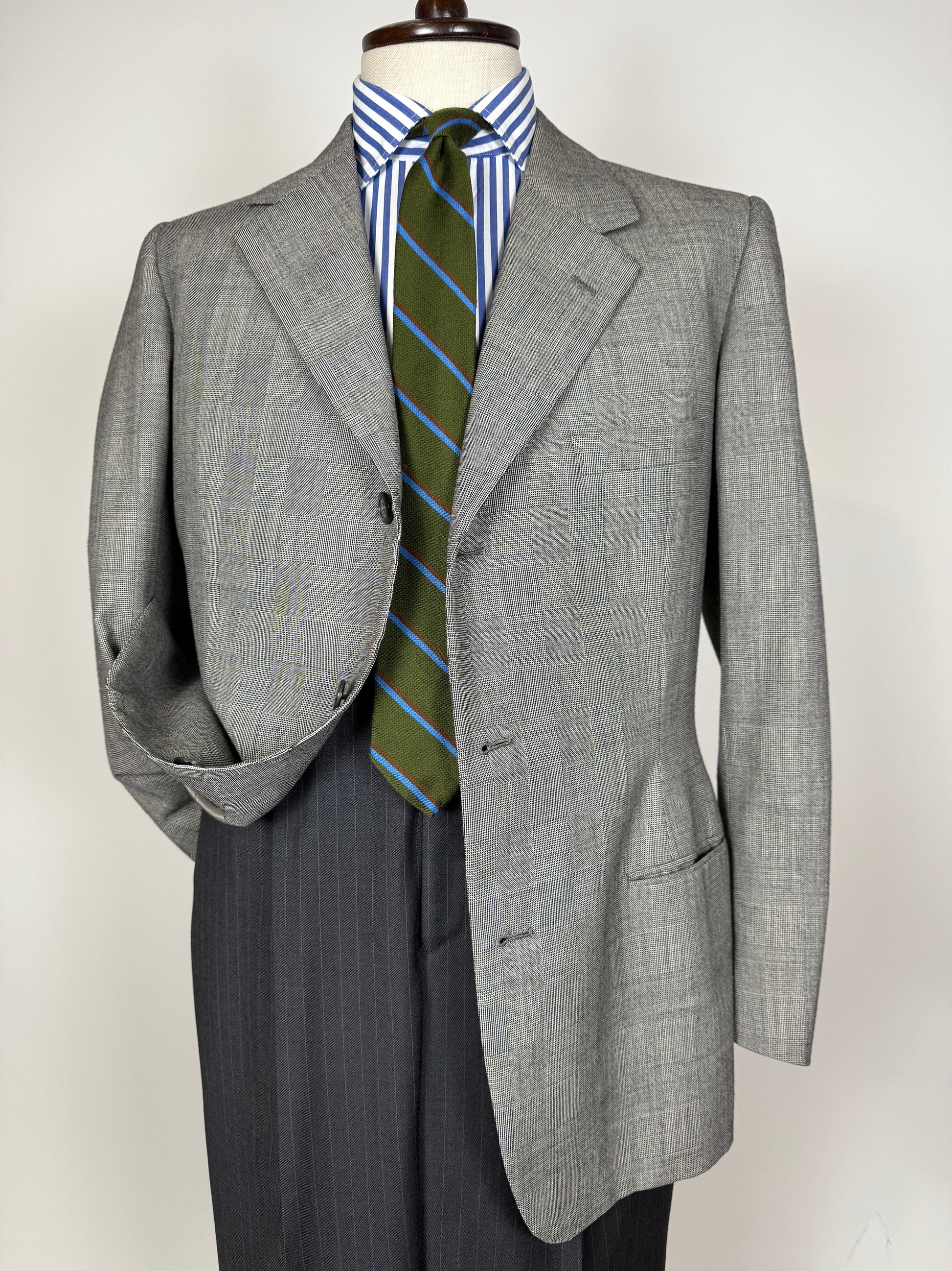 Bellissima giacca di confezione sartoriale anni ‘50/‘60, in pesante lana pettinata con fine fantasia principe di Galles colore grigio medio.