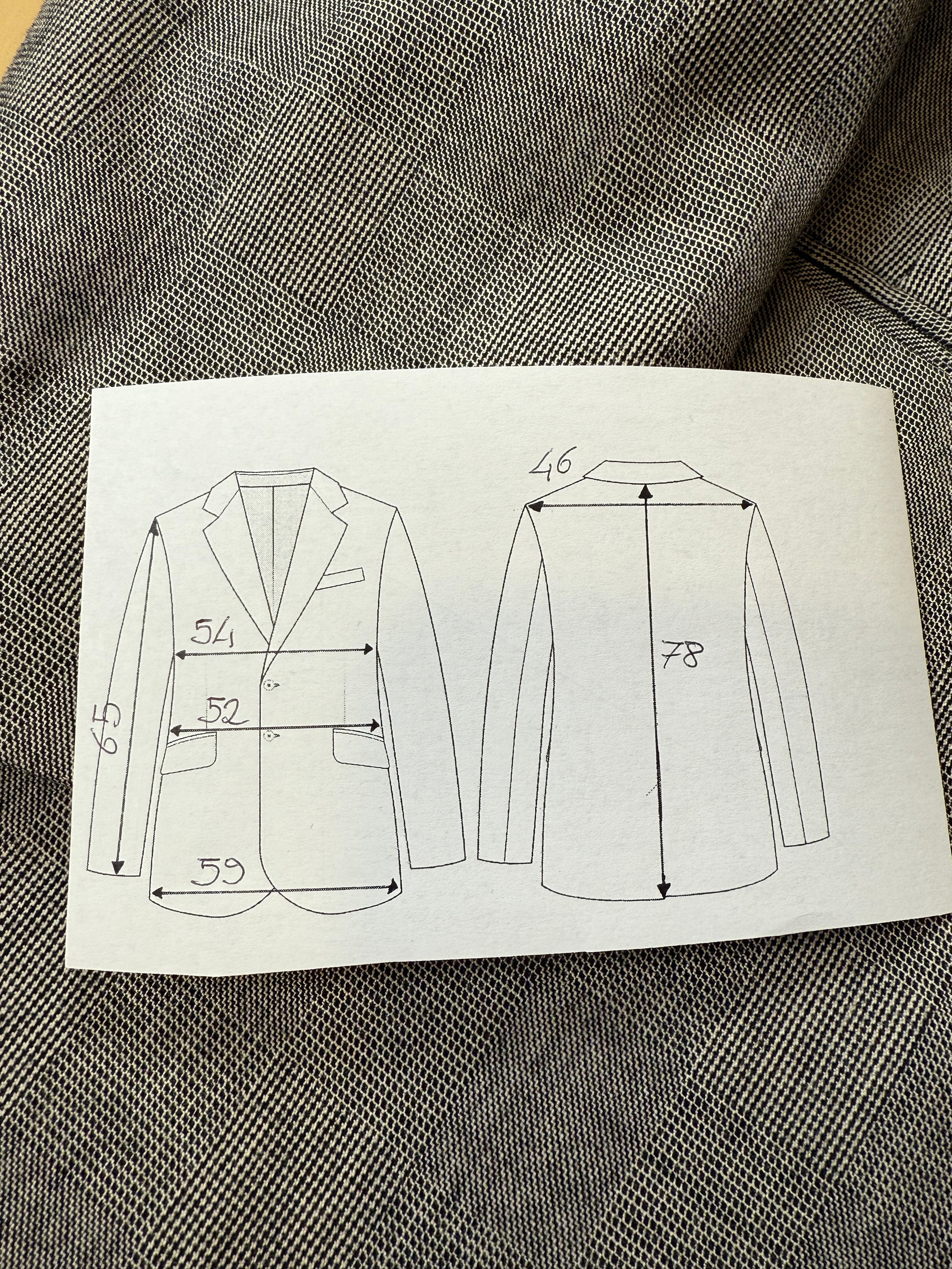🔎Esempio pratico: la giacca usata come modello in questa guida (v. foto) ha una misura torace di 54 cm. Si tratta della giacca di un abito anni '90 dal taglio generale abbastanza morbido; inoltre, l'abito è un 3 pezzi e va quindi considerato un po' più di margine di vestibilità della giacca per poter indossare comodamente il gilet. Perciò, come da nostra prassi enunciata sopra consideriamo un margine di vestibilità di 6-7 cm: la taglia della giacca sarà quindi 54-6 o 7 = 47 o 48, che corrisponde a una tg. 46/48.