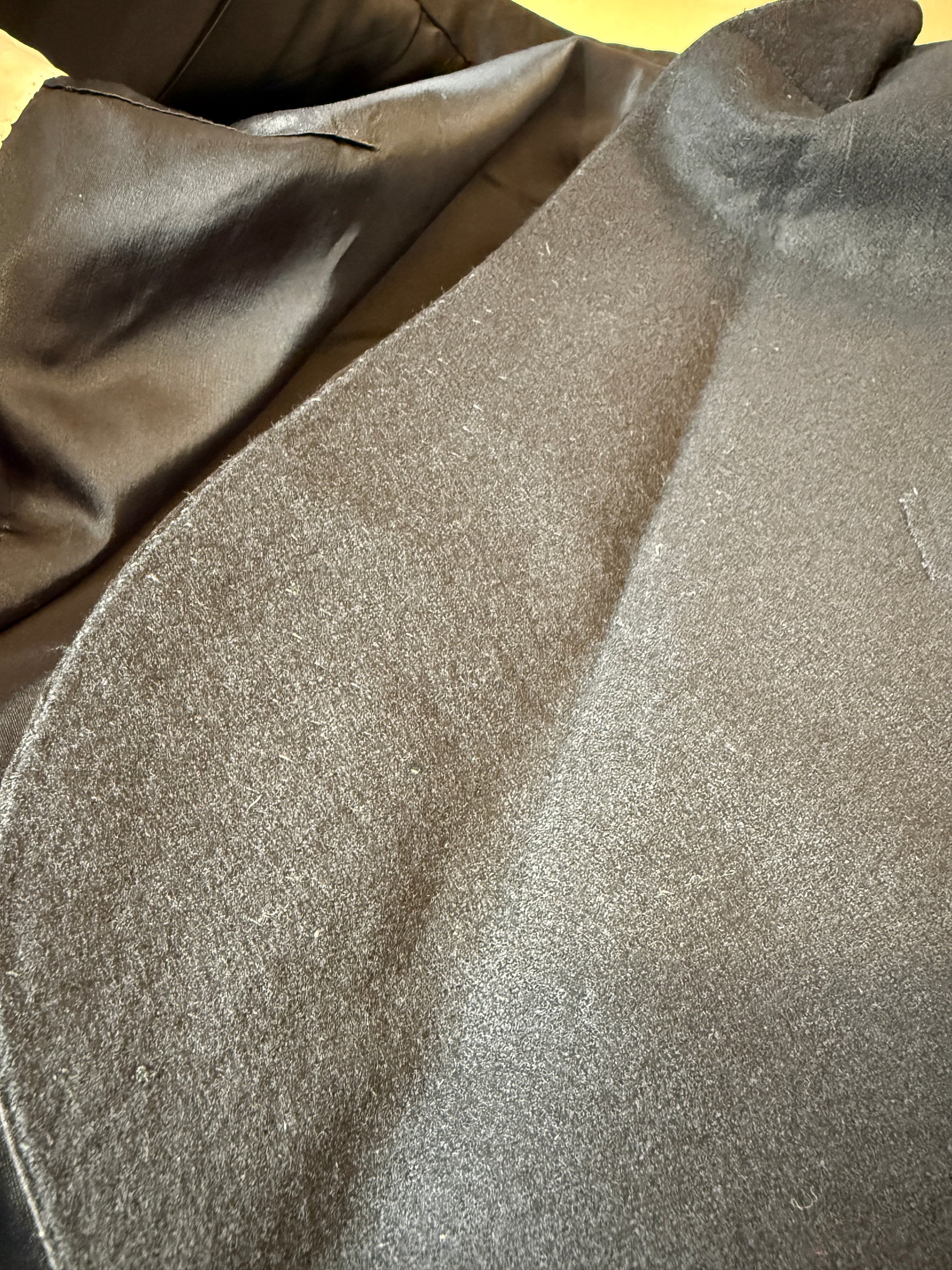 Tessuto barathea di lana cardata piuttosto pesante, colore nero. Abbastanza pesante è anche la costruzione dell'intelatura interna (naturalmente full canvas) e quindi la struttura generale della giacca.