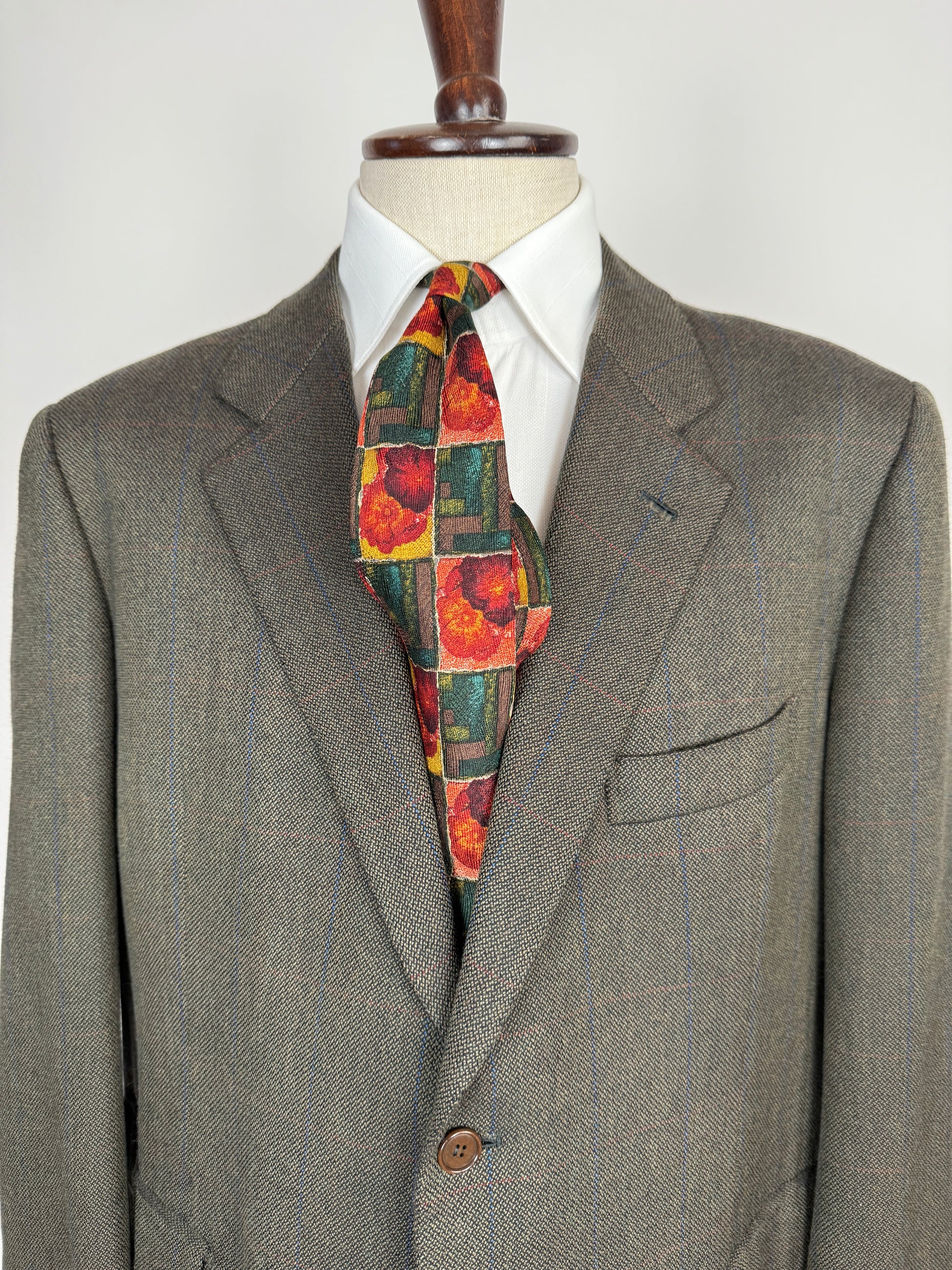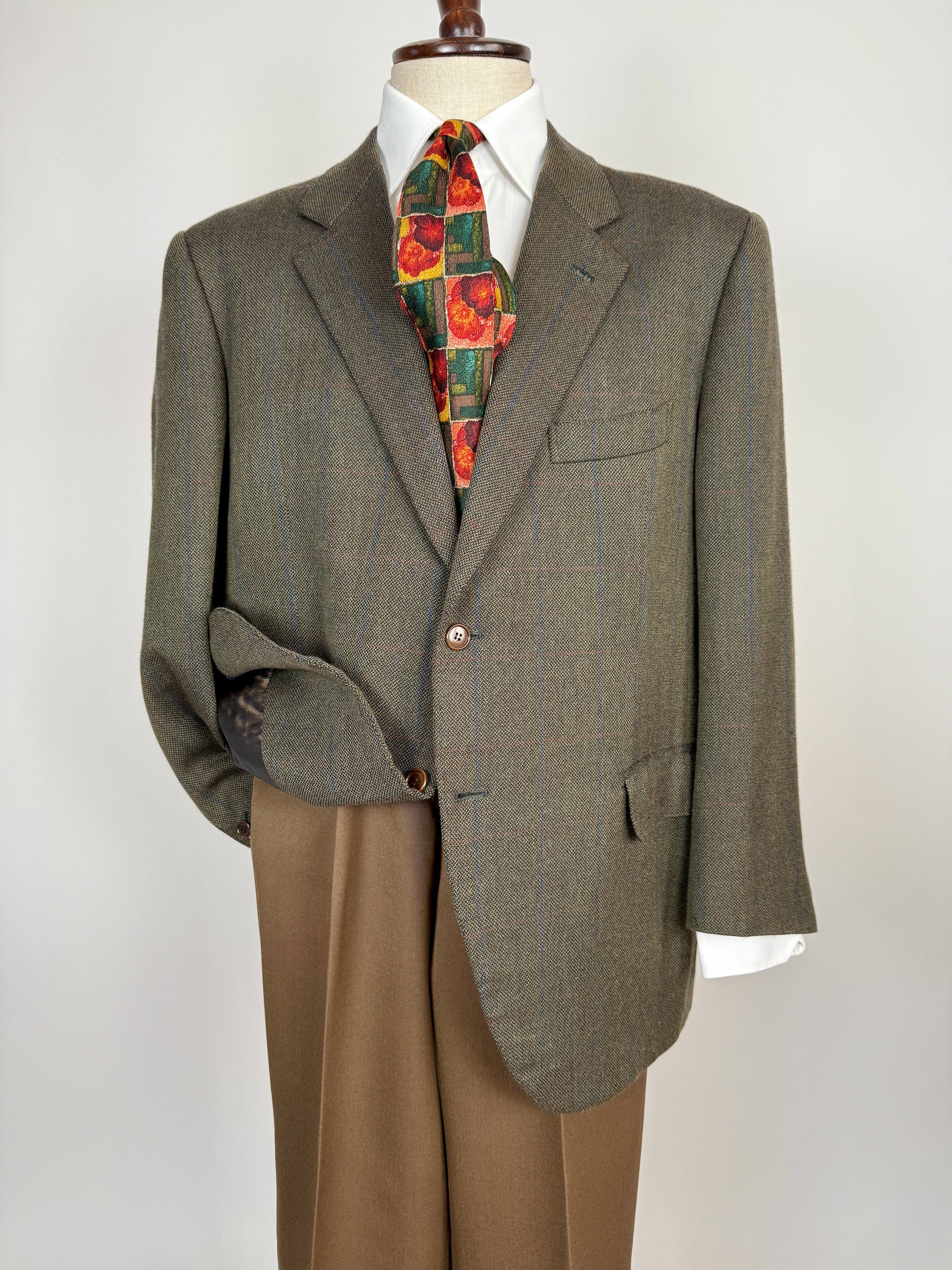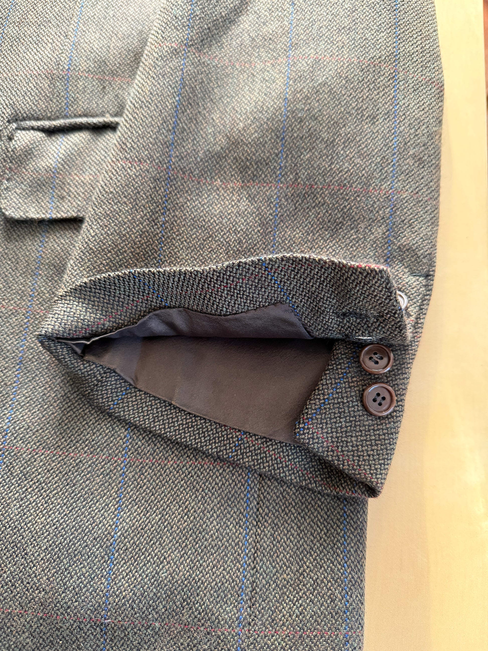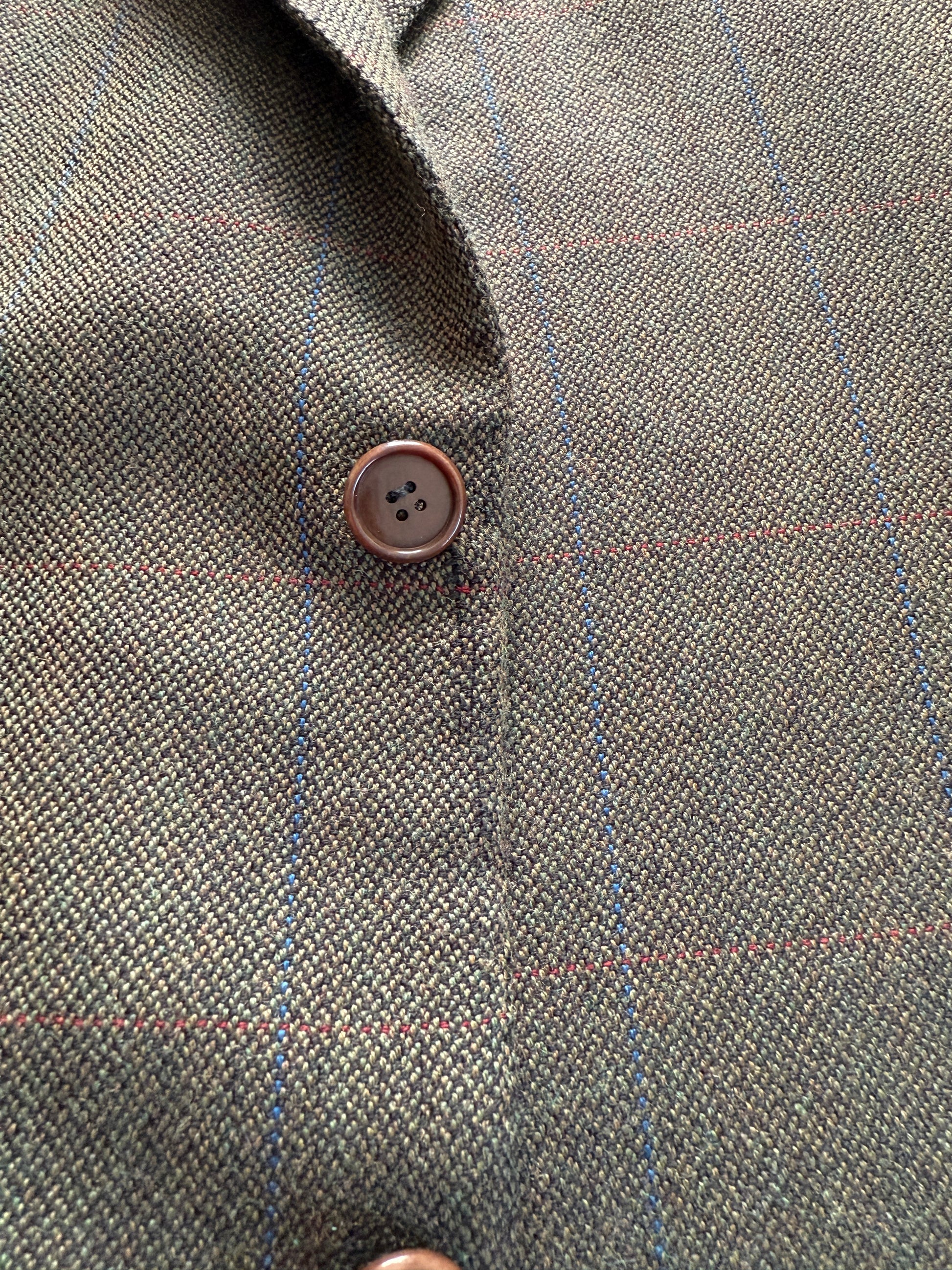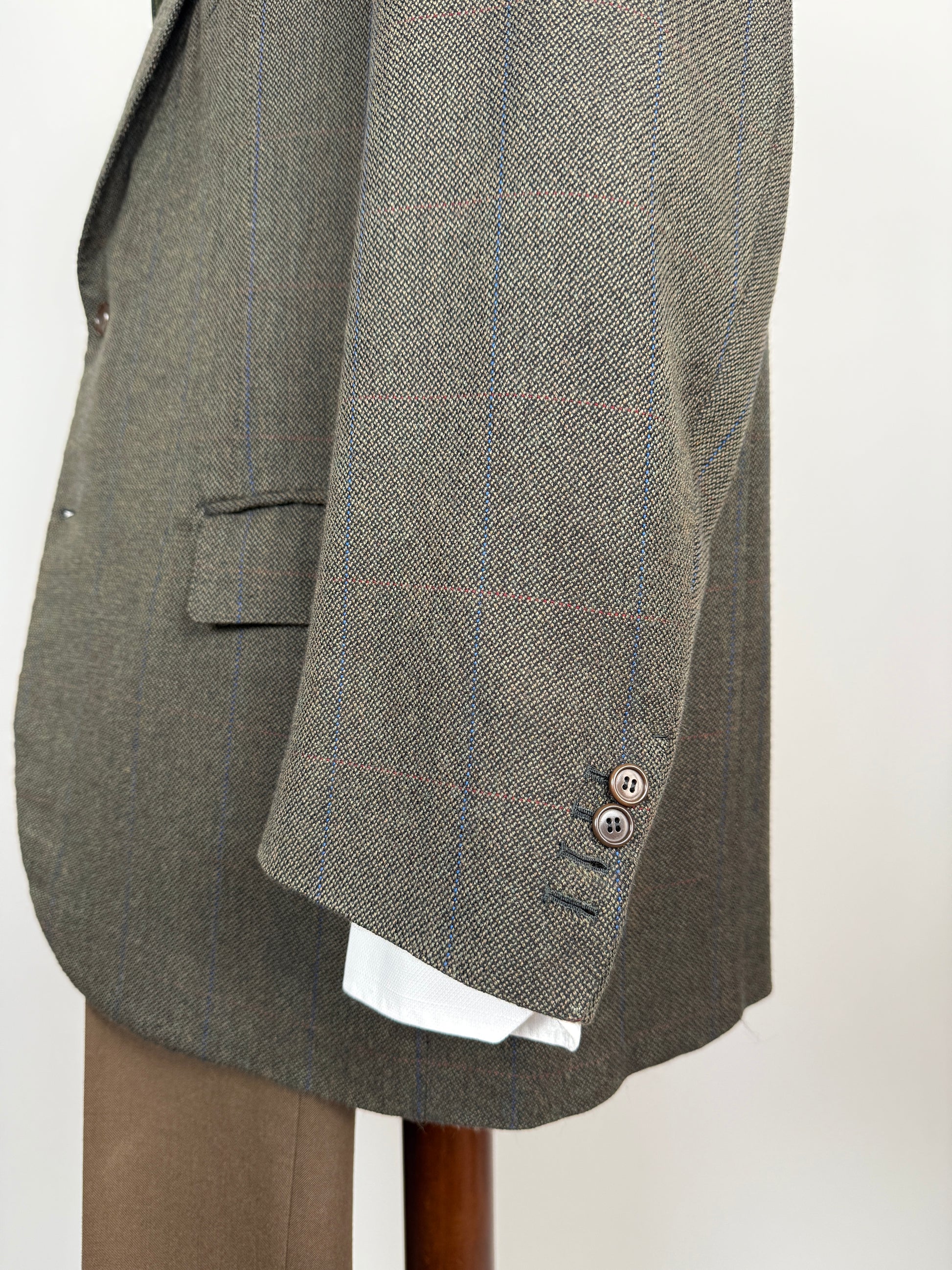 Giacca sartoriale su misura datata 2005, in un morbido e caldo tessuto invernale colore verde scuro mélange con fantasia finestrata a riga rossa e blu.