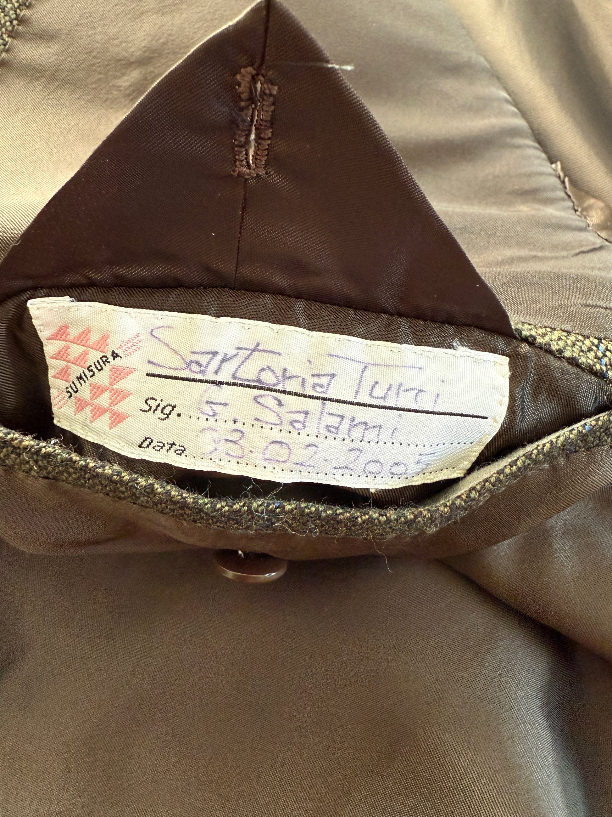 🔎Esempio pratico: la giacca usata come modello in questa guida (v. foto) ha una misura torace di 54 cm. Si tratta della giacca di un abito anni '90 dal taglio generale abbastanza morbido; inoltre, l'abito è un 3 pezzi e va quindi considerato un po' più di margine di vestibilità della giacca per poter indossare comodamente il gilet. Perciò, come da nostra prassi enunciata sopra consideriamo un margine di vestibilità di 6-7 cm: la taglia della giacca sarà quindi 54-6 o 7 = 47 o 48, che corrisponde a una tg. 46/48.