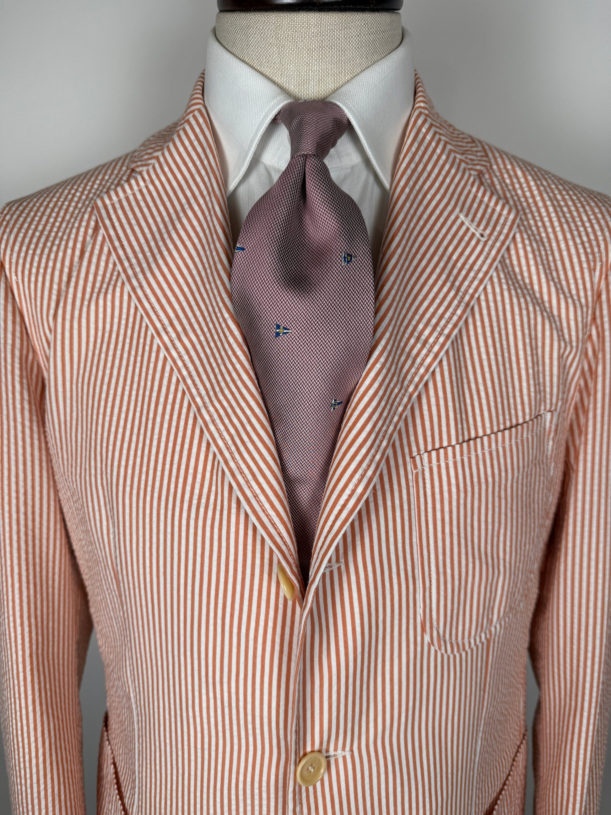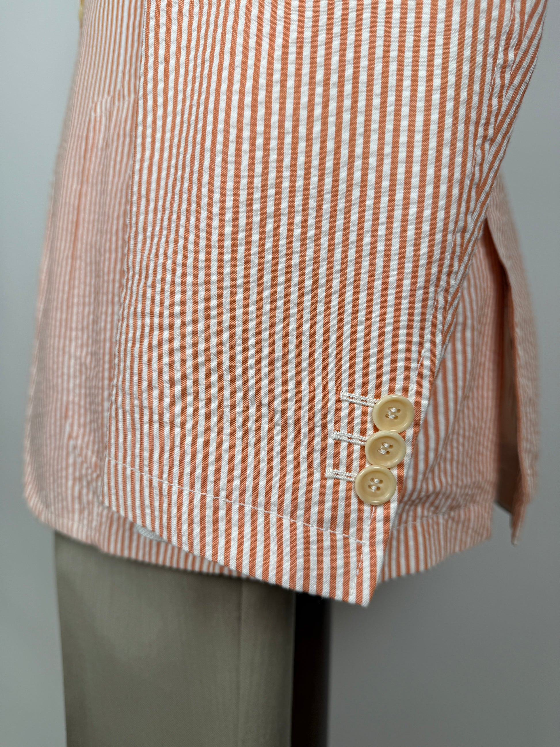 Moderna giacca estiva Tagliatore in bel tessuto seersucker a riga rosso/rosa salmone.