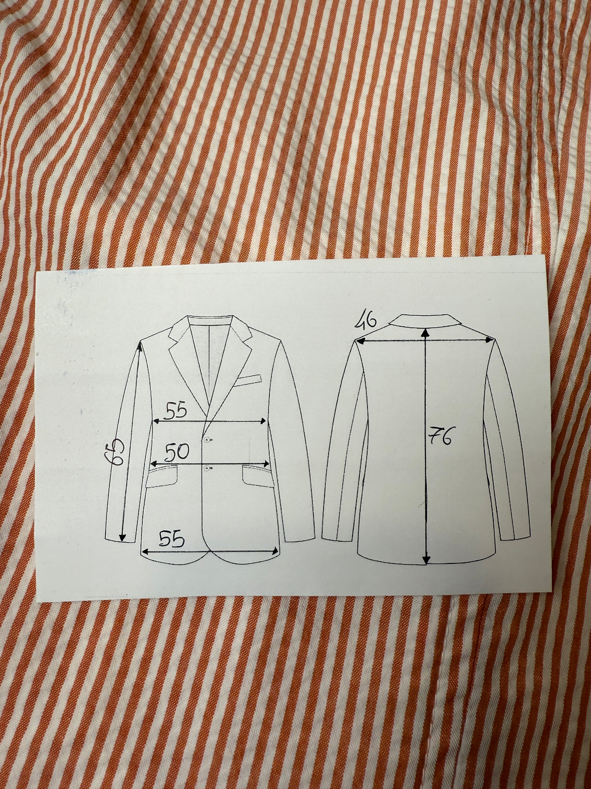 🔎Esempio pratico: la giacca usata come modello in questa guida (v. foto) ha una misura torace di 54 cm. Si tratta della giacca di un abito anni '90 dal taglio generale abbastanza morbido; inoltre, l'abito è un 3 pezzi e va quindi considerato un po' più di margine di vestibilità della giacca per poter indossare comodamente il gilet. Perciò, come da nostra prassi enunciata sopra consideriamo un margine di vestibilità di 6-7 cm: la taglia della giacca sarà quindi 54-6 o 7 = 47 o 48, che corrisponde a una tg. 46/48.