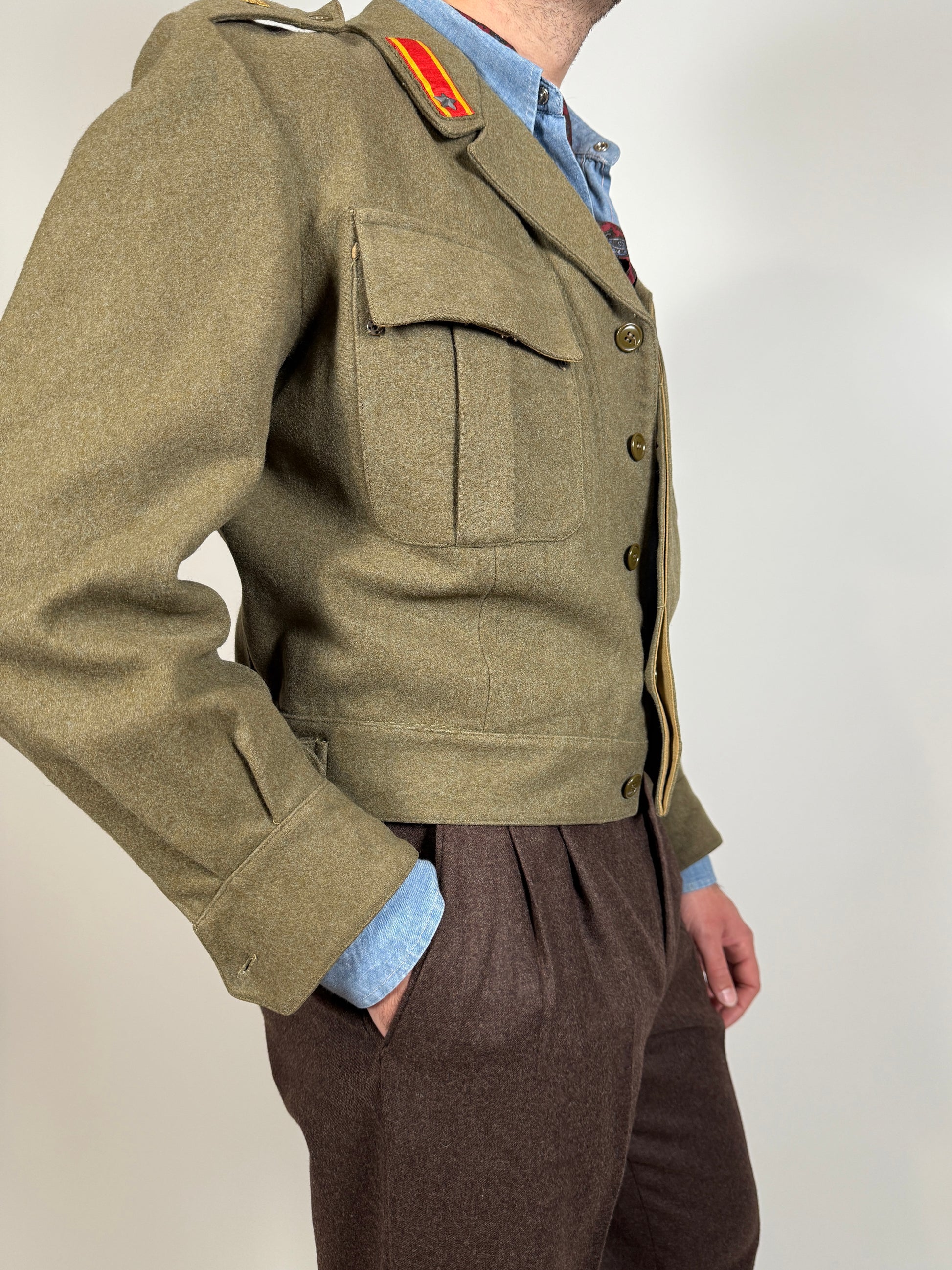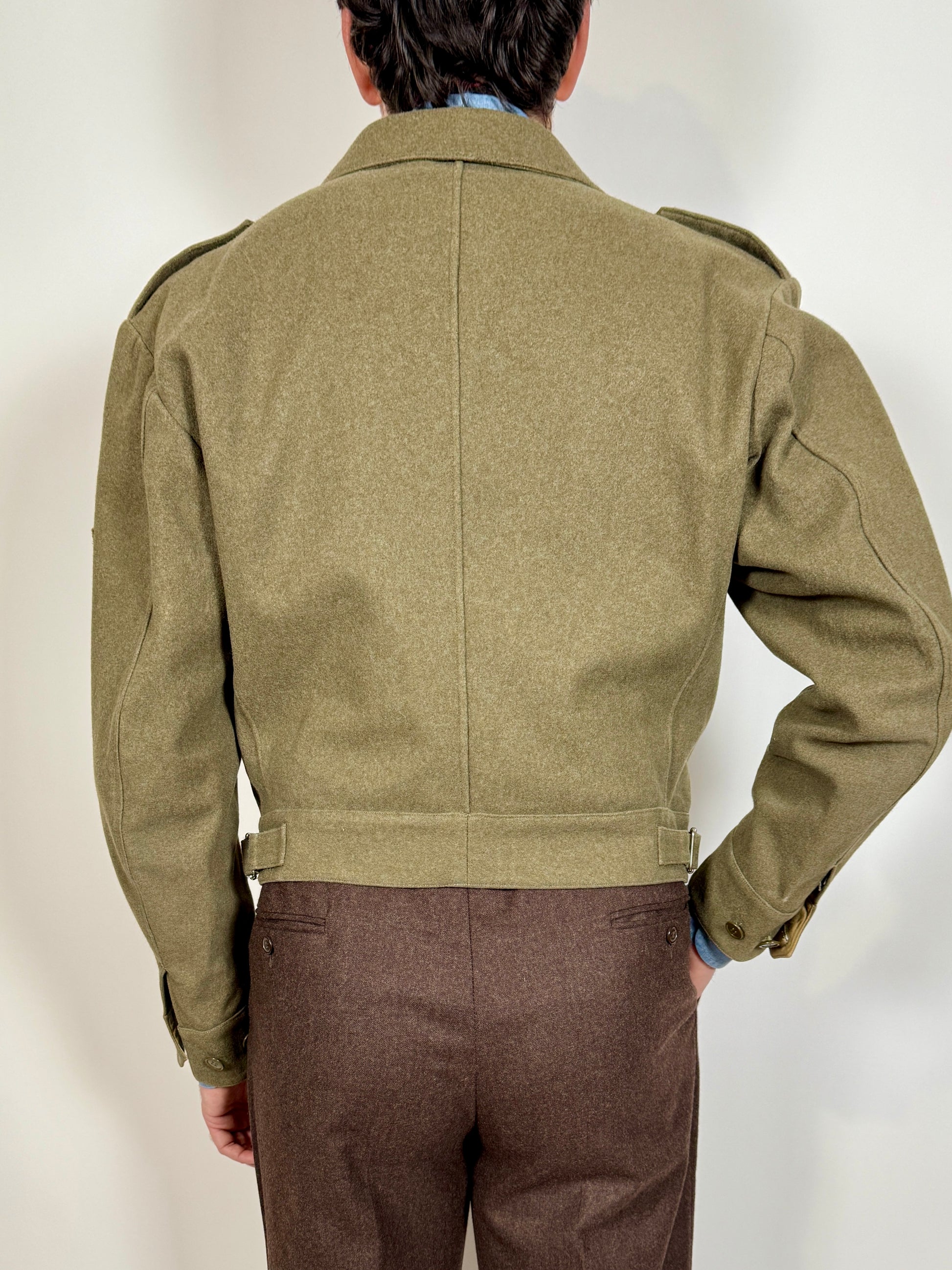 Si tratta di una giacca dal bellissimo taglio molto corto, sopra alla vita, ispirata appunto ai battle dress alleati (BD britannici della II guerra mondiale e Ike jackets USA).