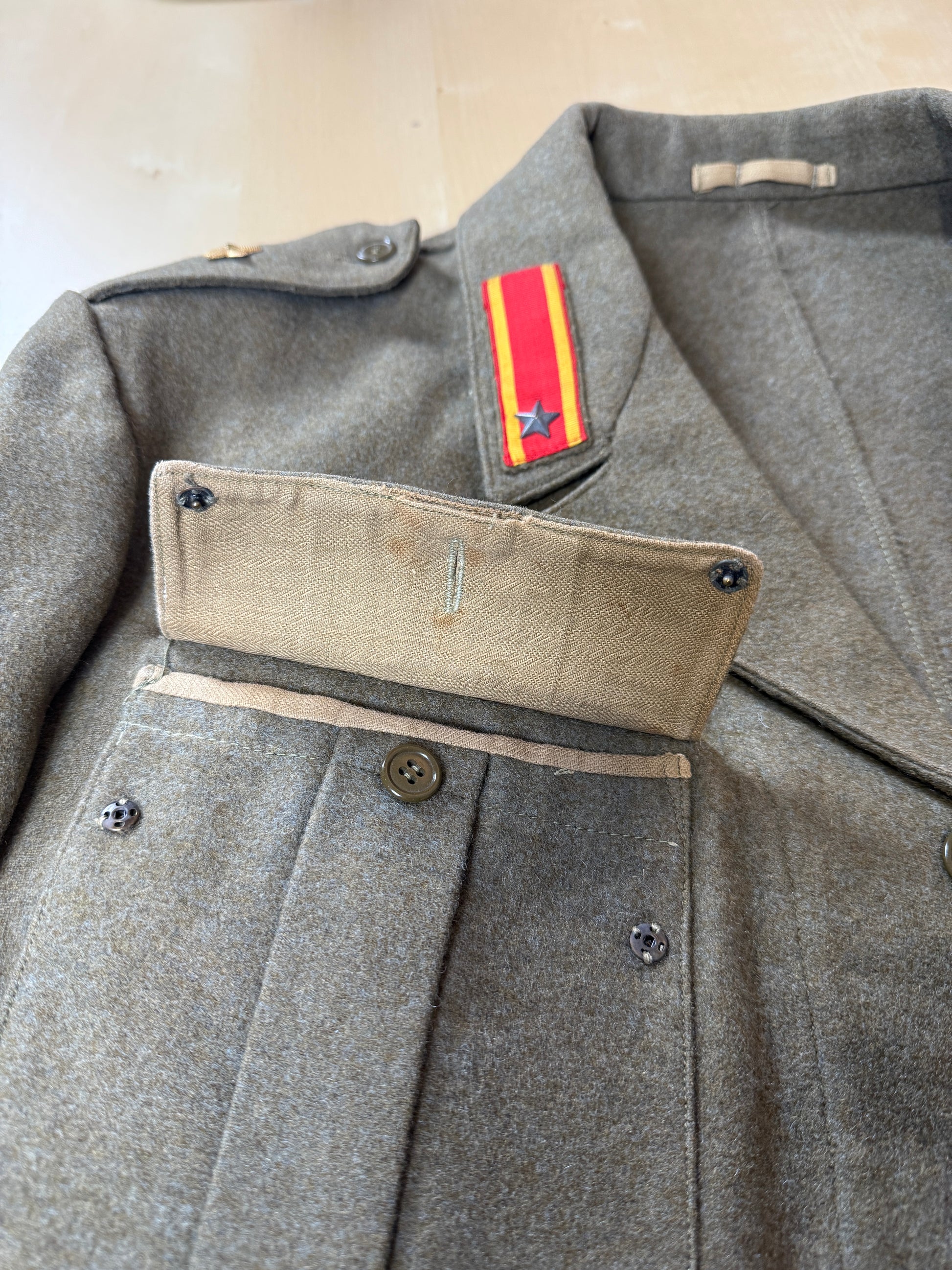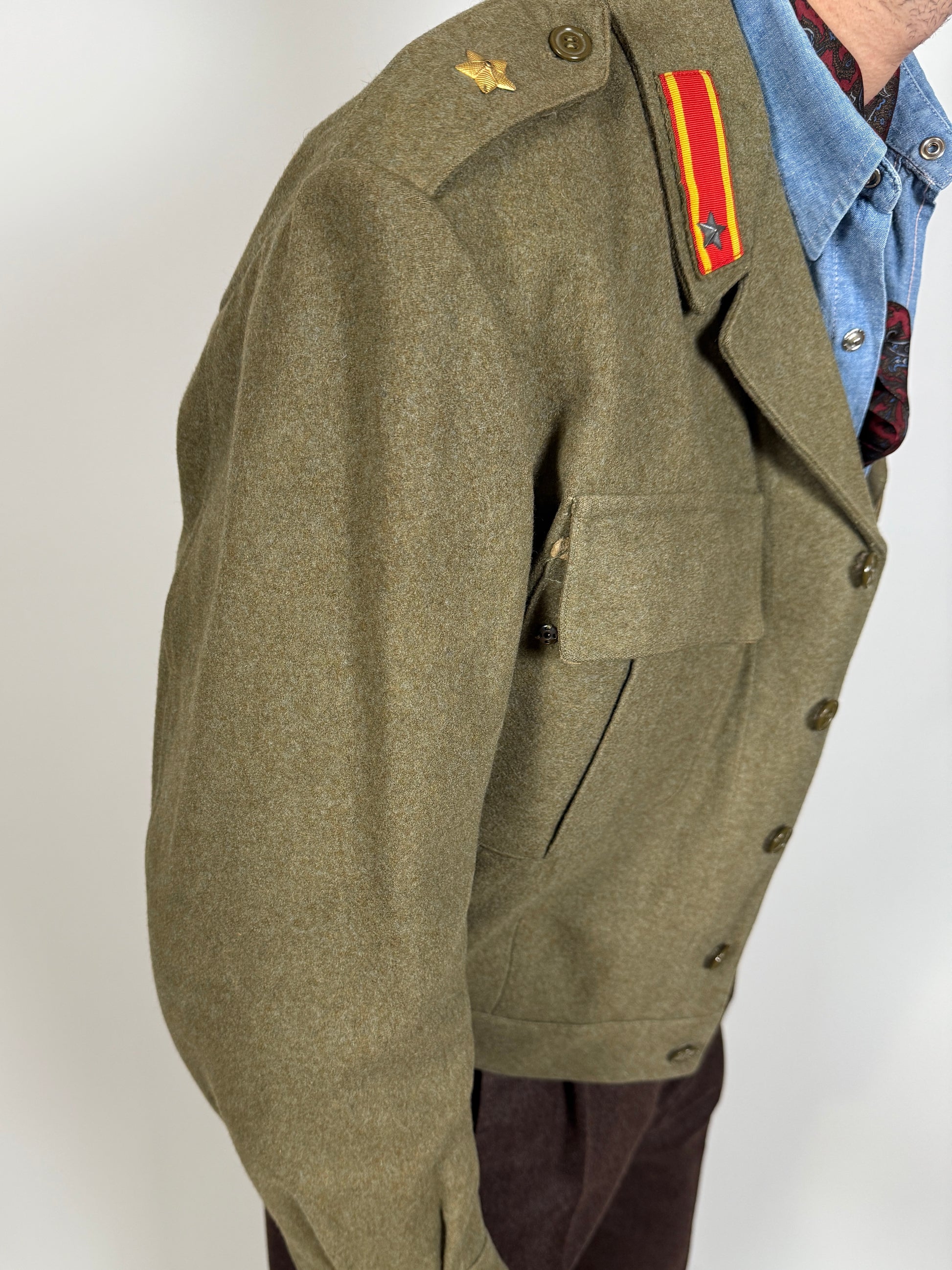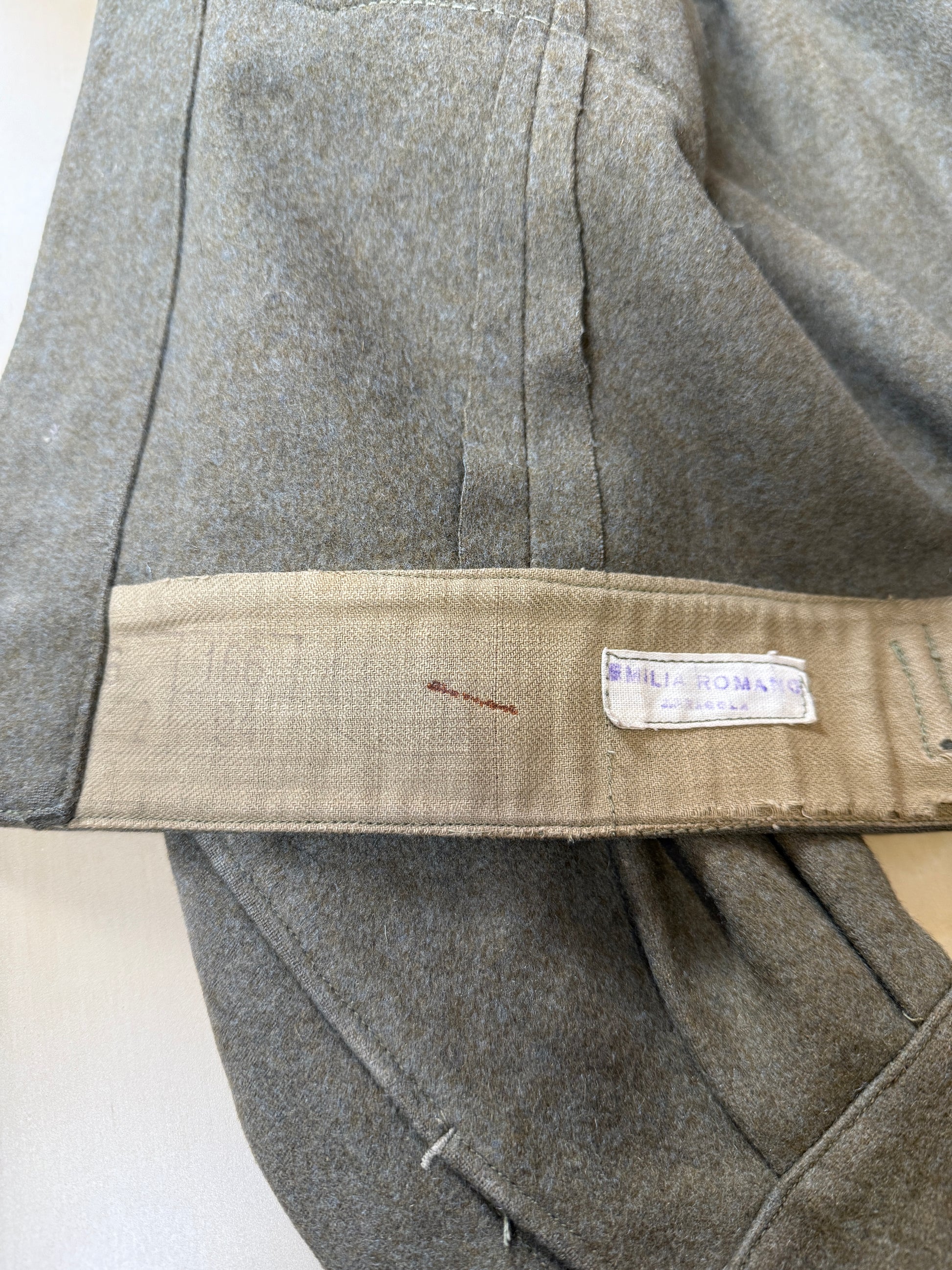 Il tessuto è il tipico e pesante panno da truppa 100% lana color verde oliva, un colore dalle sfumature molto calde e stupende.