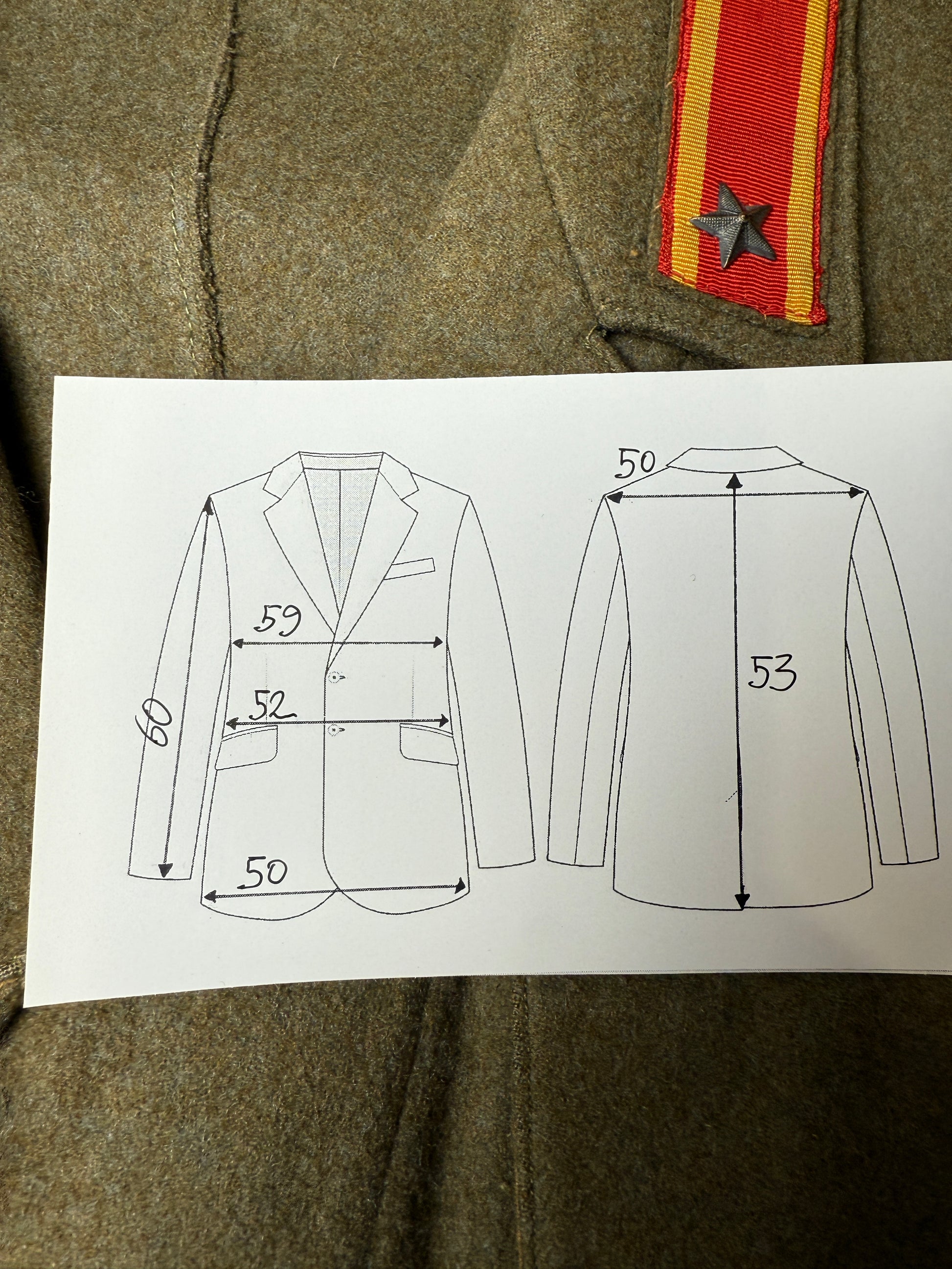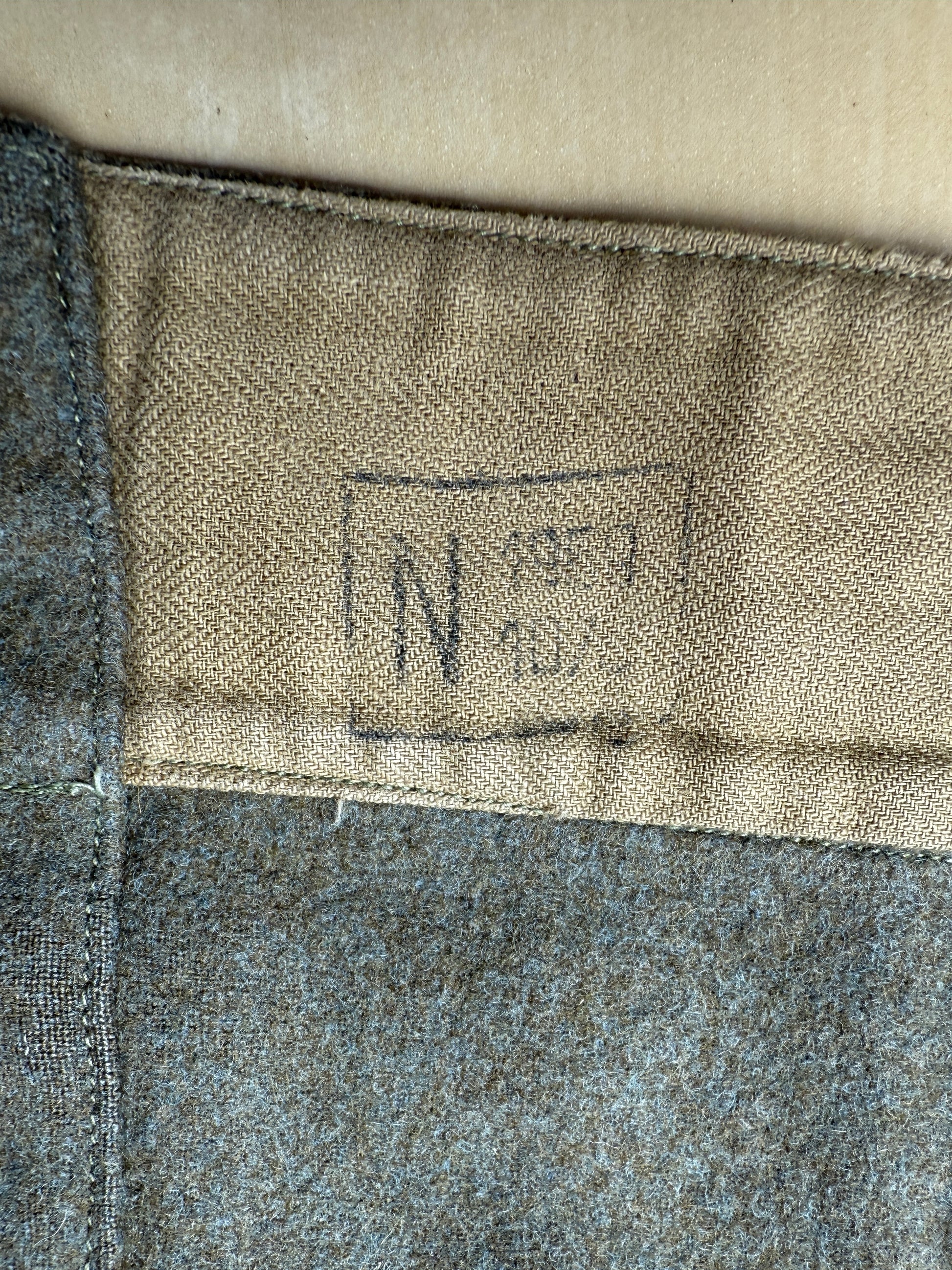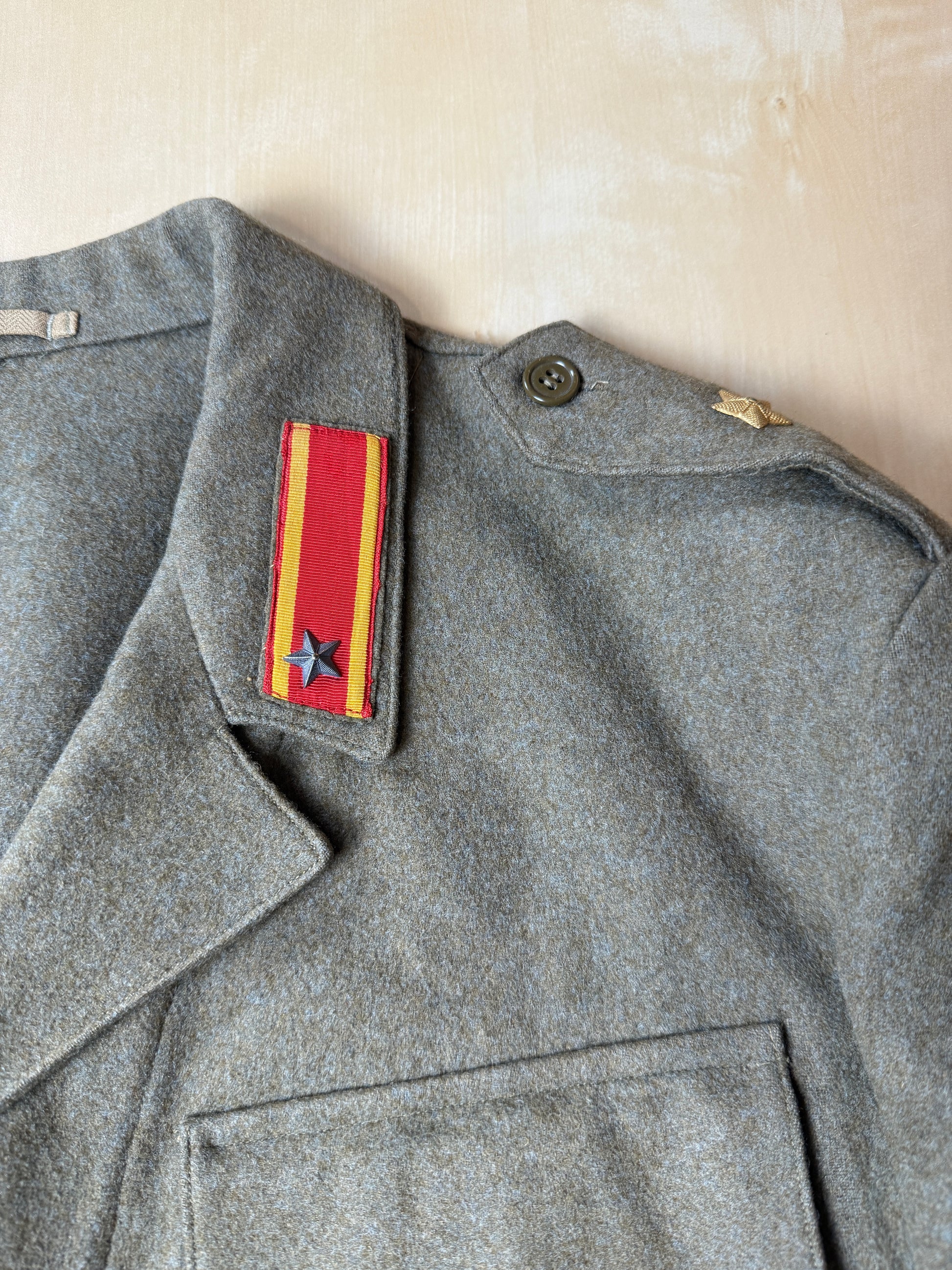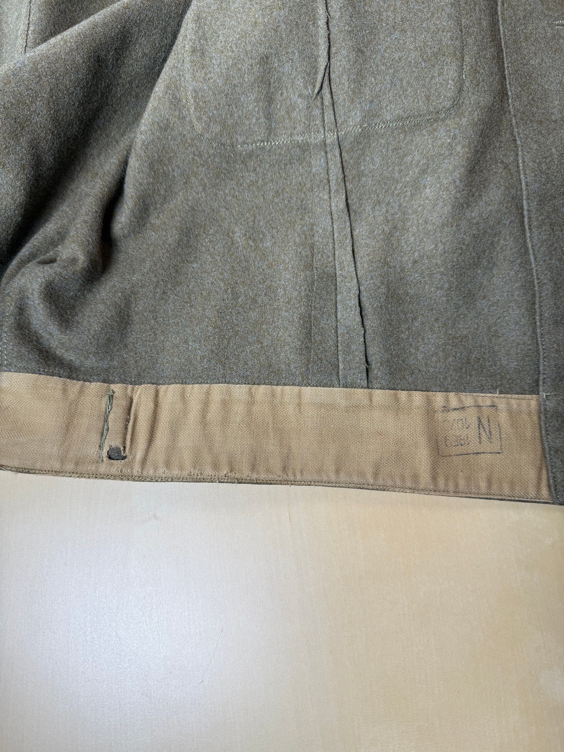 Il tessuto è il tipico e pesante panno da truppa 100% lana color verde oliva, un colore dalle sfumature molto calde e stupende.