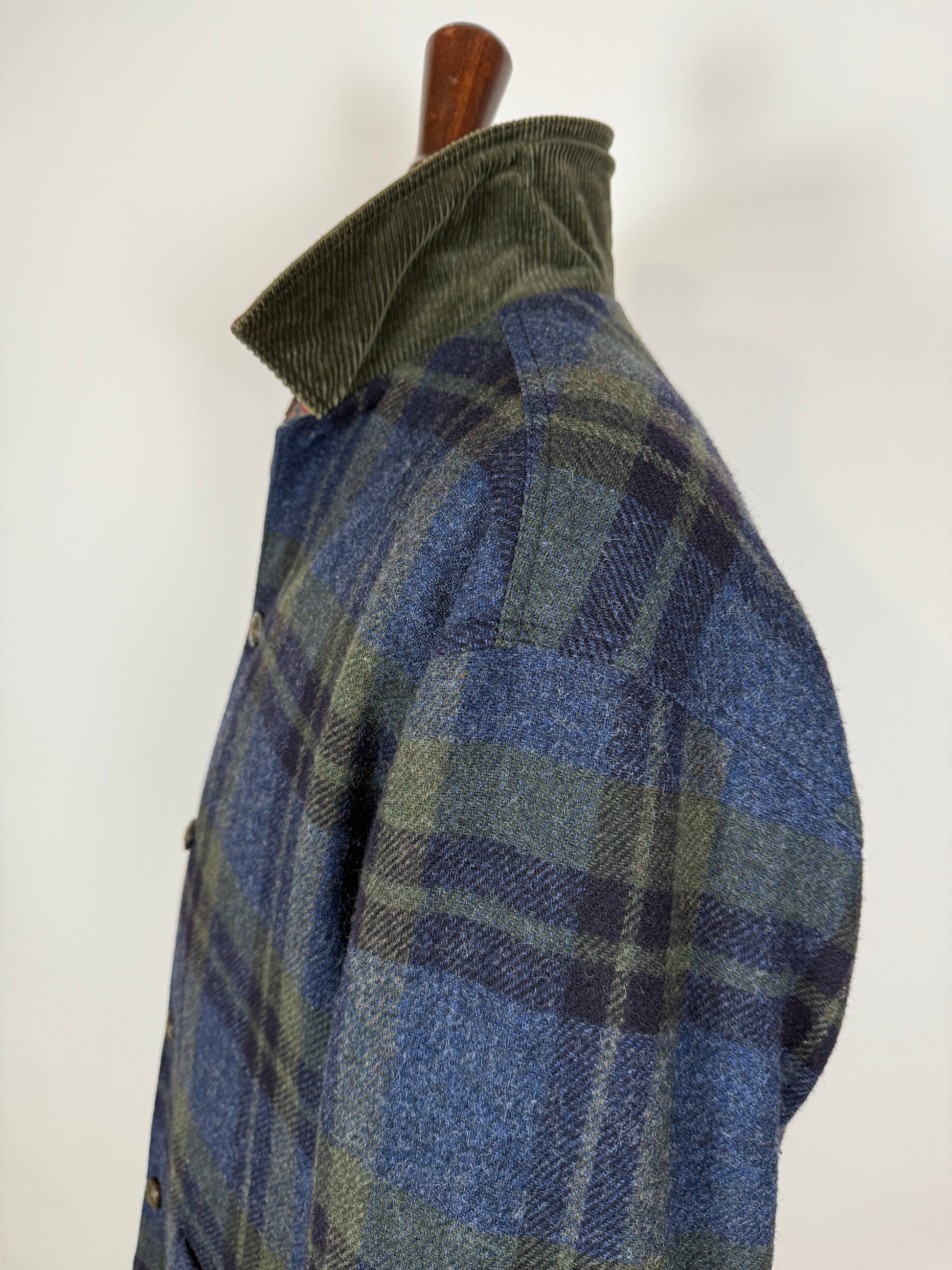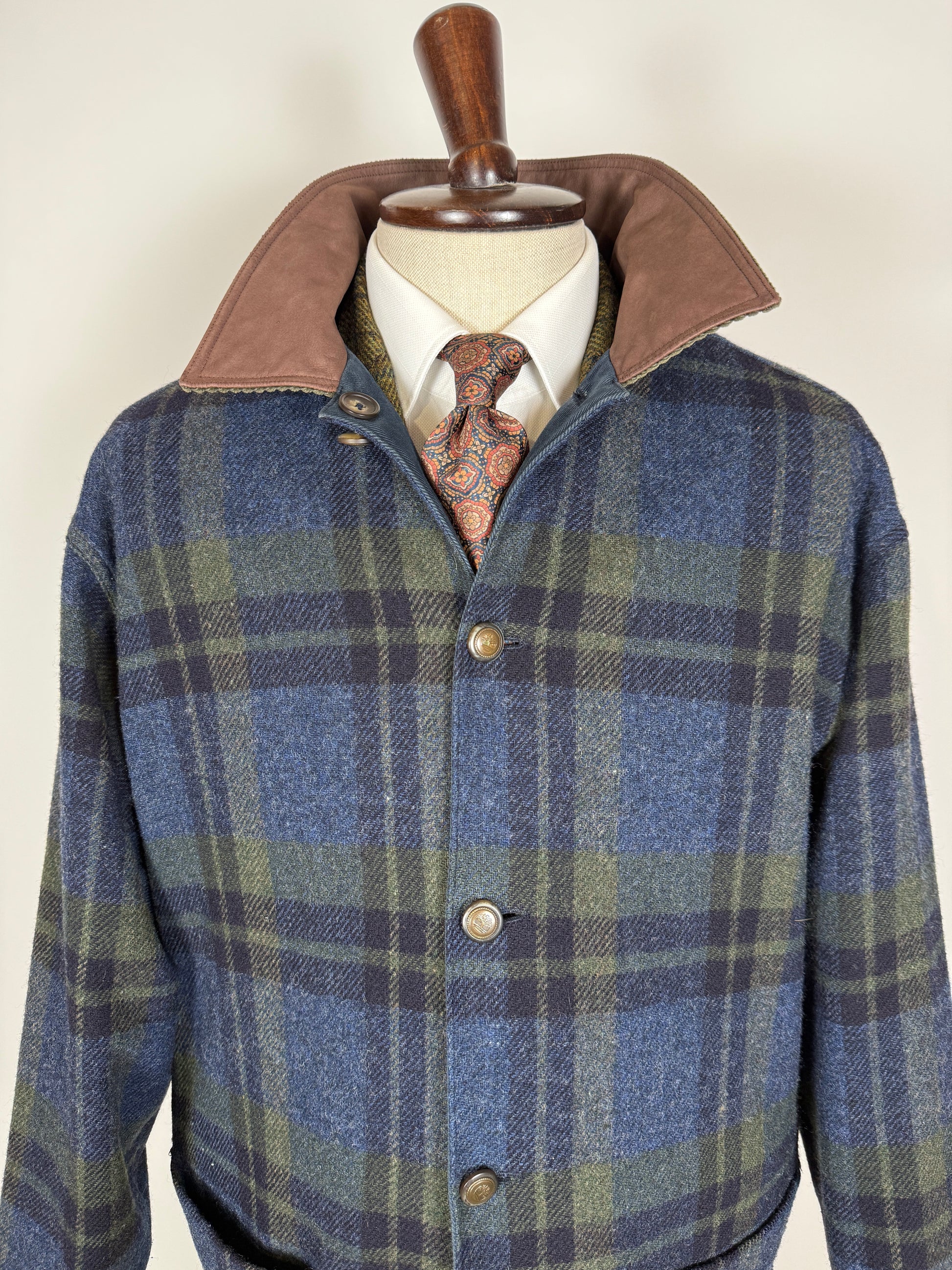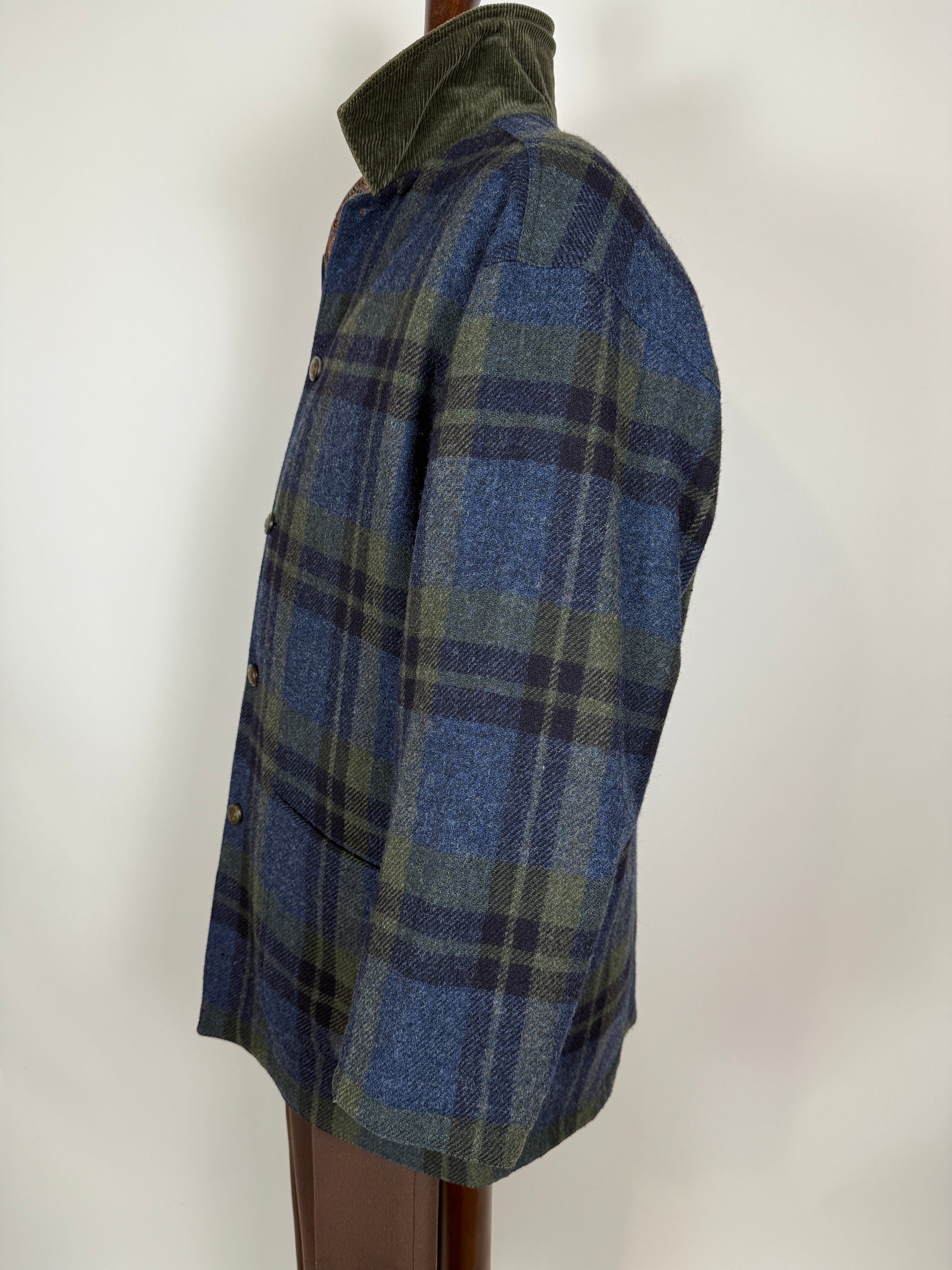 Double face: un lato è in 85% lana e 15% nylon con bella fantasia tartan verde e blu, l'altro lato in twill 100% cotone blu navy, con logo ricamato.