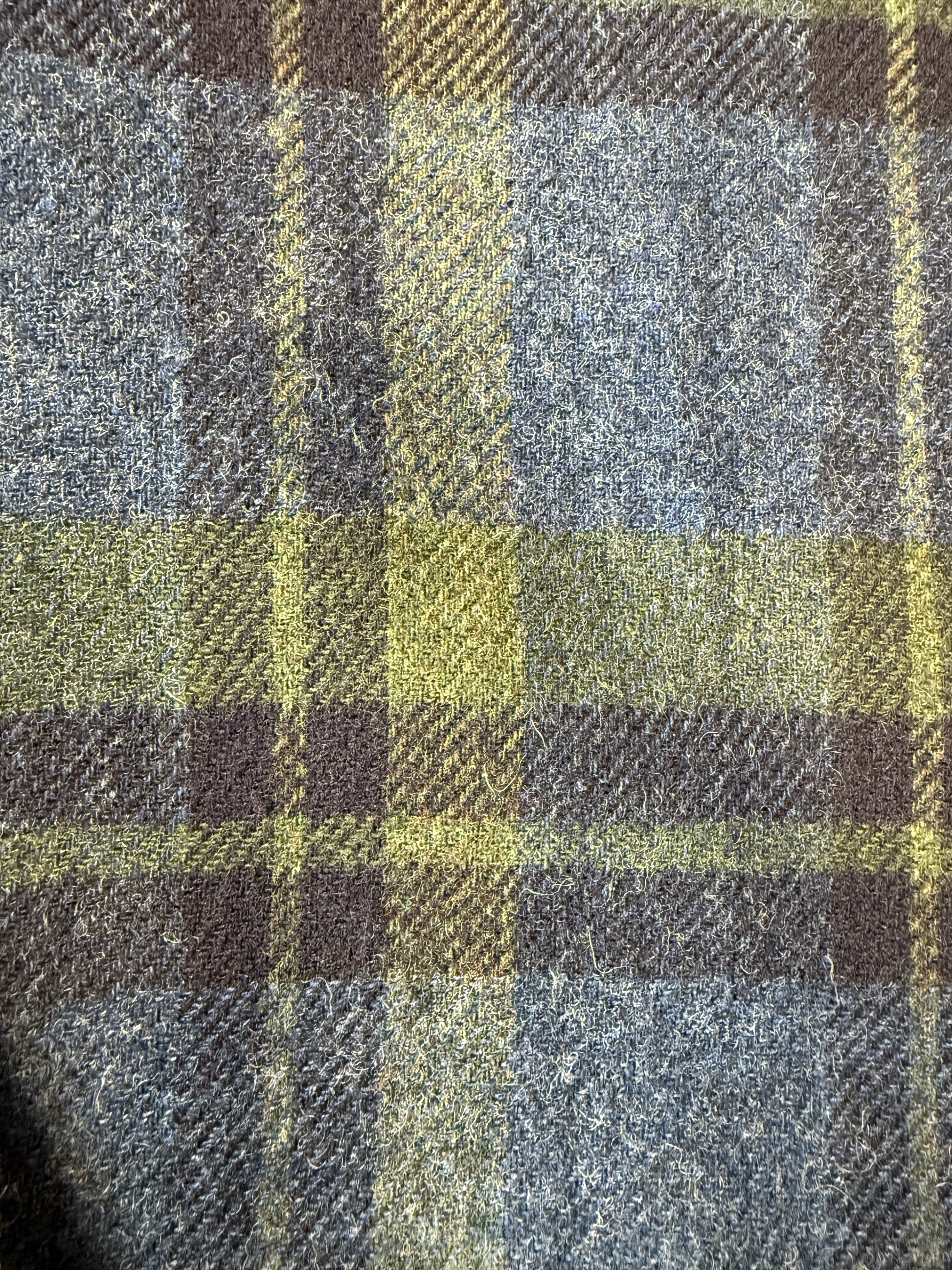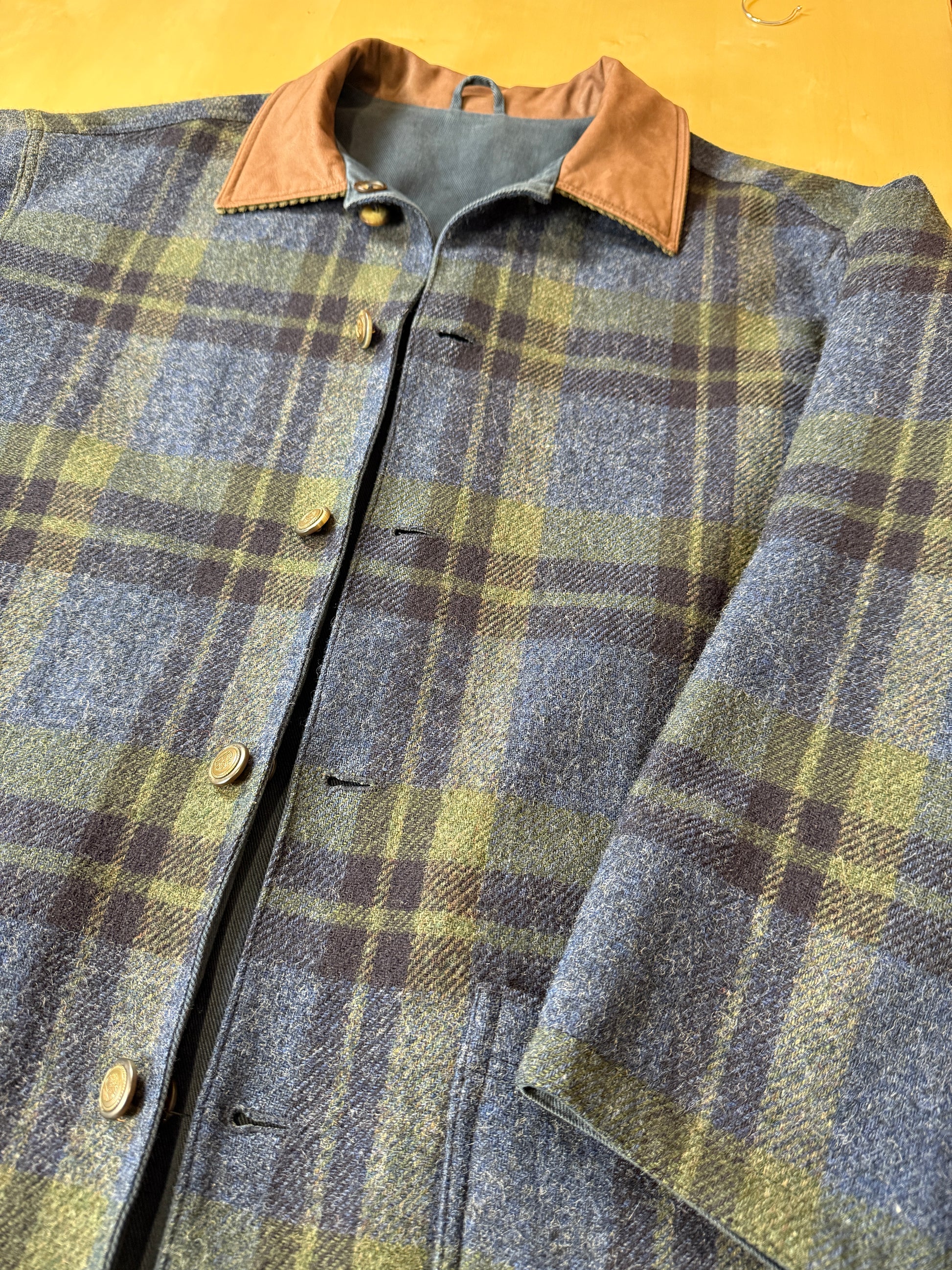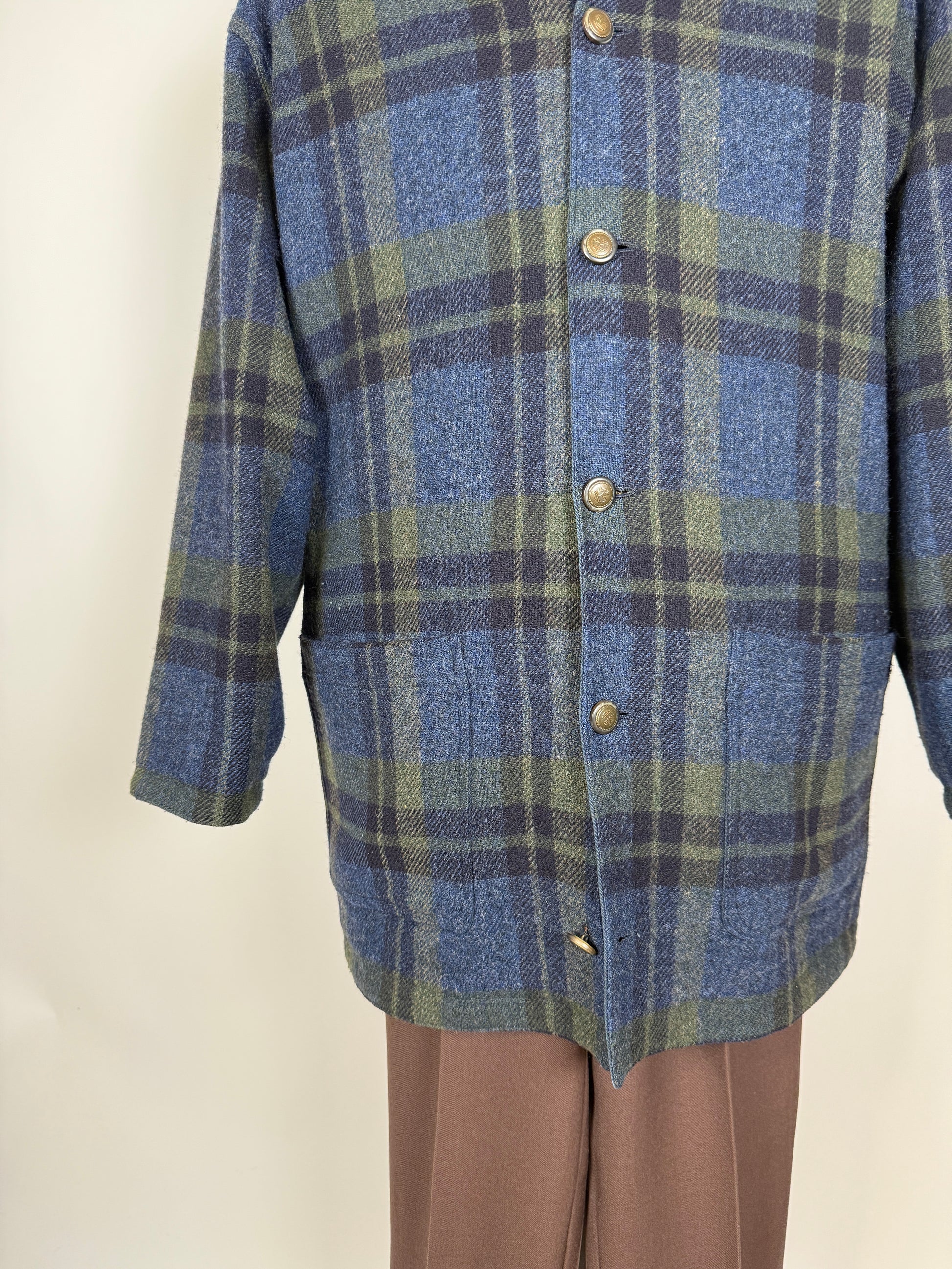 Double face: un lato è in 85% lana e 15% nylon con bella fantasia tartan verde e blu, l'altro lato in twill 100% cotone blu navy, con logo ricamato.