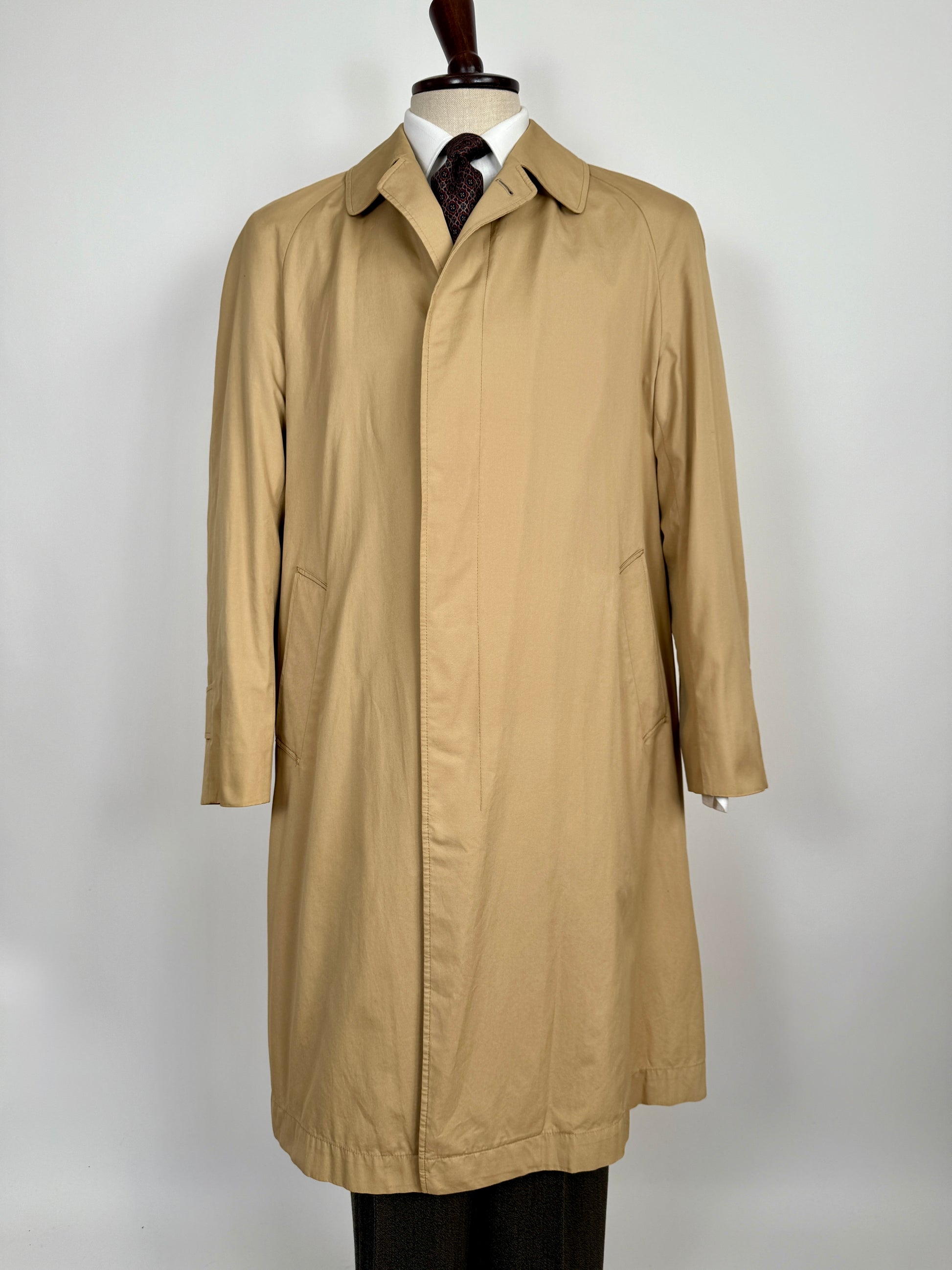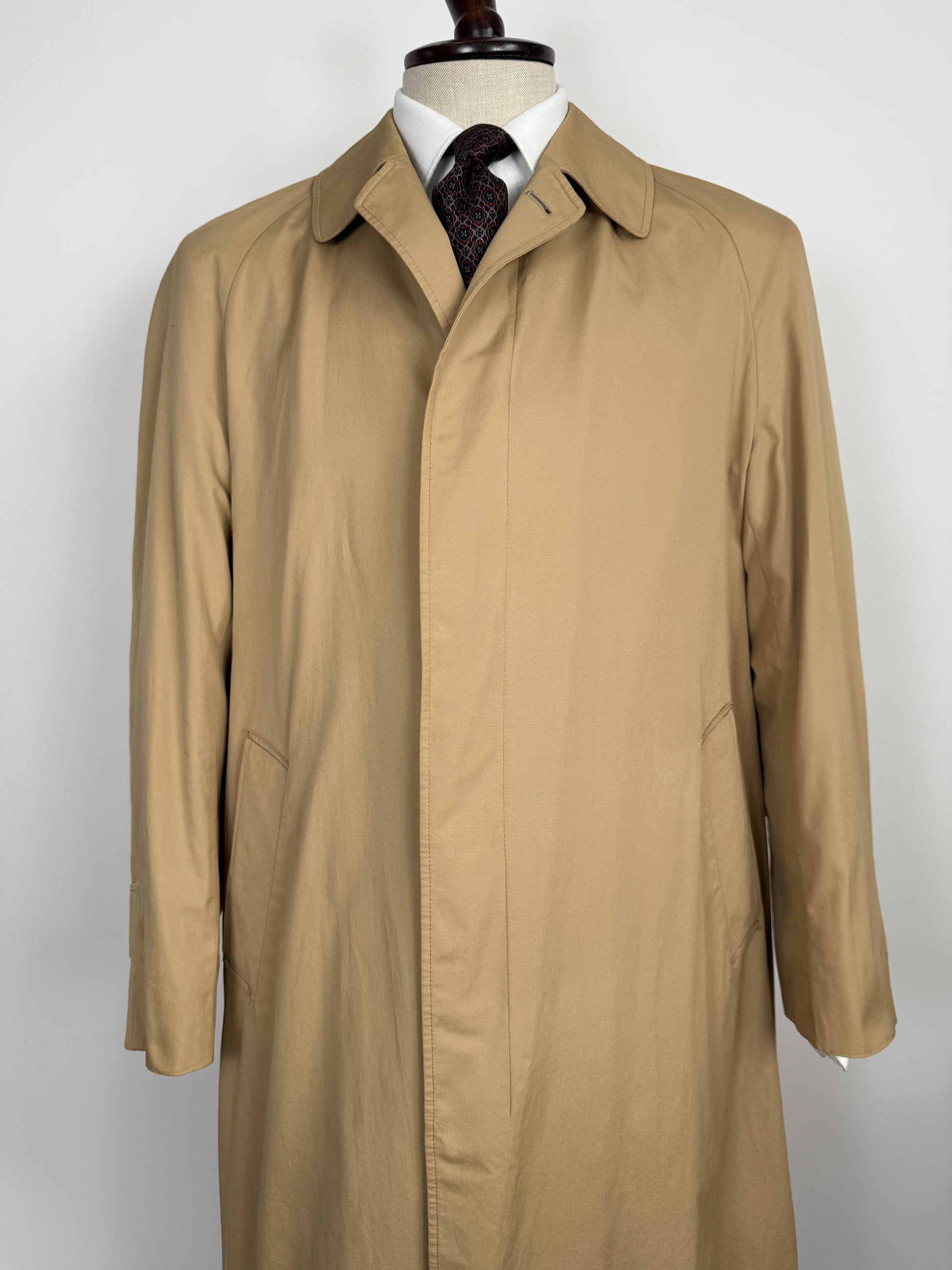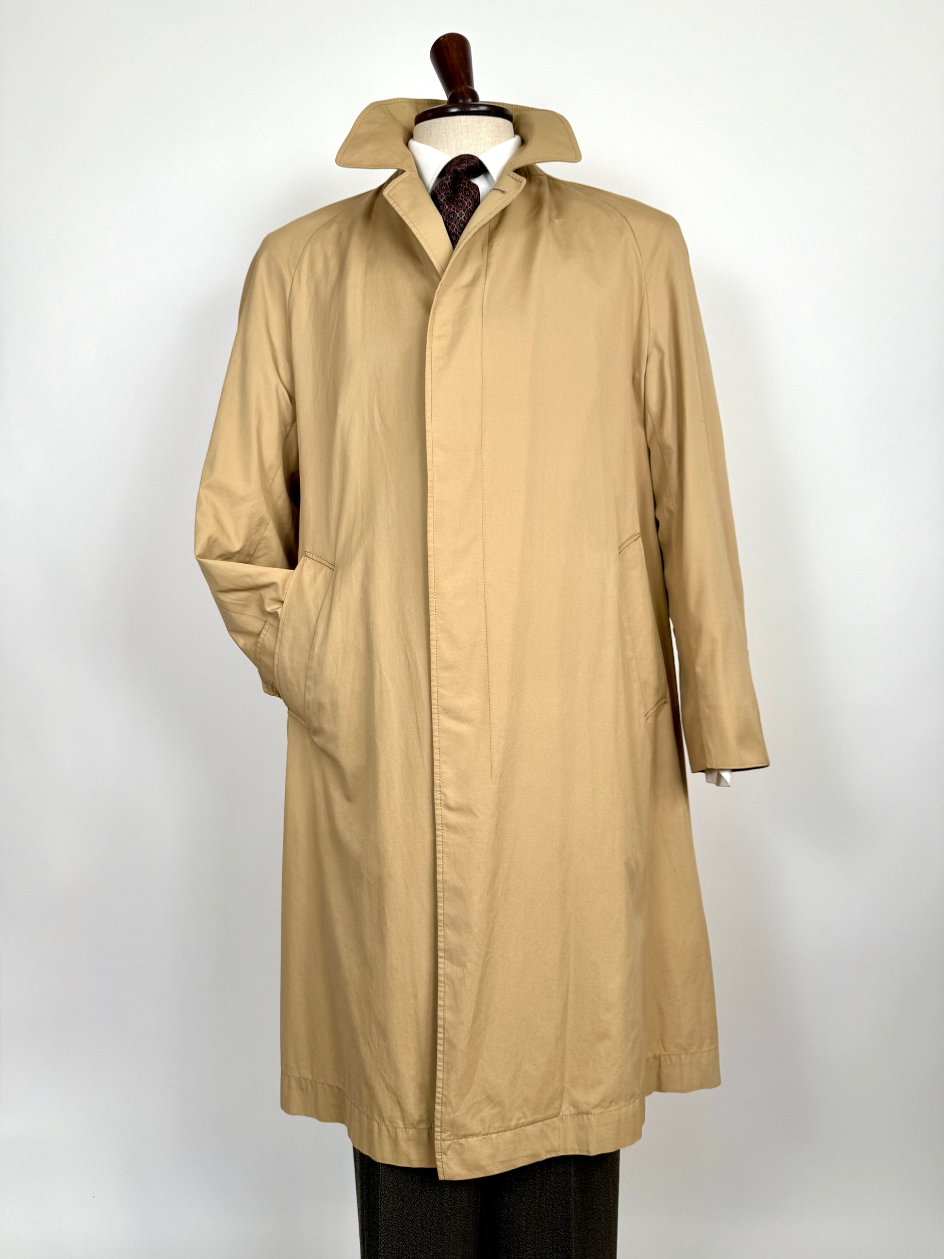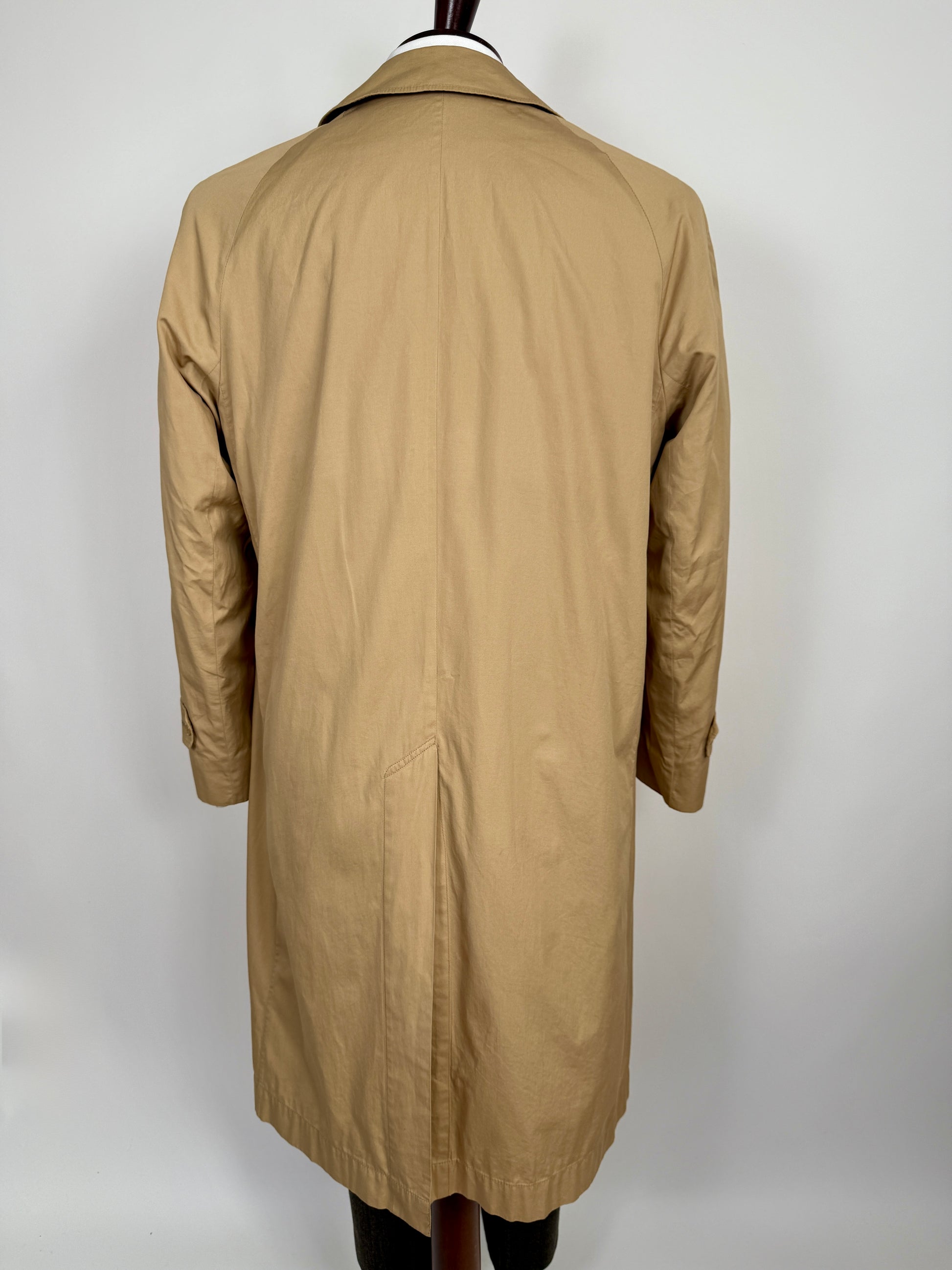 Taglio classico inglese da impermeabile raglan monopetto, con bottoni nascosti, e comodissime aperture tradizionali in corrispondenza delle tasche, che permettono di raggiungere le tasche di giacca e pantaloni senza sbottonare il soprabito.