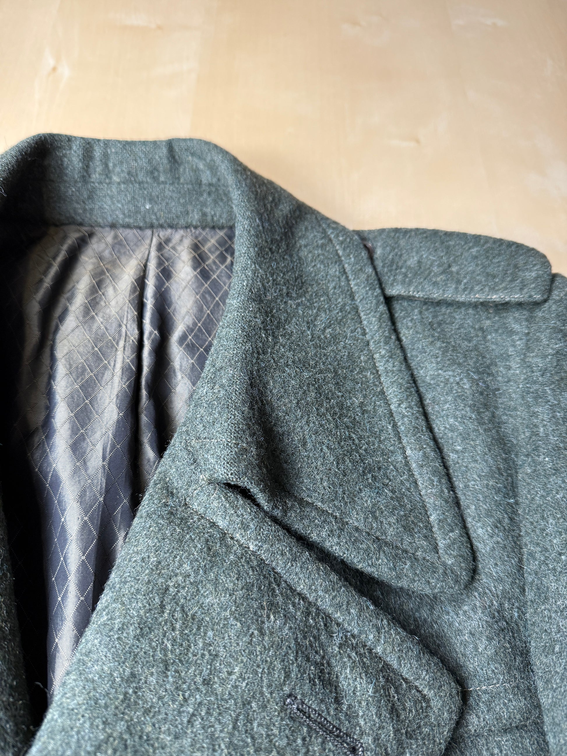 Tessuto panno loden nel classico verde, composizione pura lana o forse lana con piccola percentuale sintetica (non più presente l’etichetta di composizione).