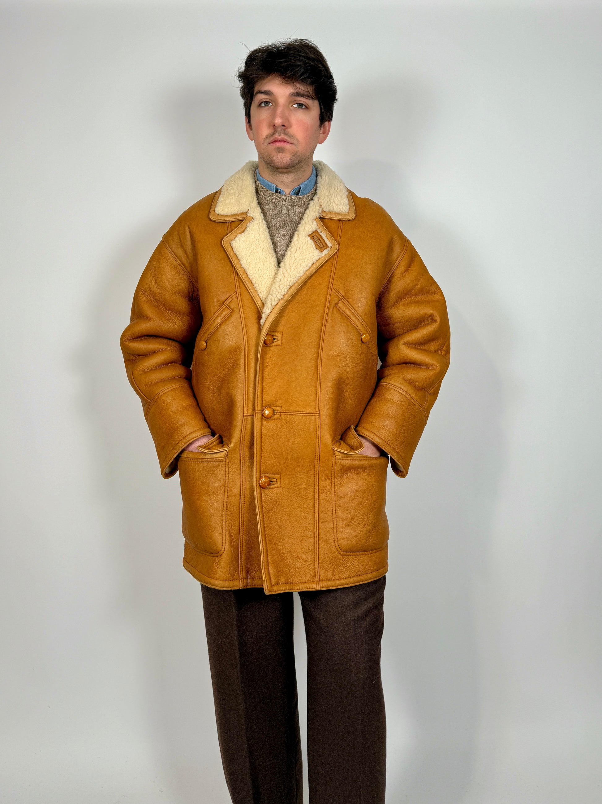 Stupendo giaccone anni ‘70/‘80 in shearling originale: vera pelle di montone, con la sua lana naturale all’interno. Color miele/marrone chiaro.