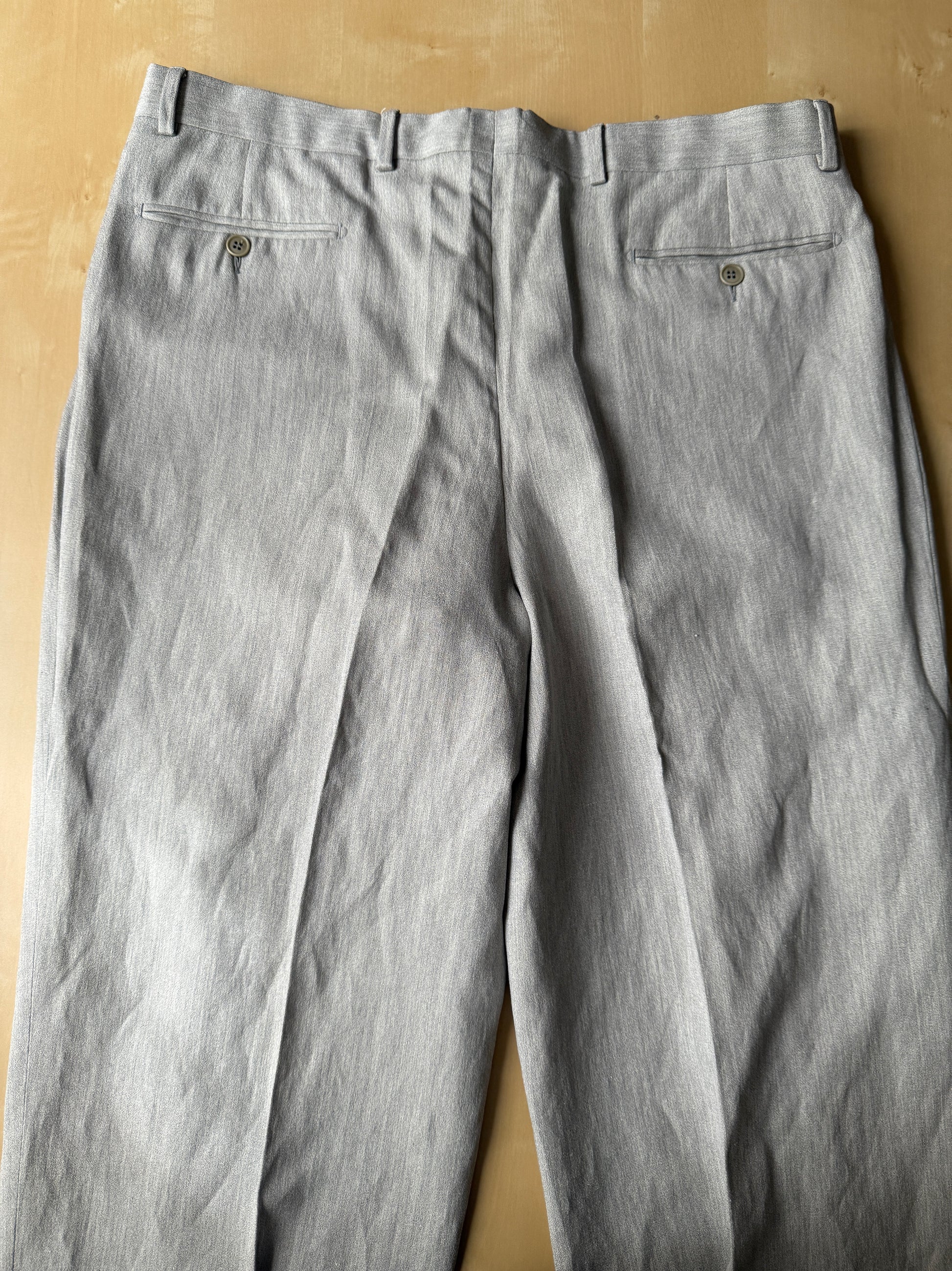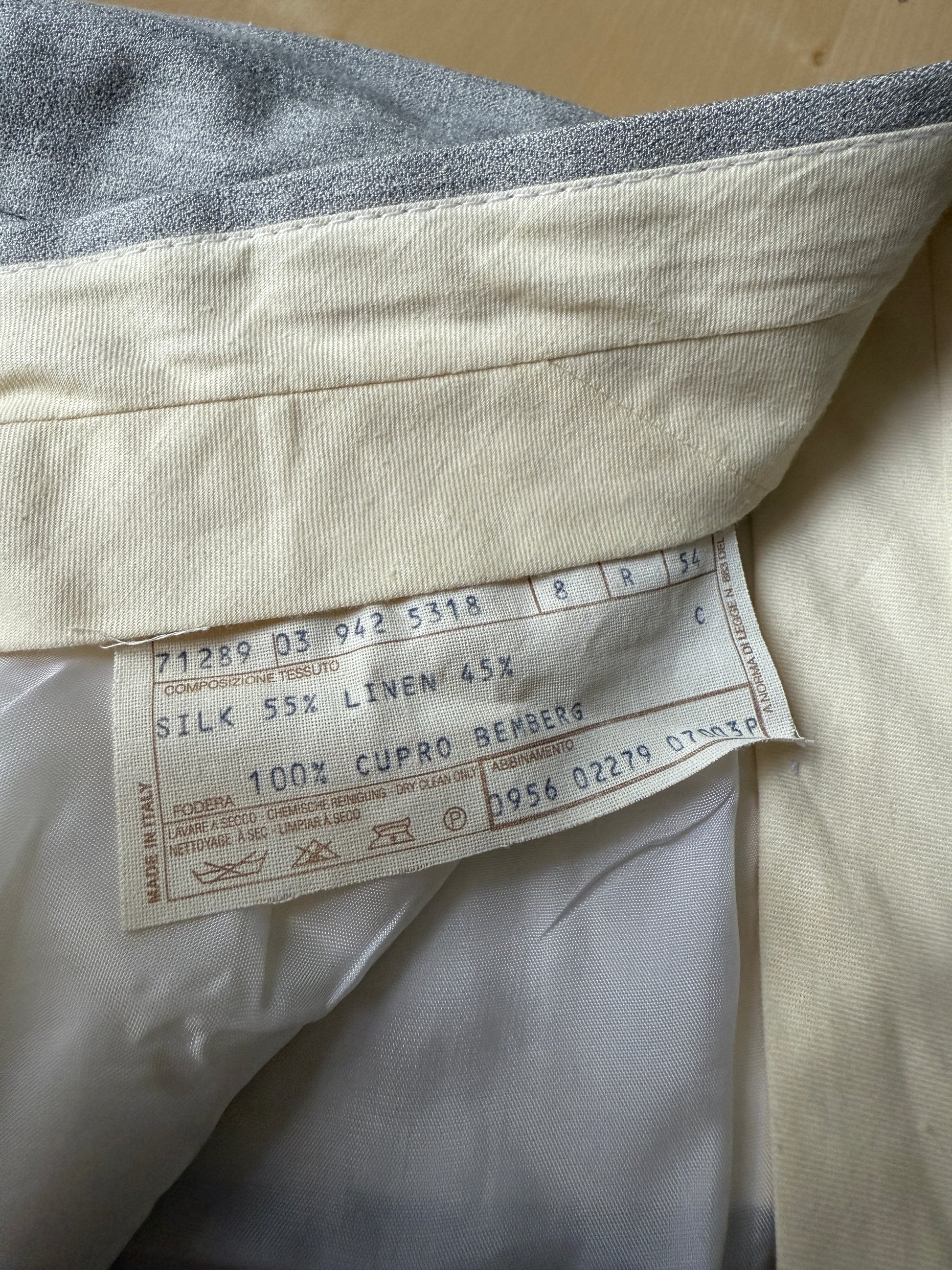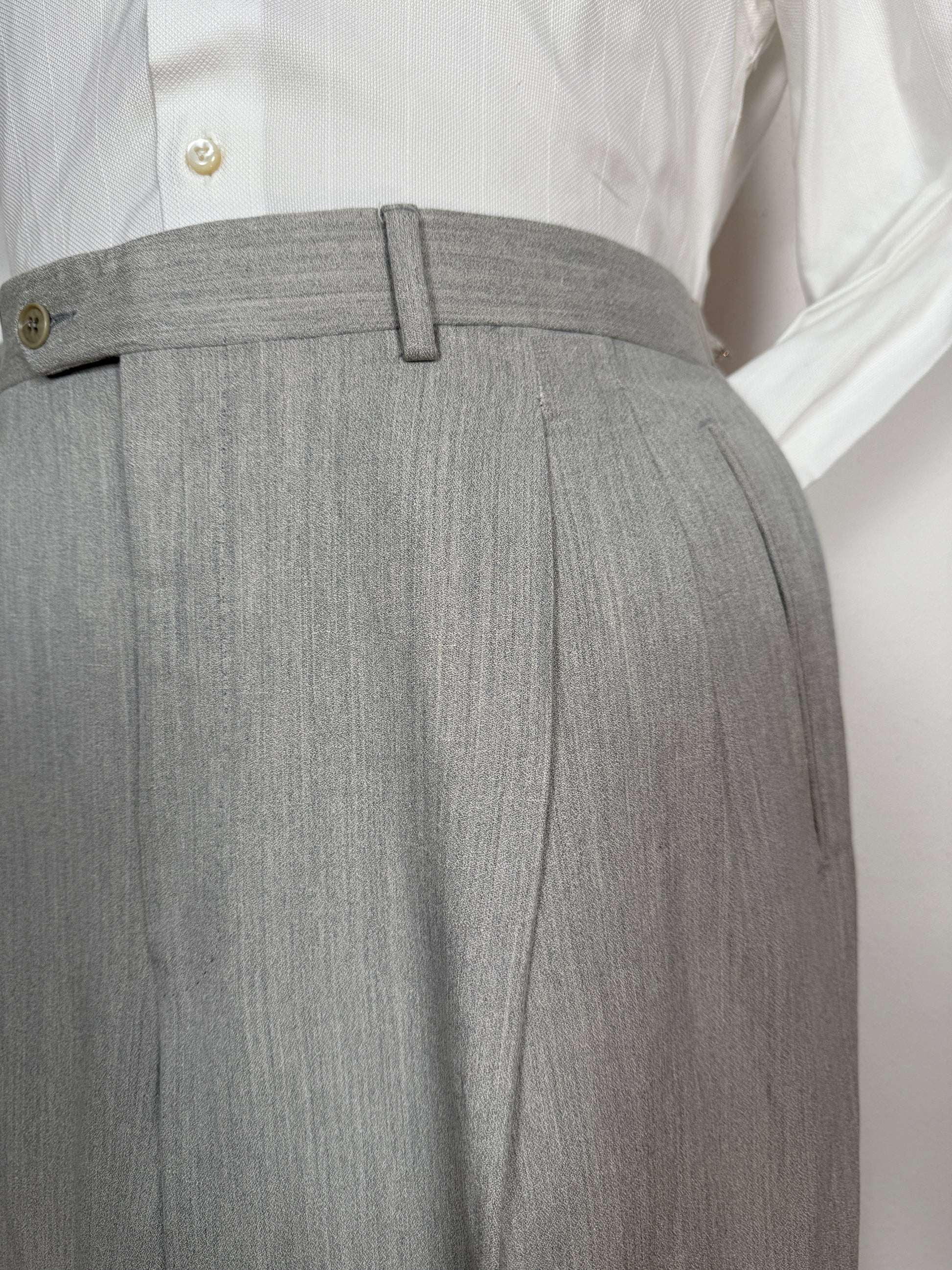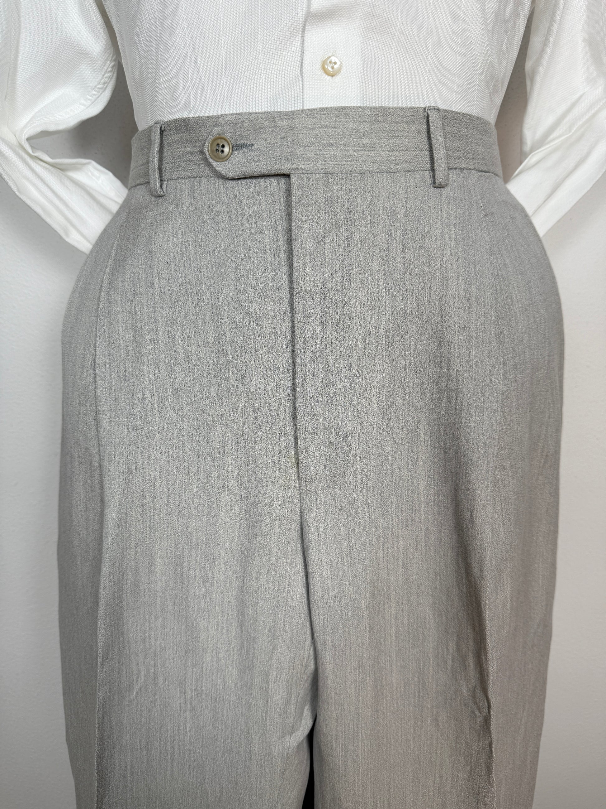 Splendido completo 2 pezzi anni '80 composto da panciotto e pantalone, in tessuto estivo 55% seta e 45% lino, colore grigio chiaro/argento mélange.