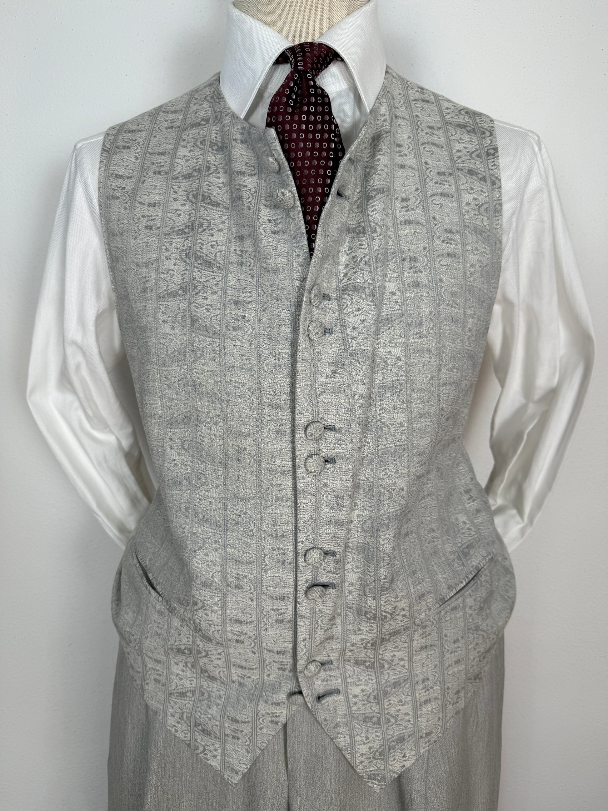 Il panciotto ha un particolare taglio con scollo alto a girocollo, e chiusura a 5 coppie di due bottoni foderati in tessuto. Tessuto con bellissima lavorazione damascata a jacquard, con pattern a righe verticali.