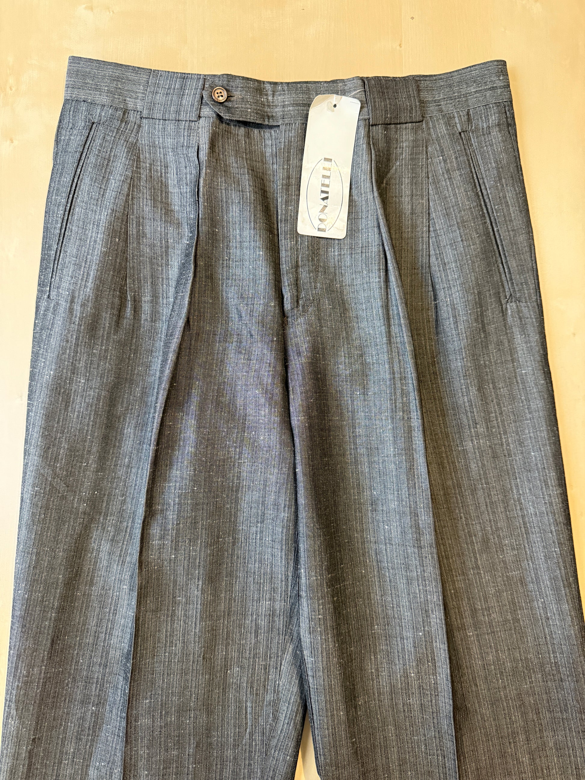 Pantalone anni ‘80 nuovo da fondo di magazzino, in tessuto estivo 90% viscosa e 10% lino. Colore grigio con trama a righe/quadri.