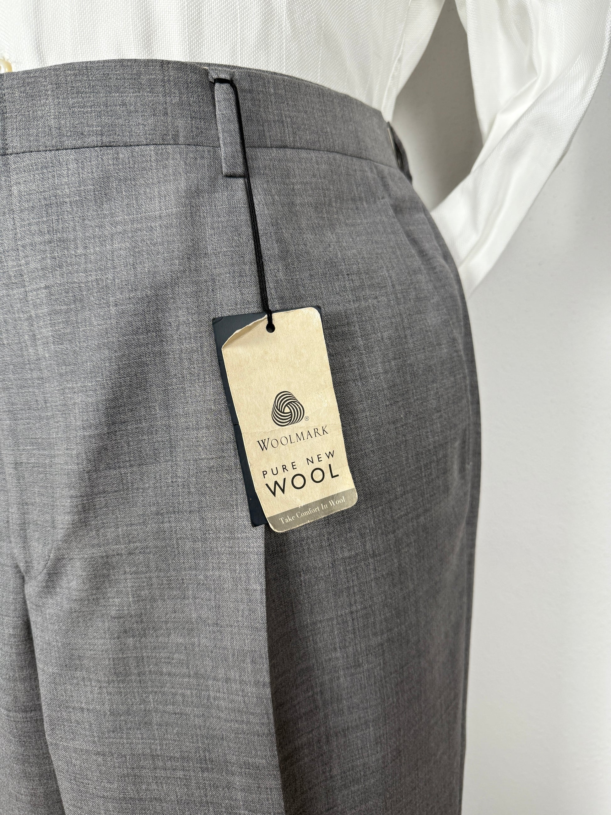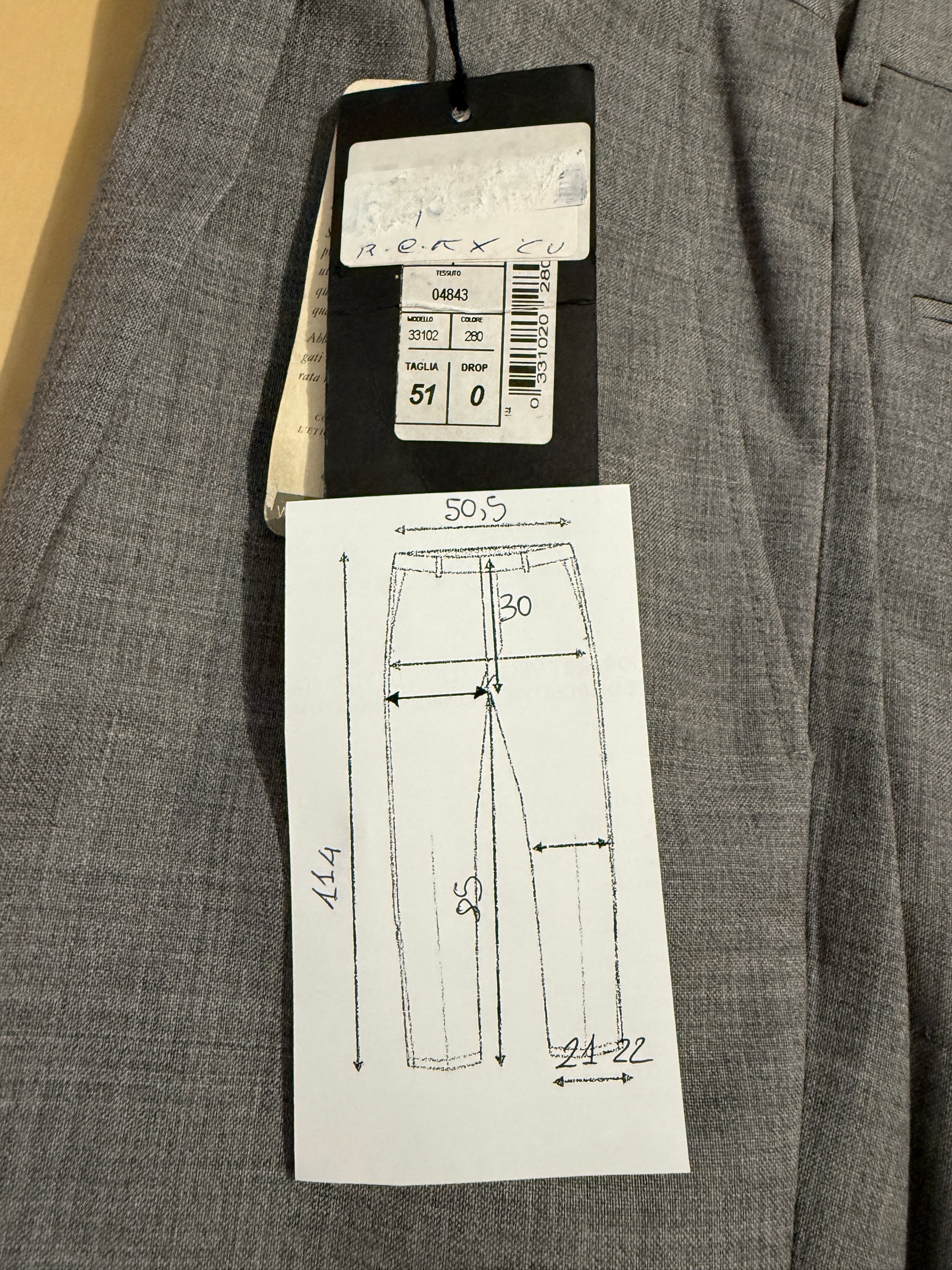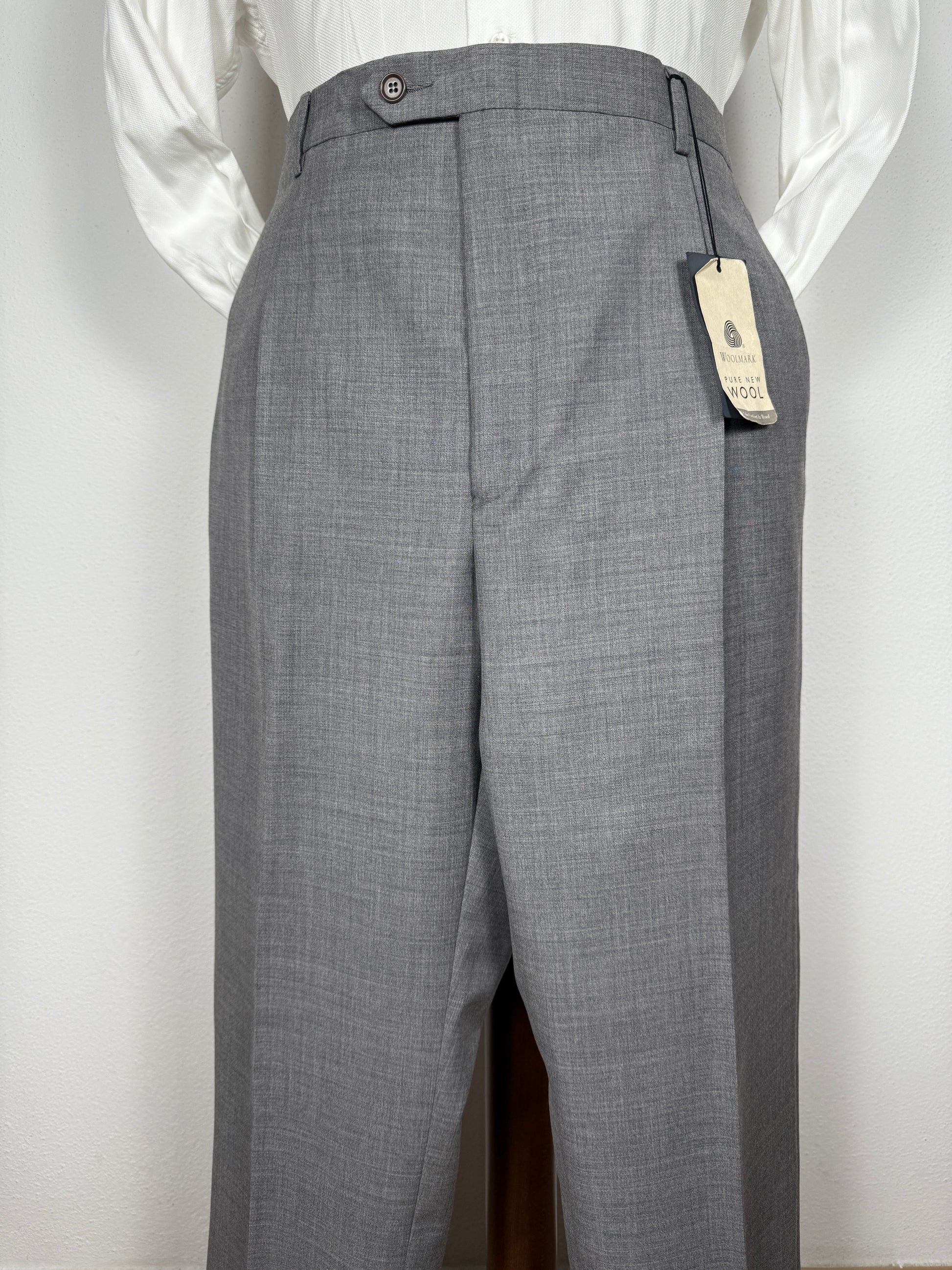 Pantalone estivo in 100% fresco lana, da fondo di magazzino anni ‘90, perfettamente nuovo e mai indossato. Colore grigio medio-chiaro.