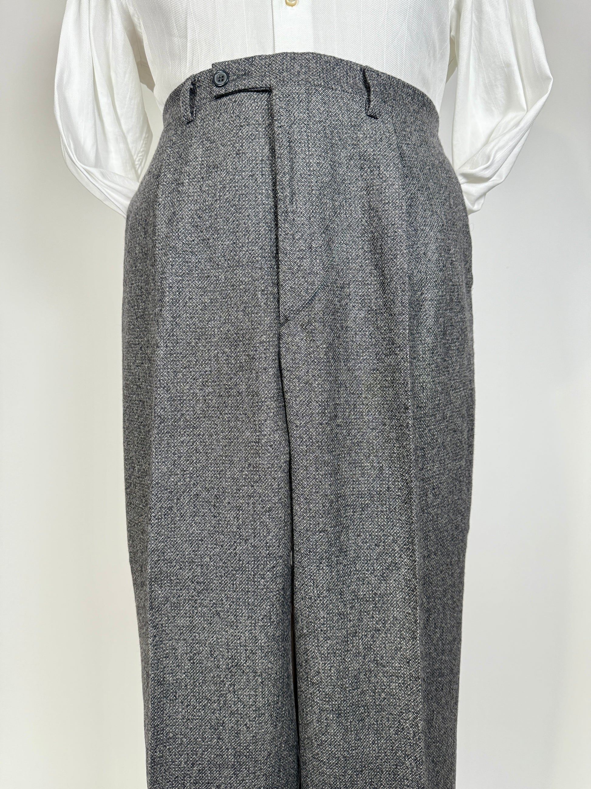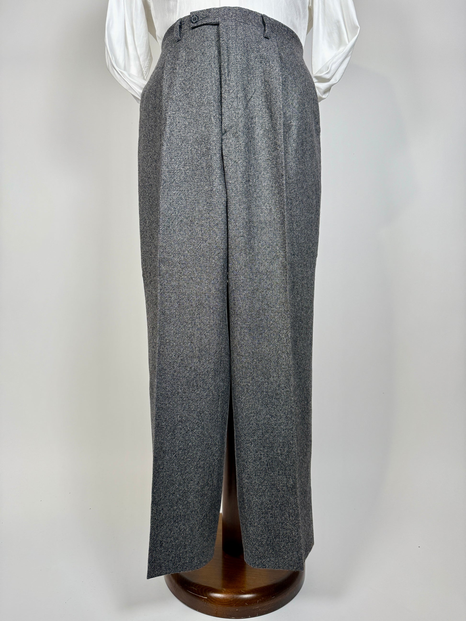 Pantaloni di confezione anni '70/'80 realizzati con una morbidissima e pesante flanella 100% lana, grigio medio con lavorazione sale-pepe.