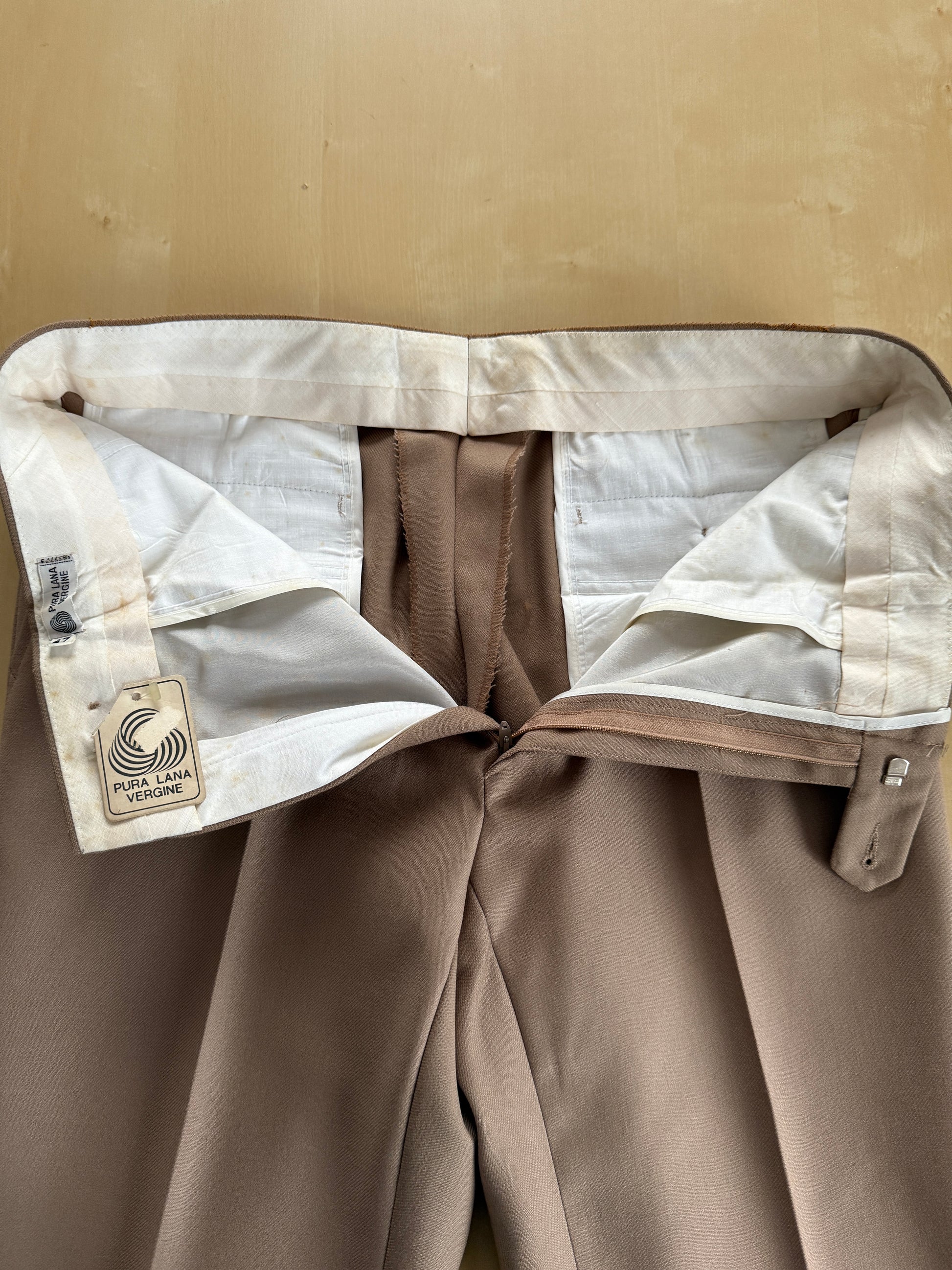 Pantaloni anni ‘70 da vecchio fondo di magazzino, in condizioni di nuovo con cartellino e orlo di fondo ancora da tagliare.